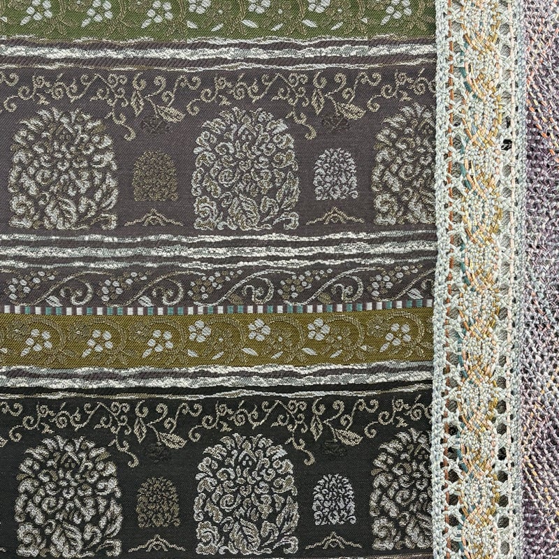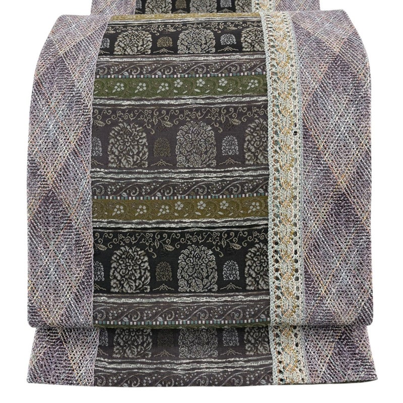 セミフォーマルでお使いいただける袋帯でございます。 見る人に重たい印象を感じさせない女性ならではの、気品豊かな一品です。 帯芯が入っておりません。 締め跡がございます。 ※商品の仕立て上、手先と垂先の織り出し口から裏地がはみ出ております。 リユース品としては良い状態で、まだまだご活用頂けると思われます。 ※なお、厳しく商品の状態確認を行っておりますが、記載の汚れ以外にも見落とし箇所がある可能性がある旨ご了承いただけますと幸いです。 沢山の商品の中からご覧いただき誠にありがとうございます。