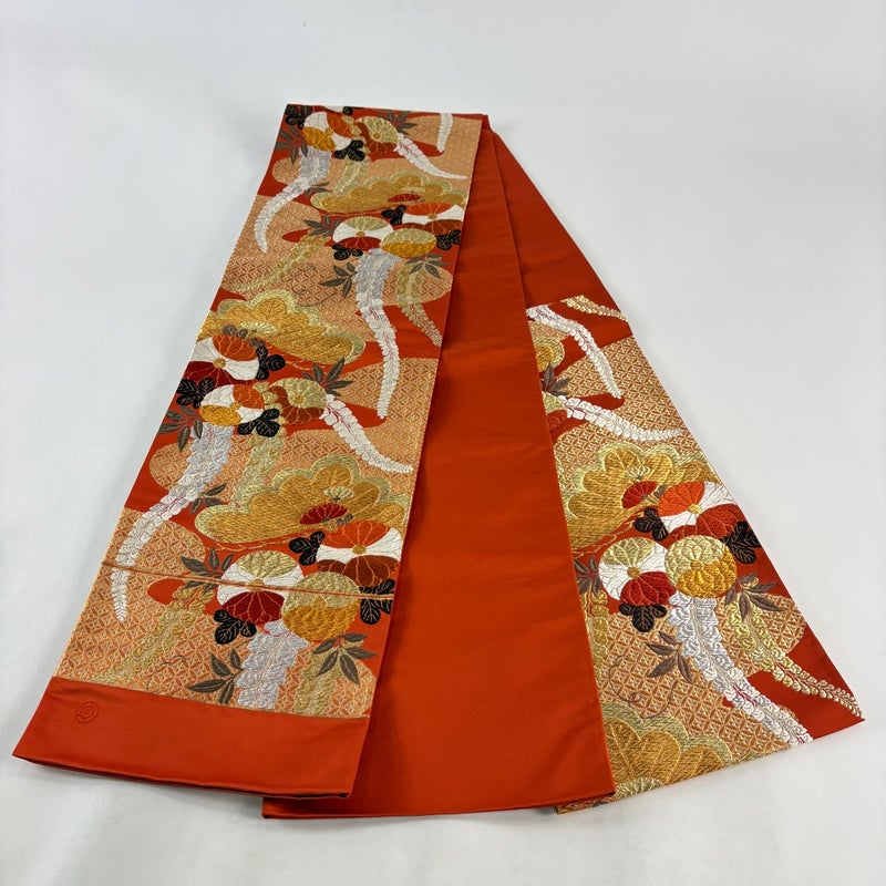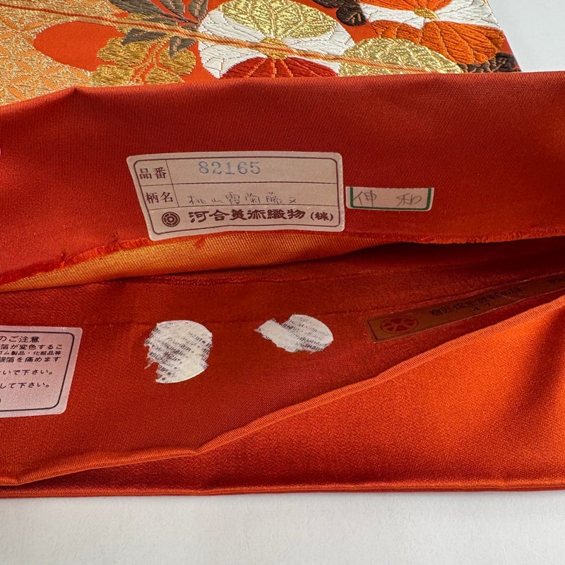 唐織の技術に長けた西陣の老舗、「河合美術織物」の作品です。 おめでたい席に相応しい意匠の袋帯でございます。 格式高いお席にもお使いいただけますので、お見逃しのないようお願いいたします。 締め跡がございます。 リユース品としては目立った染み傷なく、状態の良いお品でございます。 ※なお、厳しく商品の状態確認を行っておりますが、記載の汚れ以外にも見落とし箇所がある可能性がある旨ご了承いただけますと幸いです。 沢山の商品の中からご覧いただき誠にありがとうございます。
