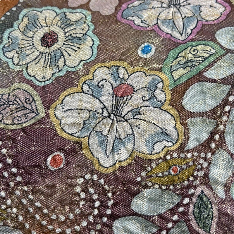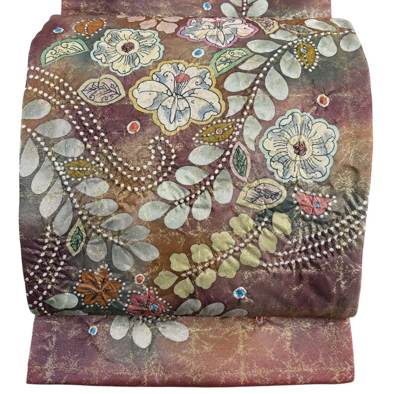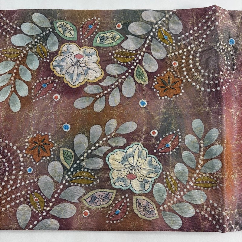セミフォーマルでお使いいただける袋帯でございます。 見る人に重たい印象を感じさせない女性ならではの、気品豊かな一品です。 締め跡がございます。 手先前柄間などに生地のヨレがございます。 リユース品としては目立った染み傷なく、状態の良いお品でございます。 ※なお、厳しく商品の状態確認を行っておりますが、記載の汚れ以外にも見落とし箇所がある可能性がある旨ご了承いただけますと幸いです。 沢山の商品の中からご覧いただき誠にありがとうございます。