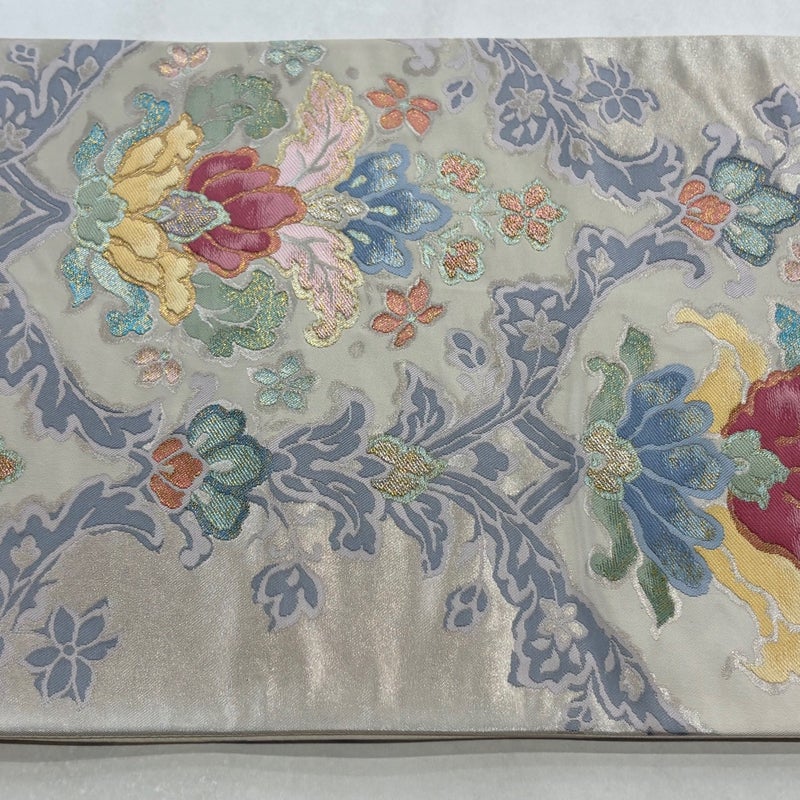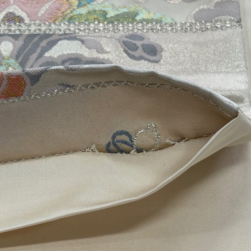 セミフォーマルでお使いいただける袋帯でございます。 見る人に重たい印象を感じさせない女性ならではの、気品豊かな一品です。 垂先に糸つれがございます。 ※締め跡がお太鼓を含む帯全体にございます。 リユース品としては良い状態で、まだまだご活用頂けると思われます。 ※なお、厳しく商品の状態確認を行っておりますが、記載の汚れ以外にも見落とし箇所がある可能性がある旨ご了承いただけますと幸いです。 沢山の商品の中からご覧いただき誠にありがとうございます。 ※垂先が開いております。予めご了承くださいませ。