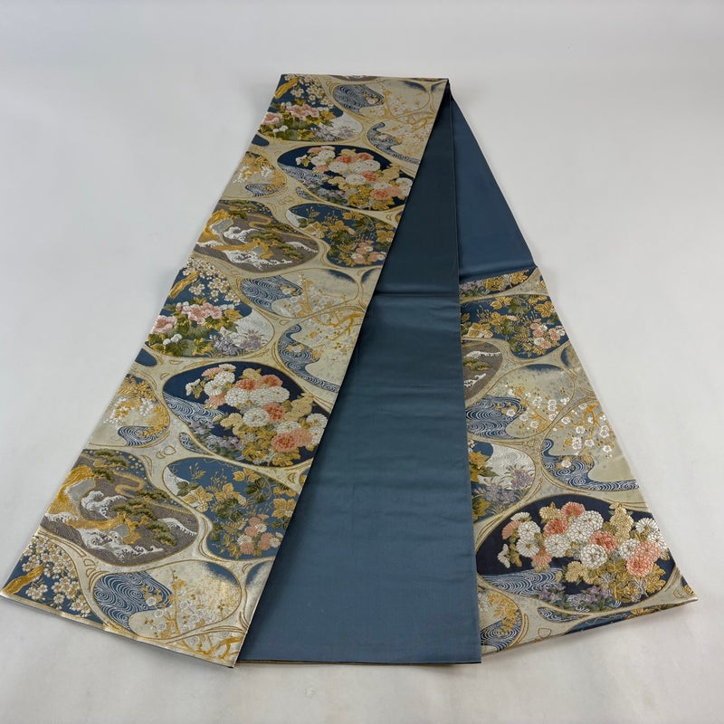 【美品】 袋帯 秀品 琳派流水紋 菊 流水 金銀糸 箔 青灰色 六通 正絹