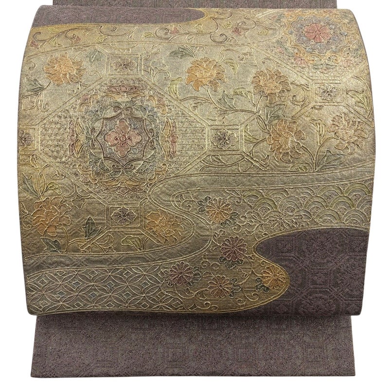 セミフォーマルでお使いいただける袋帯でございます。 見る人に重たい印象を感じさせない女性ならではの、気品豊かな一品です。 締め跡がございます。 リユース品としては目立った染み傷なく、状態の良いお品でございます。 ※なお、厳しく商品の状態確認を行っておりますが、記載の汚れ以外にも見落とし箇所がある可能性がある旨ご了承いただけますと幸いです。 沢山の商品の中からご覧いただき誠にありがとうございます。