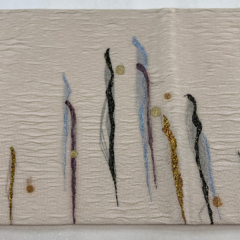 夏帯でございます。 セミフォーマルでお使いいただける袋帯でございます。 見る人に重たい印象を感じさせない女性ならではの、気品豊かな一品です。 締め跡がございます。 表地所々に糸のほつれがございます。 裏地所々に点シミがございます。 リユース品としては良い状態で、まだまだご活用頂けると思われます。 ※なお、厳しく商品の状態確認を行っておりますが、記載の汚れ以外にも見落とし箇所がある可能性がある旨ご了承いただけますと幸いです。 沢山の商品の中からご覧いただき誠にありがとうございます。