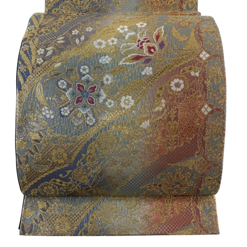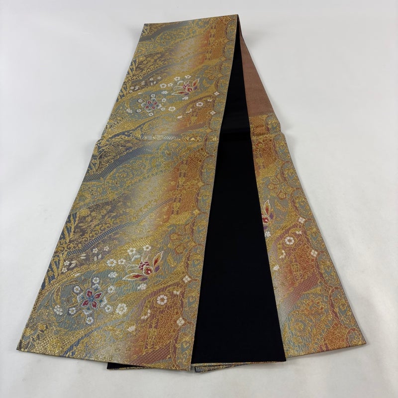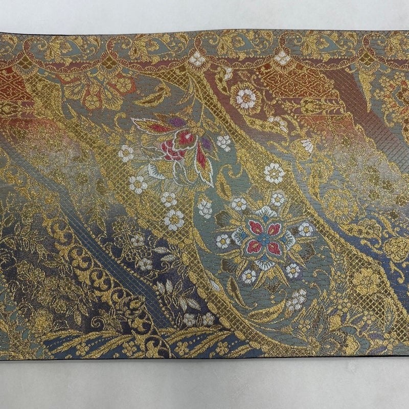 【美品】 袋帯 秀品 華文 草花 金糸 箔 灰緑 六通 正絹