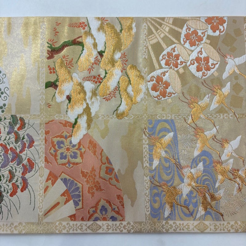 おめでたい席に相応しい意匠の袋帯でございます。 格式高いお席にもお使いいただけますので、お見逃しのないようお願いいたします。 締め跡がございます。 締め跡沿いに汚れがございます。 裏地所々にシミがございます。 リユース品としては良い状態で、まだまだご活用頂けると思われます。 ※なお、厳しく商品の状態確認を行っておりますが、記載の汚れ以外にも見落とし箇所がある可能性がある旨ご了承いただけますと幸いです。 沢山の商品の中からご覧いただき誠にありがとうございます。