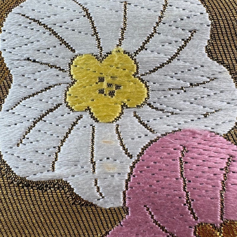 おめでたい席に相応しい意匠の袋帯でございます。 格式高いお席にもお使いいただけますので、お見逃しのないようお願いいたします。 締め跡がございます。 お太鼓垂先間と前柄お太鼓間にシミ、表地所々に刺繍糸のゆるみがございます。 裏地に生地のヨレがございます。 ※締め跡がお太鼓を含む裏地全体にございます。 リユース品としては目立った染み傷なく、状態の良いお品でございます。 ※なお、厳しく商品の状態確認を行っておりますが、記載の汚れ以外にも見落とし箇所がある可能性がある旨ご了承いただけますと幸いです。 沢山の商品の中からご覧いただき誠にありがとうございます。