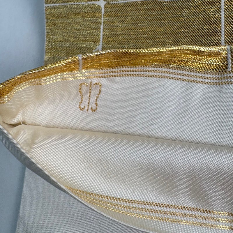 軍配マークと三本線が特徴の「川島織物」謹製の作品です。 おめでたい席に相応しい意匠の袋帯でございます。 格式高いお席にもお使いいただけますので、お見逃しのないようお願いいたします。 締め跡がございます。 手先前柄間に小さなシミ、裏地の締め跡沿いに汚れがございます。 裏地所々に小さなシミがございます。 リユース品としては良い状態で、まだまだご活用頂けると思われます。 ※なお、厳しく商品の状態確認を行っておりますが、記載の汚れ以外にも見落とし箇所がある可能性がある旨ご了承いただけますと幸いです。 沢山の商品の中からご覧いただき誠にありがとうございます。 ※保管によるにおい移りがございます。