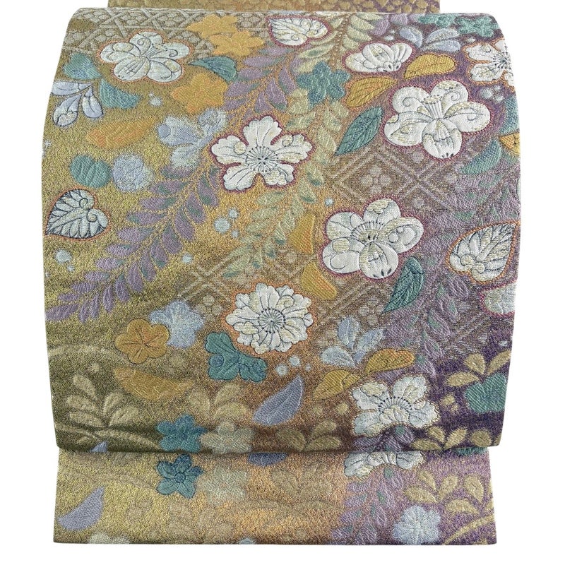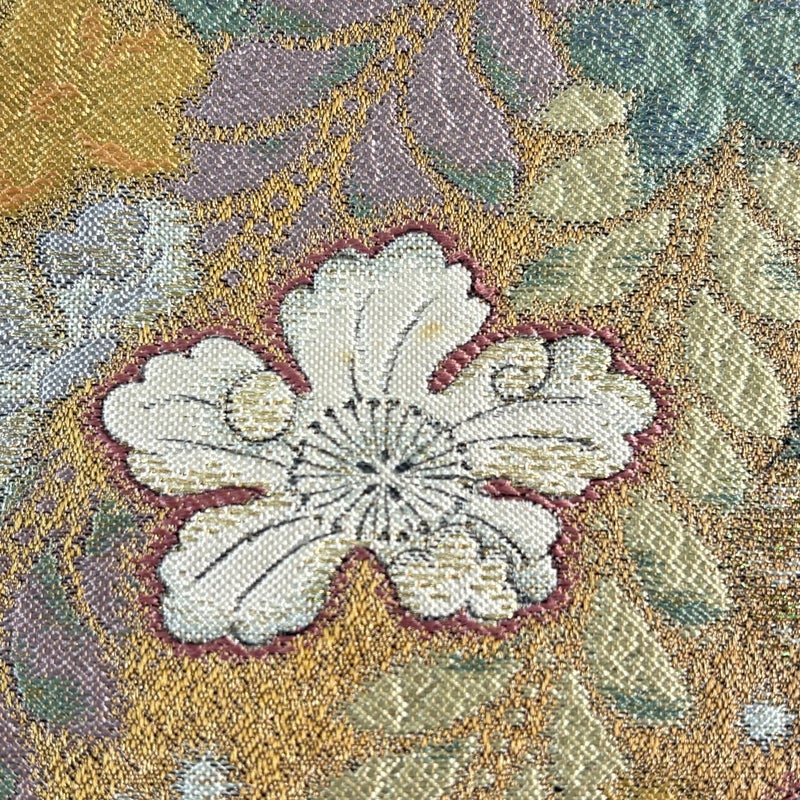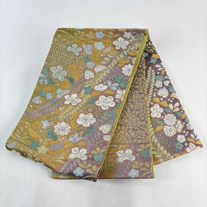 セミフォーマルでお使いいただける袋帯でございます。 見る人に重たい印象を感じさせない女性ならではの、気品豊かな一品です。 締め跡がございます。 お太鼓所々にシミ、表地所々にシワがございます。 裏地所々にシワがございます。 リユース品としては良い状態で、まだまだご活用頂けると思われます。 ※なお、厳しく商品の状態確認を行っておりますが、記載の汚れ以外にも見落とし箇所がある可能性がある旨ご了承いただけますと幸いです。 沢山の商品の中からご覧いただき誠にありがとうございます。 【OZ1】