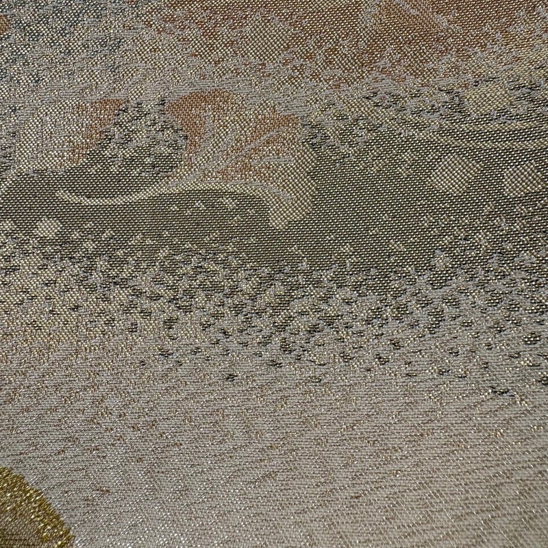 セミフォーマルでお使いいただける袋帯でございます。 見る人に重たい印象を感じさせない女性ならではの、気品豊かな一品です。 帯芯が入っておりません。 表地所々とお太鼓所々に箔の変色がございます。 リユース品としては良い状態で、まだまだご活用頂けると思われます。 ※なお、厳しく商品の状態確認を行っておりますが、記載の汚れ以外にも見落とし箇所がある可能性がある旨ご了承いただけますと幸いです。 沢山の商品の中からご覧いただき誠にありがとうございます。