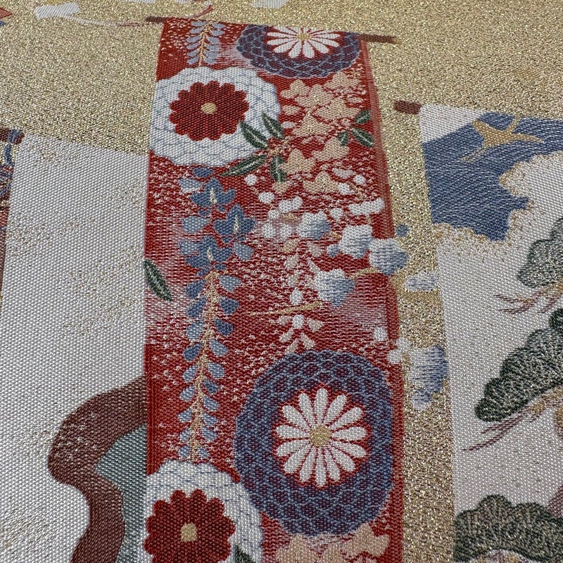 セミフォーマルでお使いいただける袋帯でございます。 見る人に重たい印象を感じさせない女性ならではの、気品豊かな一品です。 中無地に生地のヨレがございます。 リユース品としては目立った染み傷なく、状態の良いお品でございます。 ※なお、厳しく商品の状態確認を行っておりますが、記載の汚れ以外にも見落とし箇所がある可能性がある旨ご了承いただけますと幸いです。 沢山の商品の中からご覧いただき誠にありがとうございます。