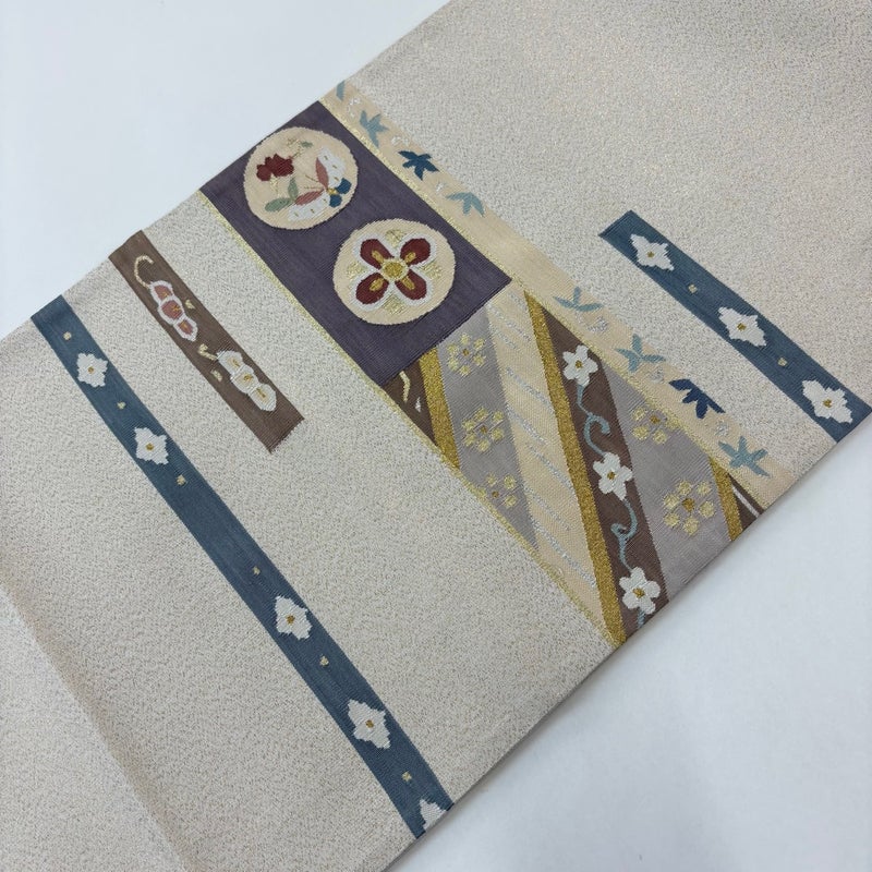セミフォーマルでお使いいただける袋帯でございます。 見る人に重たい印象を感じさせない女性ならではの、気品豊かな一品です。 リユース品としては目立った染み傷なく、状態の良いお品でございます。 ※商品の仕立て上、垂先の織り出し口から裏地がはみ出ております。 ※なお、厳しく商品の状態確認を行っておりますが、記載の汚れ以外にも見落とし箇所がある可能性がある旨ご了承いただけますと幸いです。 沢山の商品の中からご覧いただき誠にありがとうございます。
