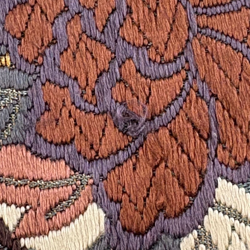 セミフォーマルでお使いいただける袋帯でございます。 見る人に重たい印象を感じさせない女性ならではの、気品豊かな一品です。 締め跡がございます。 中無地所々とお太鼓垂先間にシミ、表地所々に刺繍糸のゆるみがございます。 裏地に木屑がございます。 リユース品としては良い状態で、まだまだご活用頂けると思われます。 ※なお、厳しく商品の状態確認を行っておりますが、記載の汚れ以外にも見落とし箇所がある可能性がある旨ご了承いただけますと幸いです。 沢山の商品の中からご覧いただき誠にありがとうございます。 ※保管によるにおい移りがございます。