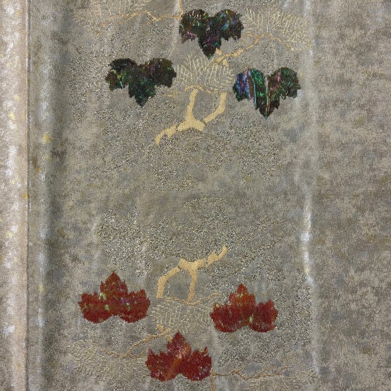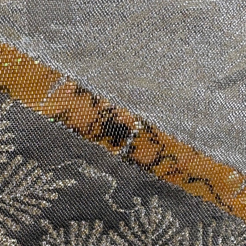 セミフォーマルでお使いいただける袋帯でございます。 見る人に重たい印象を感じさせない女性ならではの、気品豊かな一品です。 帯芯が入っておりません。 締め跡がございます。 手先前柄間に糸つれ、お太鼓柄部分に螺鈿の変色がございます。 裏地所々にシミがございます。 リユース品としては良い状態で、まだまだご活用頂けると思われます。 ※なお、厳しく商品の状態確認を行っておりますが、記載の汚れ以外にも見落とし箇所がある可能性がある旨ご了承いただけますと幸いです。 沢山の商品の中からご覧いただき誠にありがとうございます。