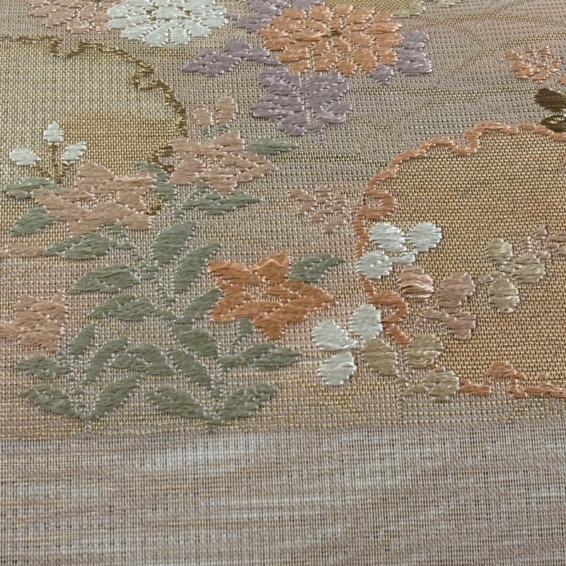 セミフォーマルでお使いいただける夏帯の袋帯でございます。 見る人に重たい印象を感じさせない女性ならではの、気品豊かな一品です。 締め跡がございます。 締め跡沿いに薄汚れ、中無地にシワ、表地所々に刺繍糸の緩みがございます。 リユース品としては良い状態で、まだまだご活用頂けると思われます。 ※なお、厳しく商品の状態確認を行っておりますが、記載の汚れ以外にも見落とし箇所がある可能性がある旨ご了承いただけますと幸いです。 沢山の商品の中からご覧いただき誠にありがとうございます。