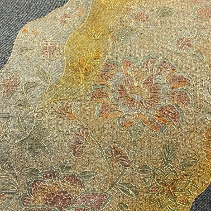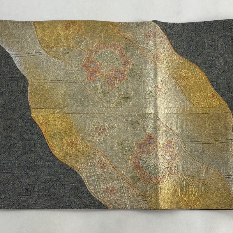 【美品】 袋帯 秀品 草花 金糸 金彩 灰緑 お太鼓柄 正絹
