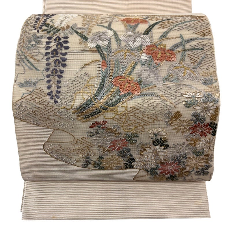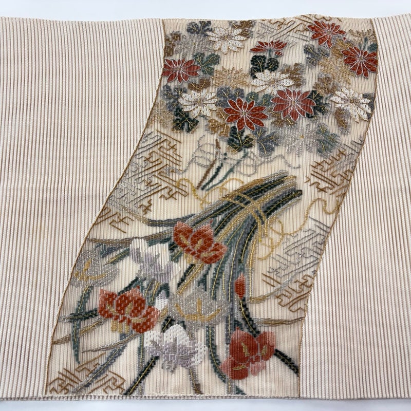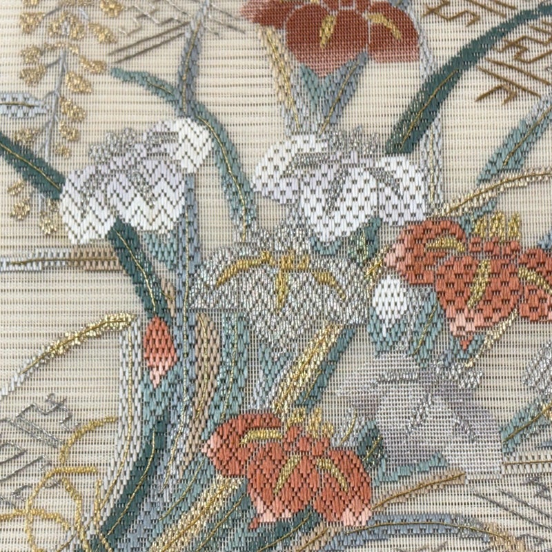 夏帯でございます。 セミフォーマルでお使いいただける袋帯でございます。 見る人に重たい印象を感じさせない女性ならではの、気品豊かな一品です。 帯芯が入っておりません。 締め跡がございます。 垂先所々と前柄お太鼓間と手先前柄間にシミがございます。 裏地所々にシミがございます。 リユース品としては良い状態で、まだまだご活用頂けると思われます。 ※なお、厳しく商品の状態確認を行っておりますが、記載の汚れ以外にも見落とし箇所がある可能性がある旨ご了承いただけますと幸いです。 沢山の商品の中からご覧いただき誠にありがとうございます。