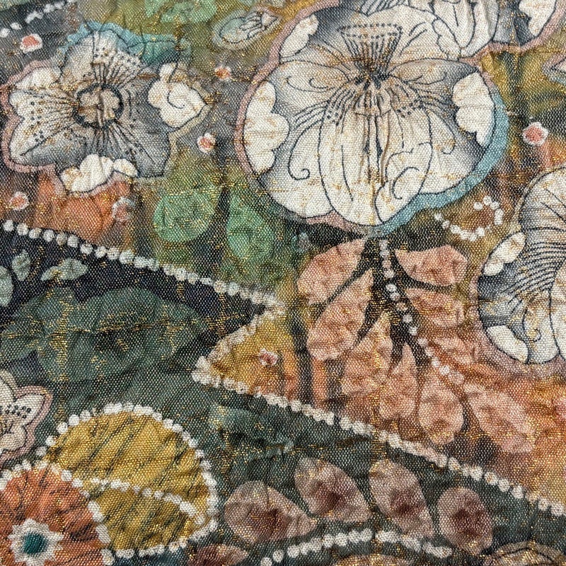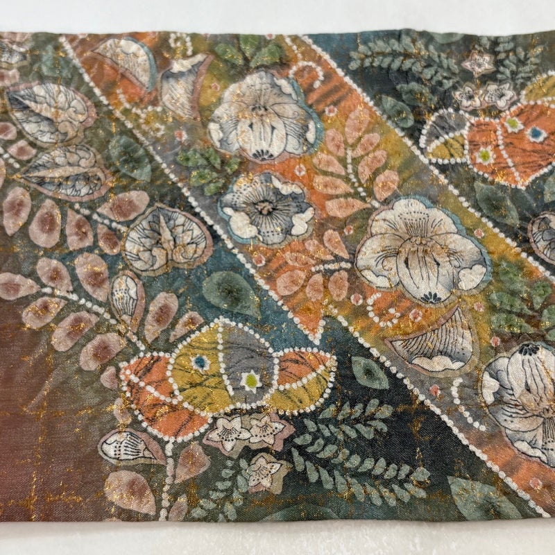 セミフォーマルでお使いいただける袋帯でございます。 見る人に重たい印象を感じさせない女性ならではの、気品豊かな一品です。 前柄付近にシミがございます。 リユース品としては良い状態で、まだまだご活用頂けると思われます。 ※なお、厳しく商品の状態確認を行っておりますが、記載の汚れ以外にも見落とし箇所がある可能性がある旨ご了承いただけますと幸いです。 沢山の商品の中からご覧いただき誠にありがとうございます。 ※保管によるにおい移りがございます。