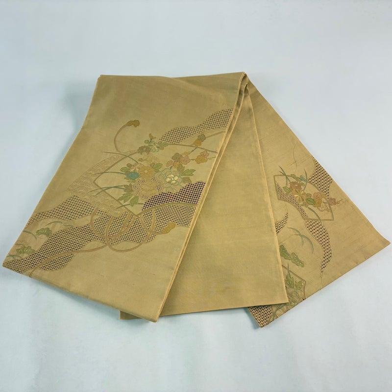 おめでたい席に相応しい意匠の袋帯でございます。 格式高いお席にもお使いいただけますので、お見逃しのないようお願いいたします。 締め跡がございます。 表地所々に生地の傷み、お太鼓に色抜けがございます。 裏地所々に生地の傷みがございます。 リユース品としては良い状態で、まだまだご活用頂けると思われます。 ※なお、厳しく商品の状態確認を行っておりますが、記載の汚れ以外にも見落とし箇所がある可能性がある旨ご了承いただけますと幸いです。 沢山の商品の中からご覧いただき誠にありがとうございます。