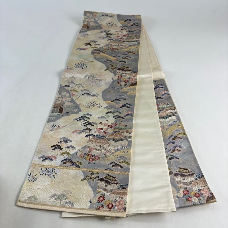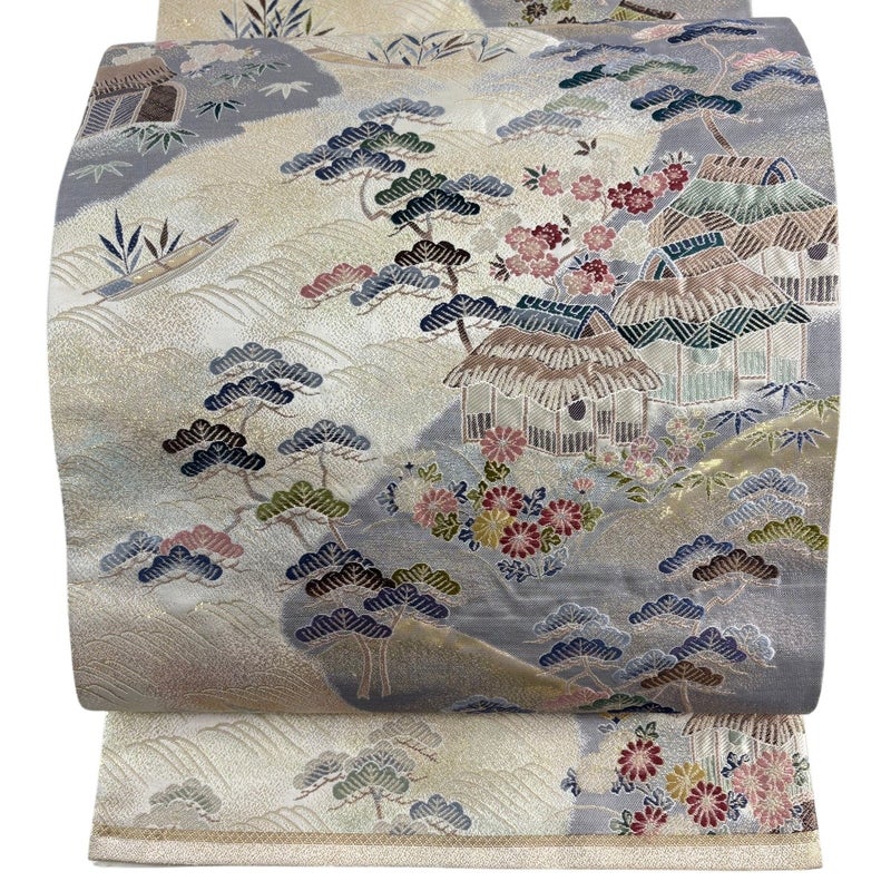 セミフォーマルでお使いいただける袋帯でございます。 見る人に重たい印象を感じさせない女性ならではの、気品豊かな一品です。 締め跡がございます。 前柄と中無地などにシミ、お太鼓付近と中無地などにシワがございます。 裏地にシミ、裏地に小さなシミがございます。 ご購入の際はその点ご留意ください。 ※なお、厳しく商品の状態確認を行っておりますが、記載の汚れ以外にも見落とし箇所がある可能性がある旨ご了承いただけますと幸いです。 沢山の商品の中からご覧いただき誠にありがとうございます。