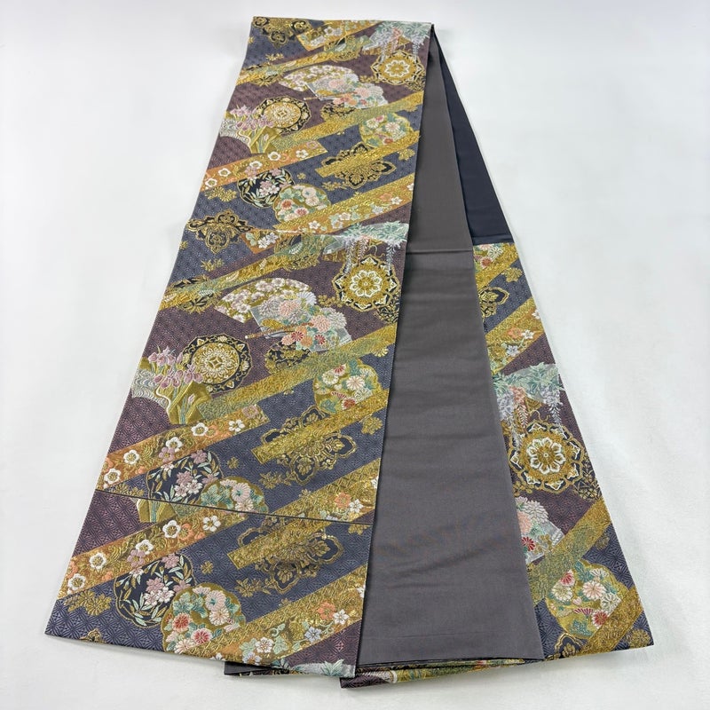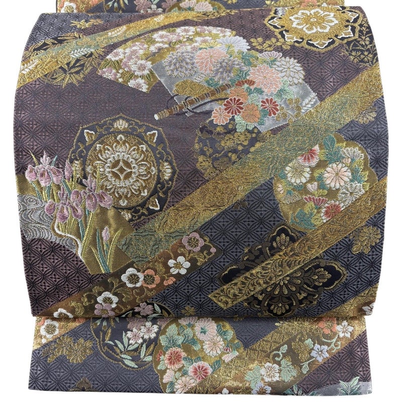 【美品】 袋帯 秀品 扇面 草花 金糸 箔 紫 六通 正絹