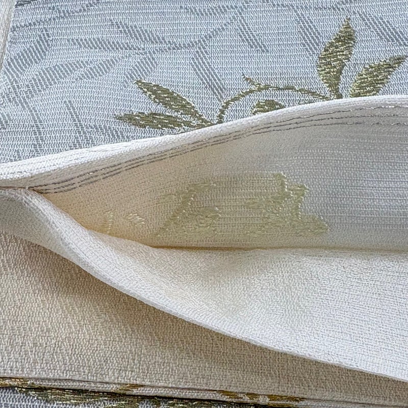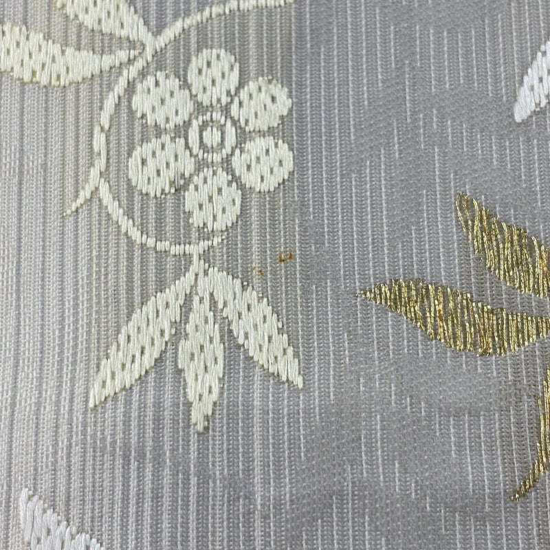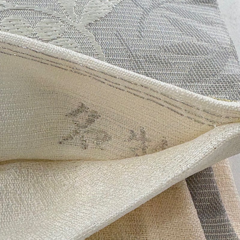 セミフォーマルでお使いいただける袋帯でございます。 見る人に重たい印象を感じさせない女性ならではの、気品豊かな一品です。 締め跡がございます。 ※商品の仕立て上、垂先の織り出し口から裏地がはみ出ております。 お太鼓の帯芯にシミ、中無地と手先前柄間所々に小さなシミ、お太鼓と中無地締め跡沿いにシワがございます。 裏地にシミ、帯芯所々にシミ、裏地所々にシワがございます。 リユース品としては良い状態で、まだまだご活用頂けると思われます。 ※なお、厳しく商品の状態確認を行っておりますが、記載の汚れ以外にも見落とし箇所がある可能性がある旨ご了承いただけますと幸いです。 沢山の商品の中からご覧いただき誠にありがとうございます。