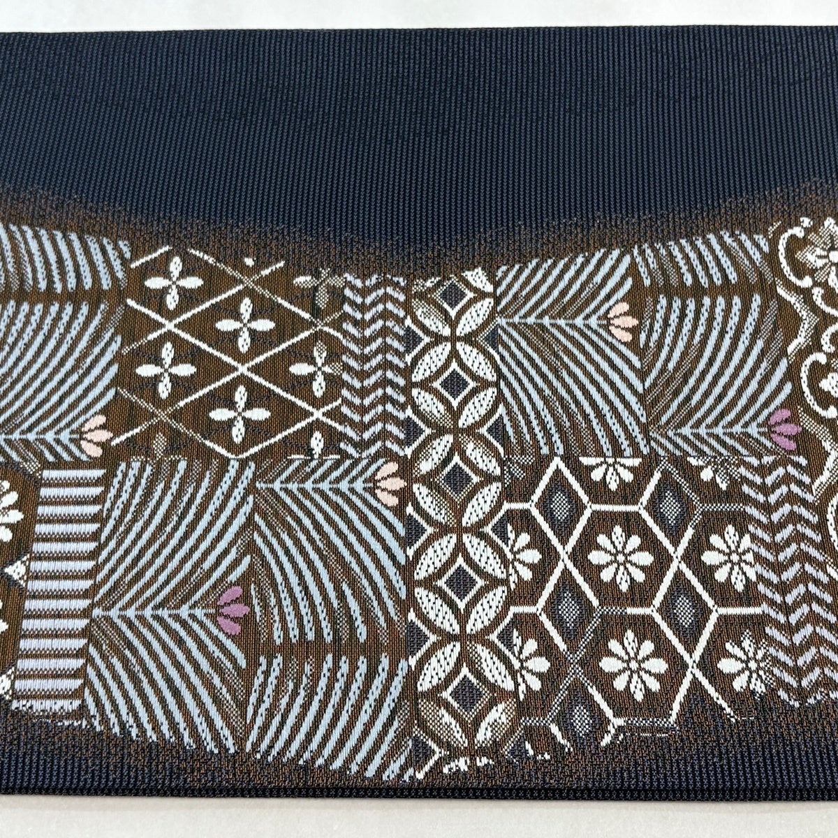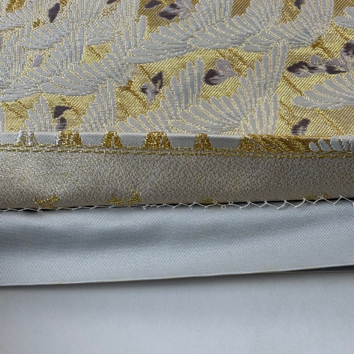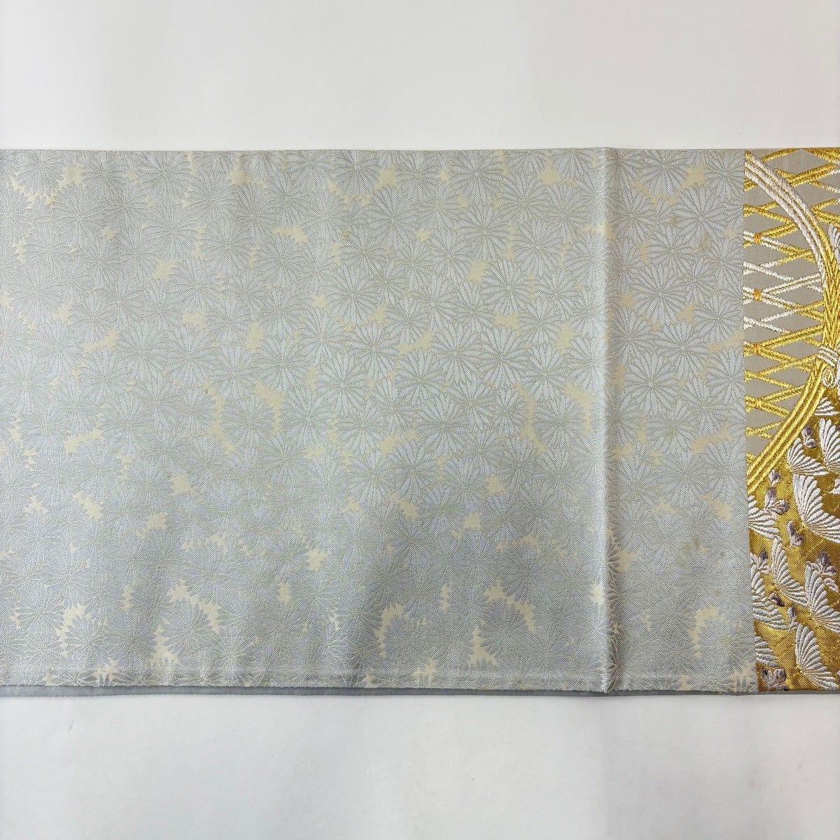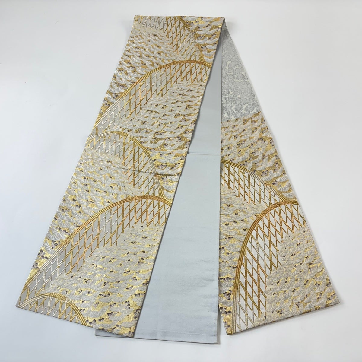 袋帯とは女性用の主にフォーマル用の帯で第一礼装として着用されることが多く、形状は表地にのみ柄があり裏地は無地になるように袋状に織って作成されたため袋帯という名が付きました。 帯を締める際にはおめでたいことが重なりますようにという願いが込められている二重太鼓や成人式の際に振袖に見かけるふくら雀や文庫結びなどの変わり結びを用いて着用します。