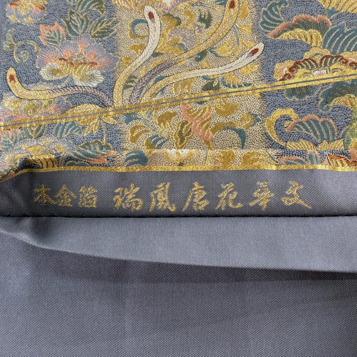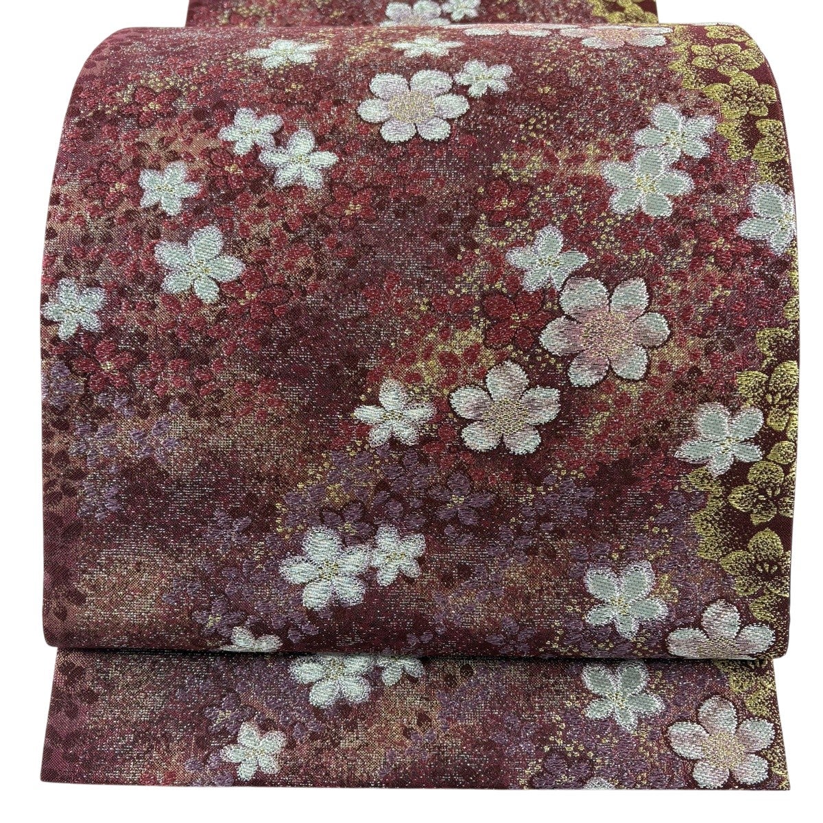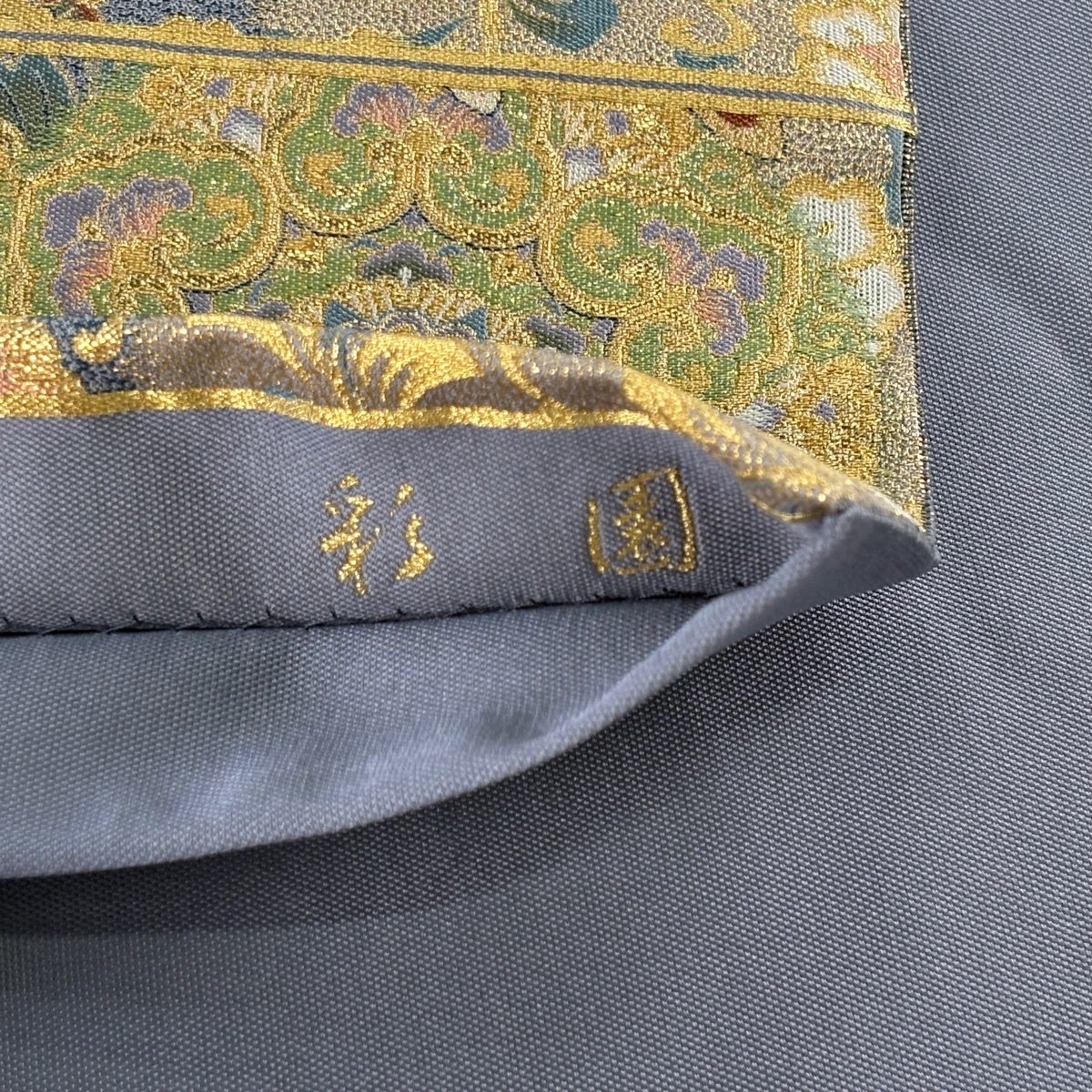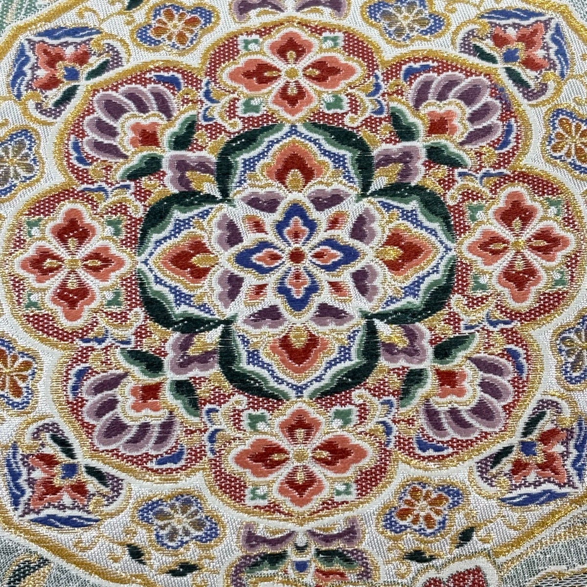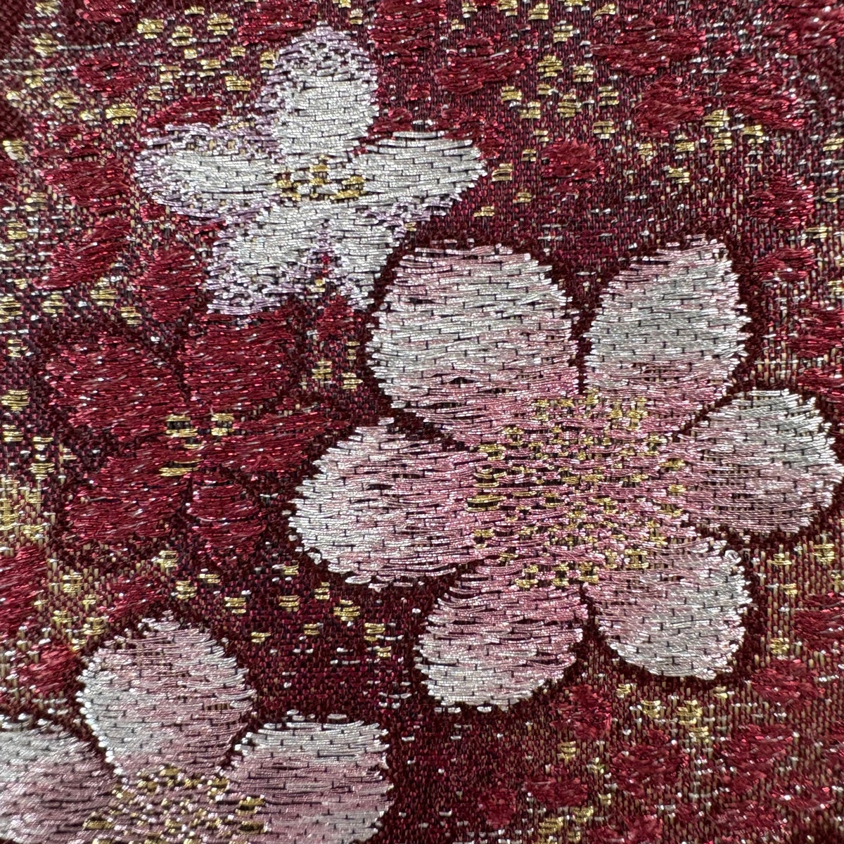 袋帯とは女性用の主にフォーマル用の帯で第一礼装として着用されることが多く、形状は表地にのみ柄があり裏地は無地になるように袋状に織って作成されたため袋帯という名が付きました。 帯を締める際にはおめでたいことが重なりますようにという願いが込められている二重太鼓や成人式の際に振袖に見かけるふくら雀や文庫結びなどの変わり結びを用いて着用します。