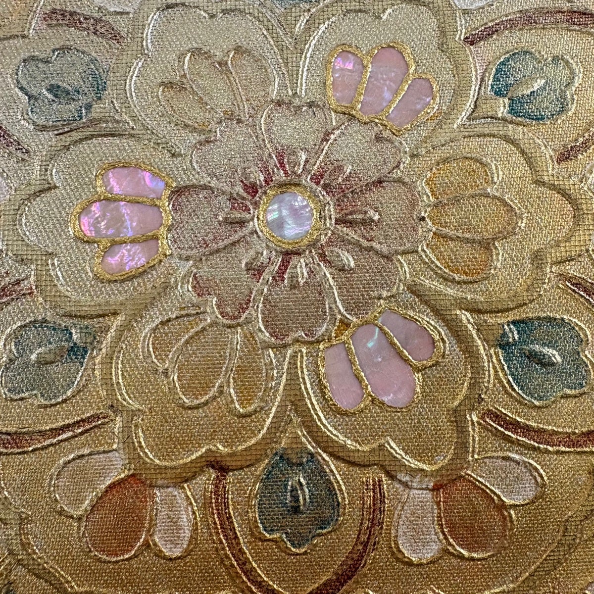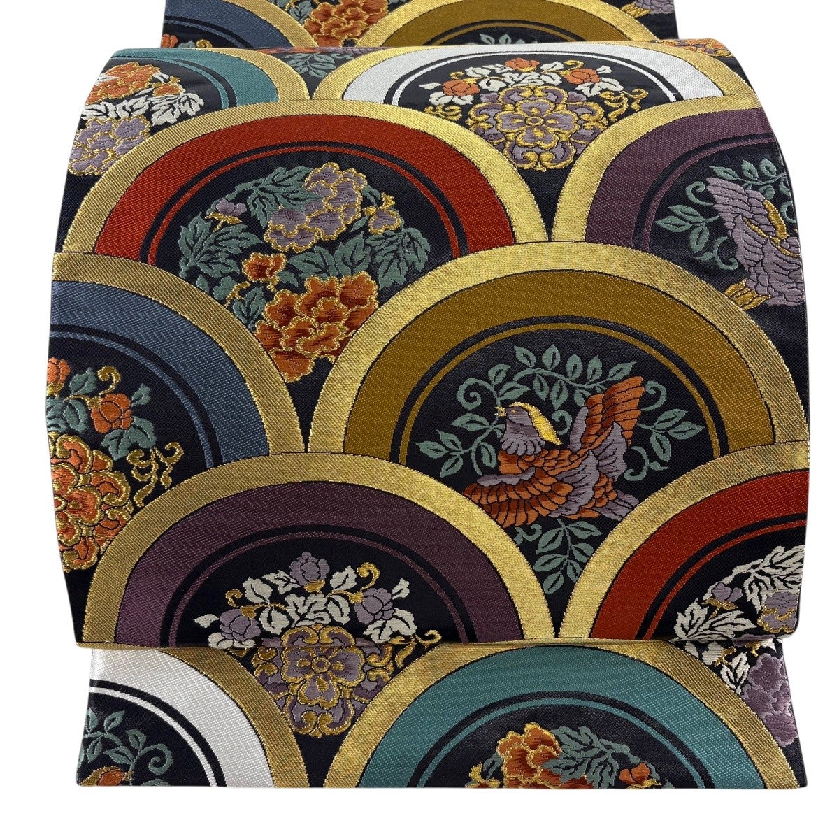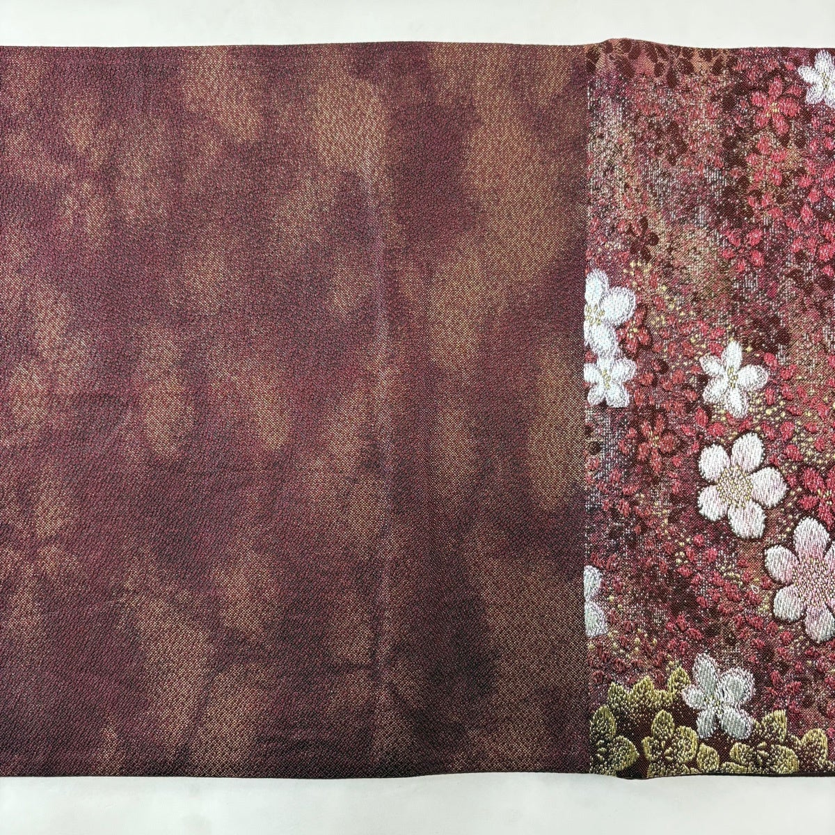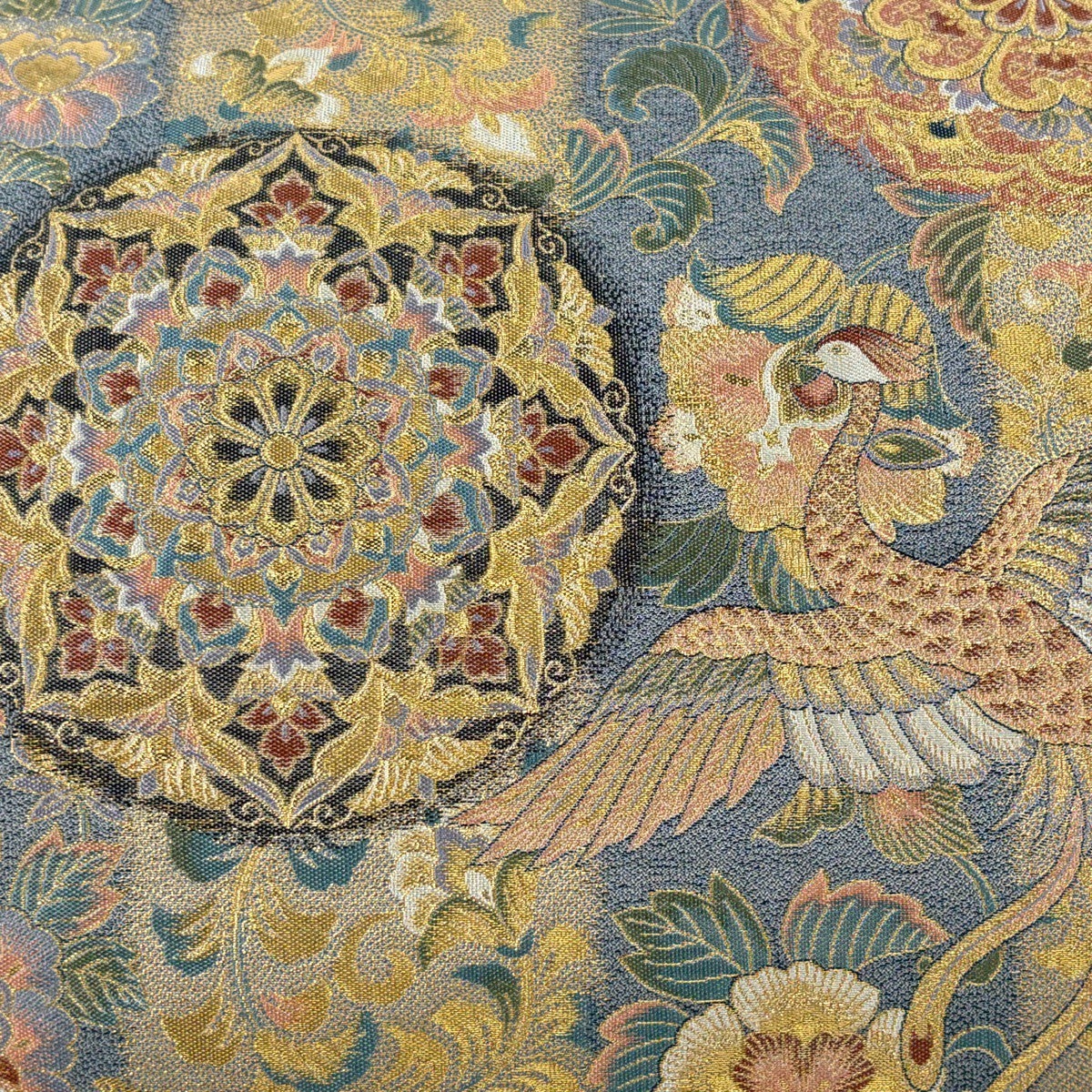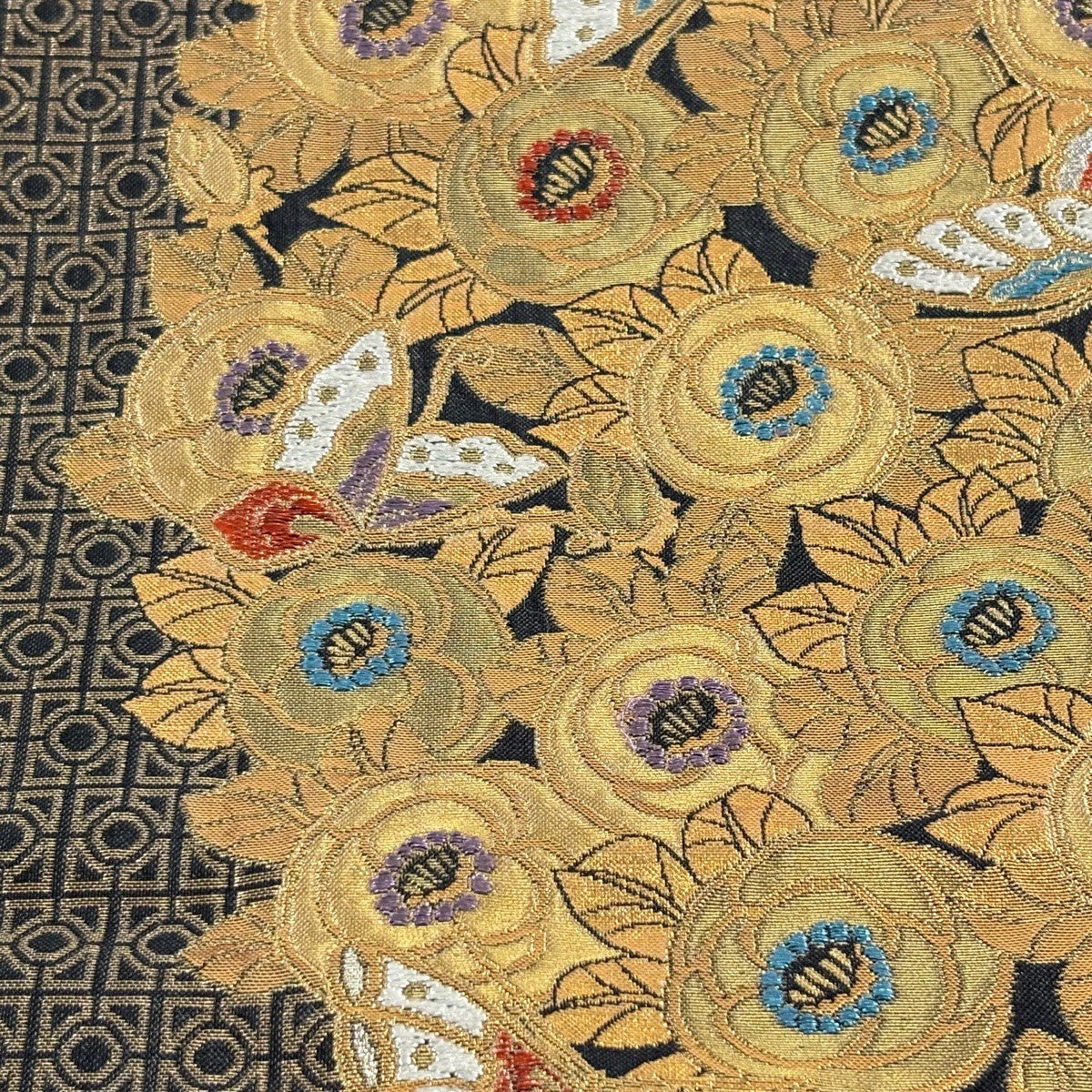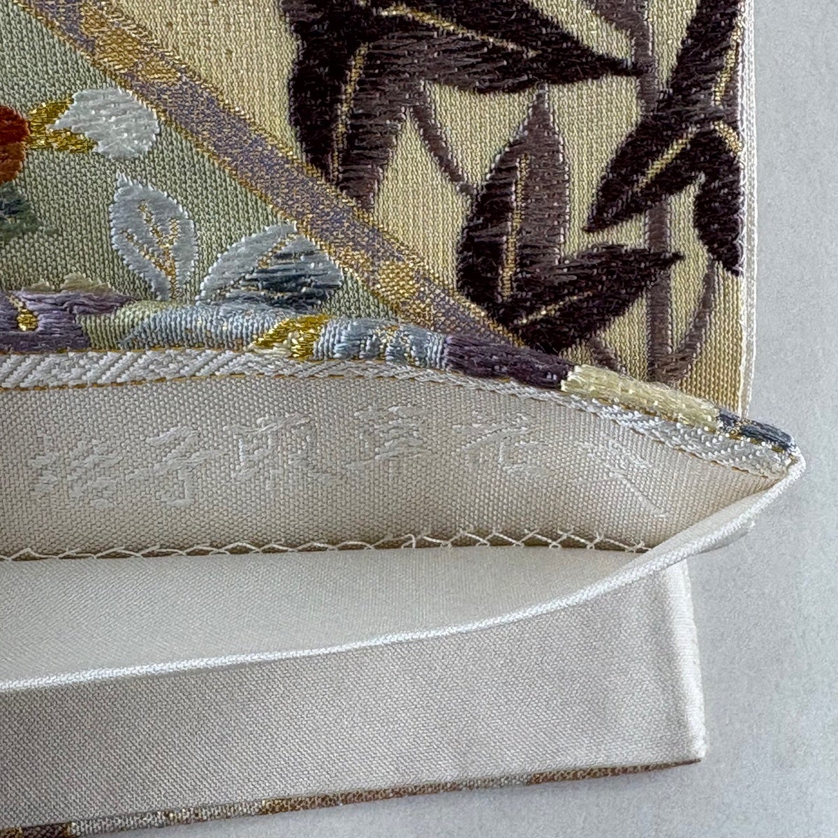 袋帯とは女性用の主にフォーマル用の帯で第一礼装として着用されることが多く、形状は表地にのみ柄があり裏地は無地になるように袋状に織って作成されたため袋帯という名が付きました。 帯を締める際にはおめでたいことが重なりますようにという願いが込められている二重太鼓や成人式の際に振袖に見かけるふくら雀や文庫結びなどの変わり結びを用いて着用します。