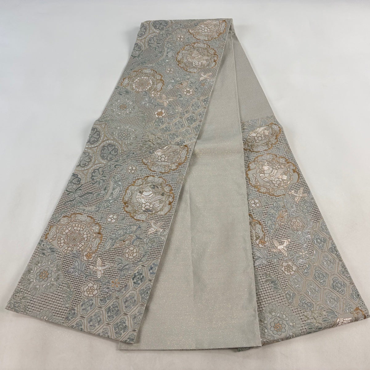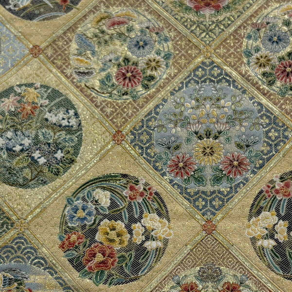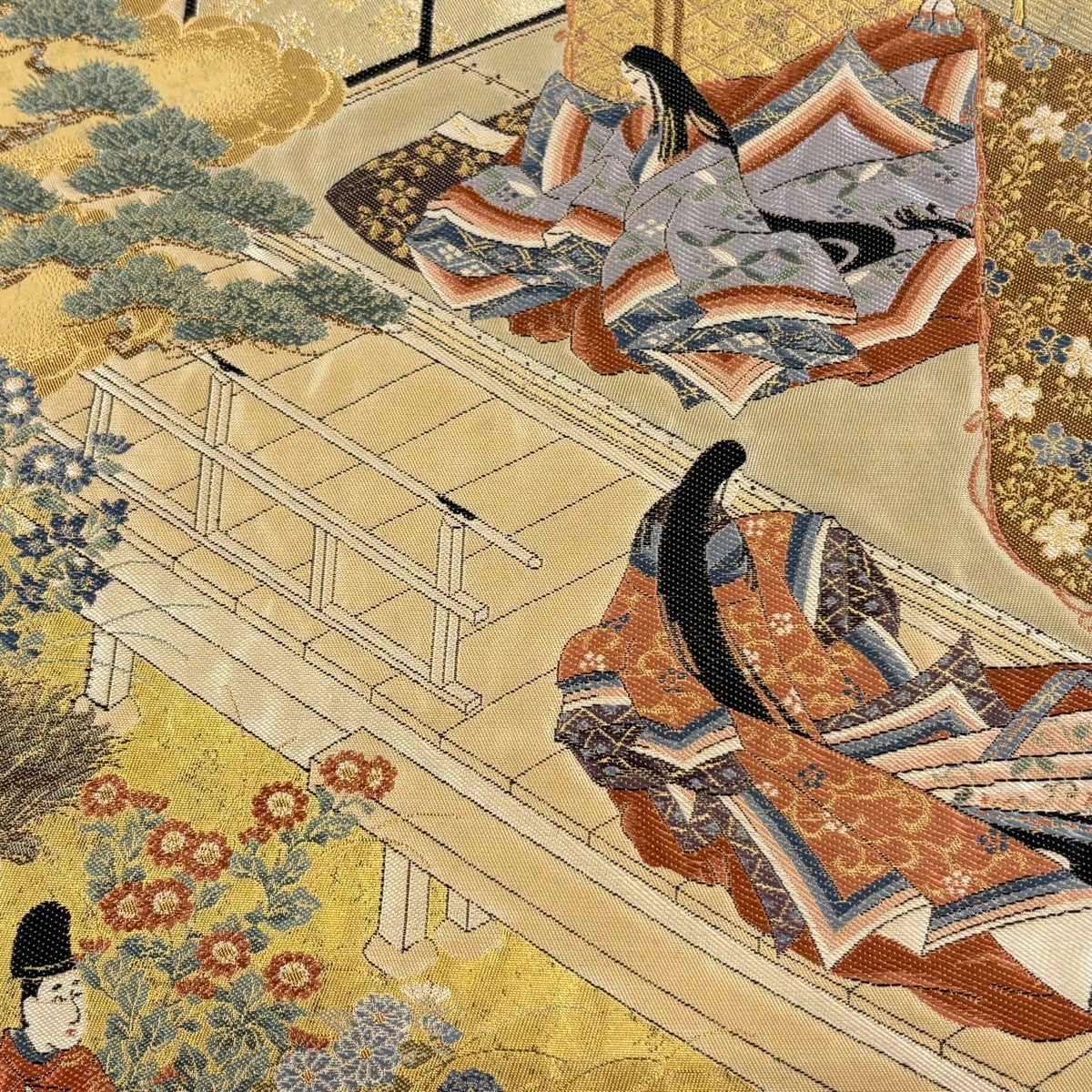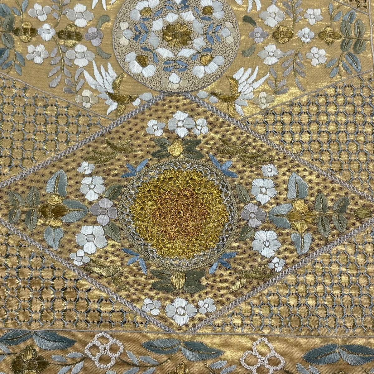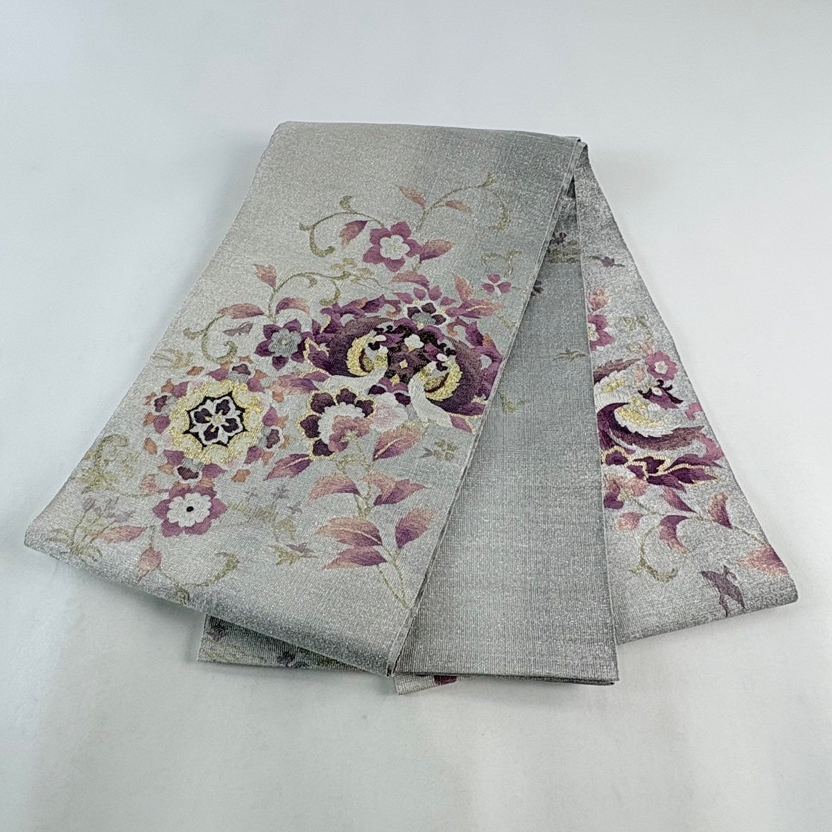 袋帯とは女性用の主にフォーマル用の帯で第一礼装として着用されることが多く、形状は表地にのみ柄があり裏地は無地になるように袋状に織って作成されたため袋帯という名が付きました。 帯を締める際にはおめでたいことが重なりますようにという願いが込められている二重太鼓や成人式の際に振袖に見かけるふくら雀や文庫結びなどの変わり結びを用いて着用します。