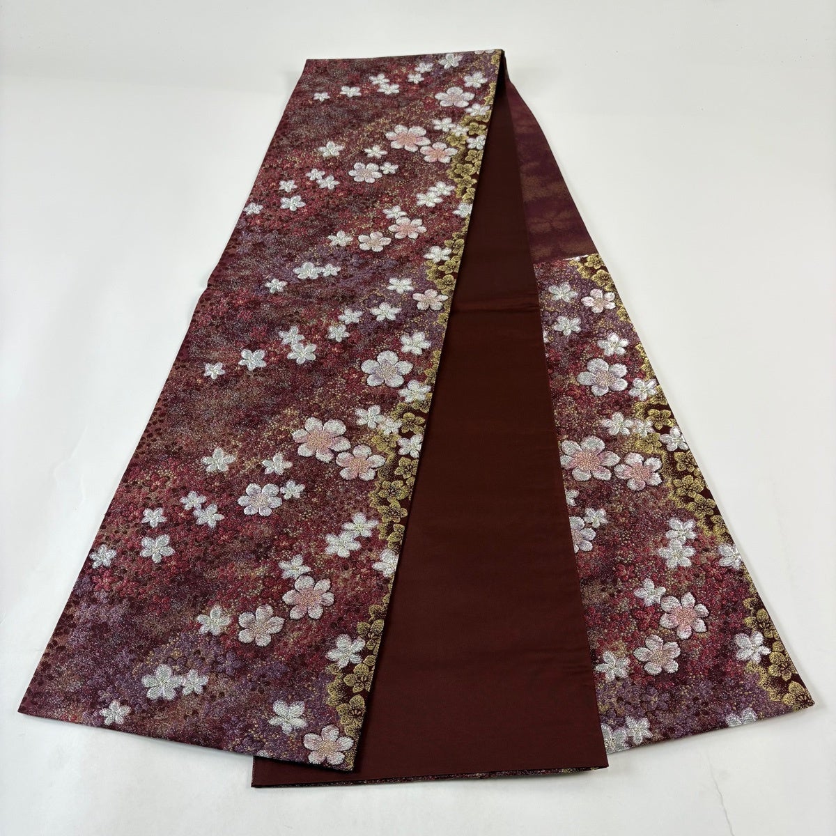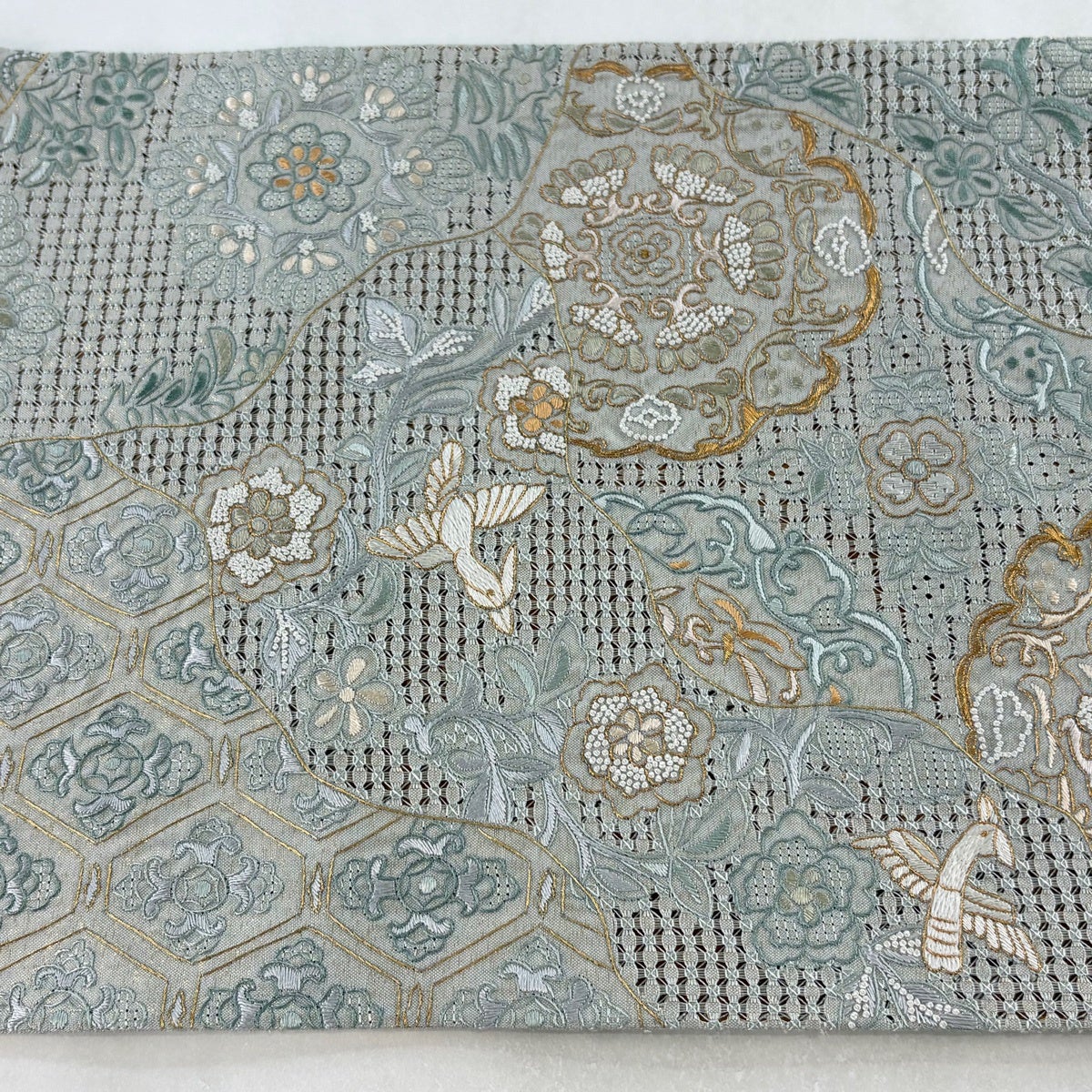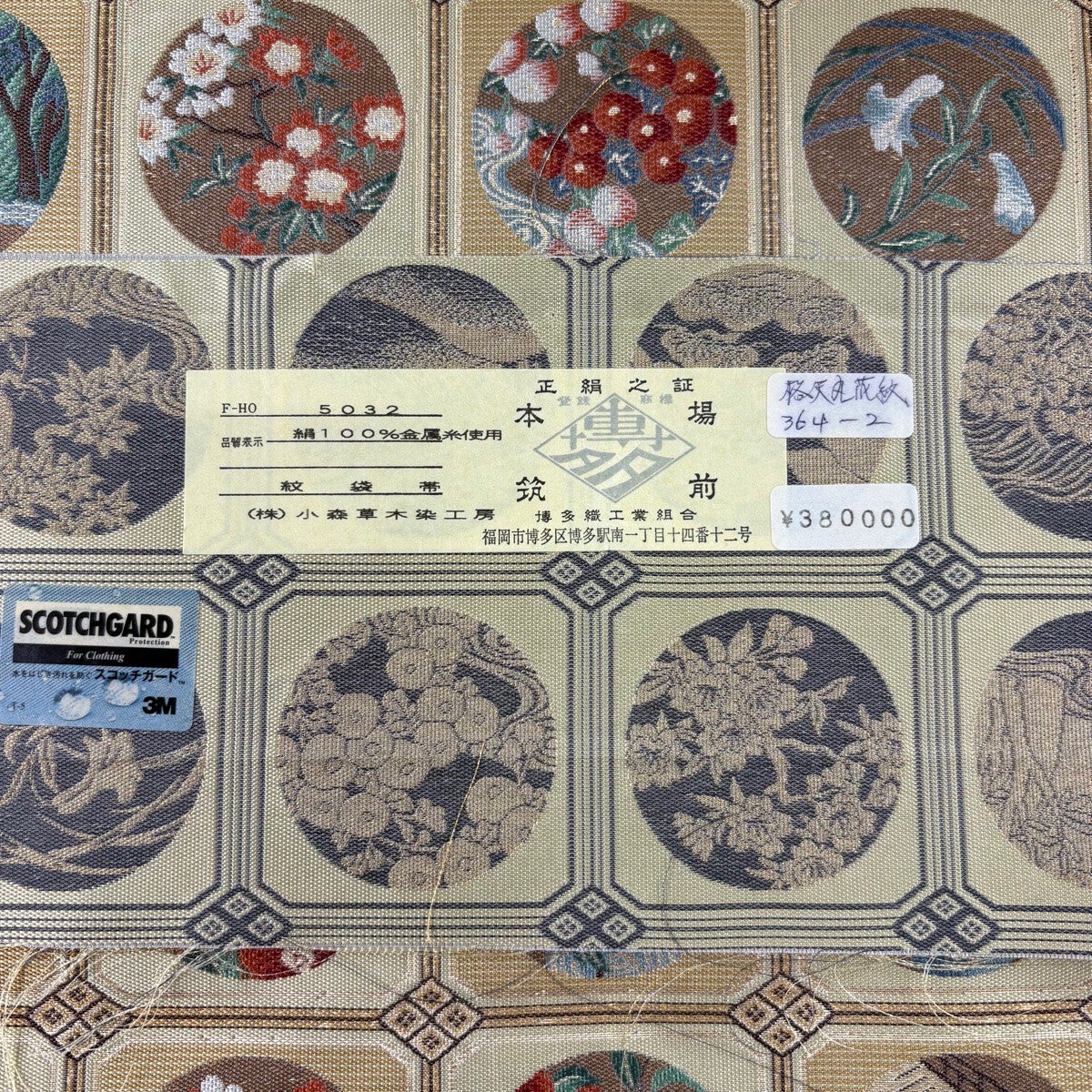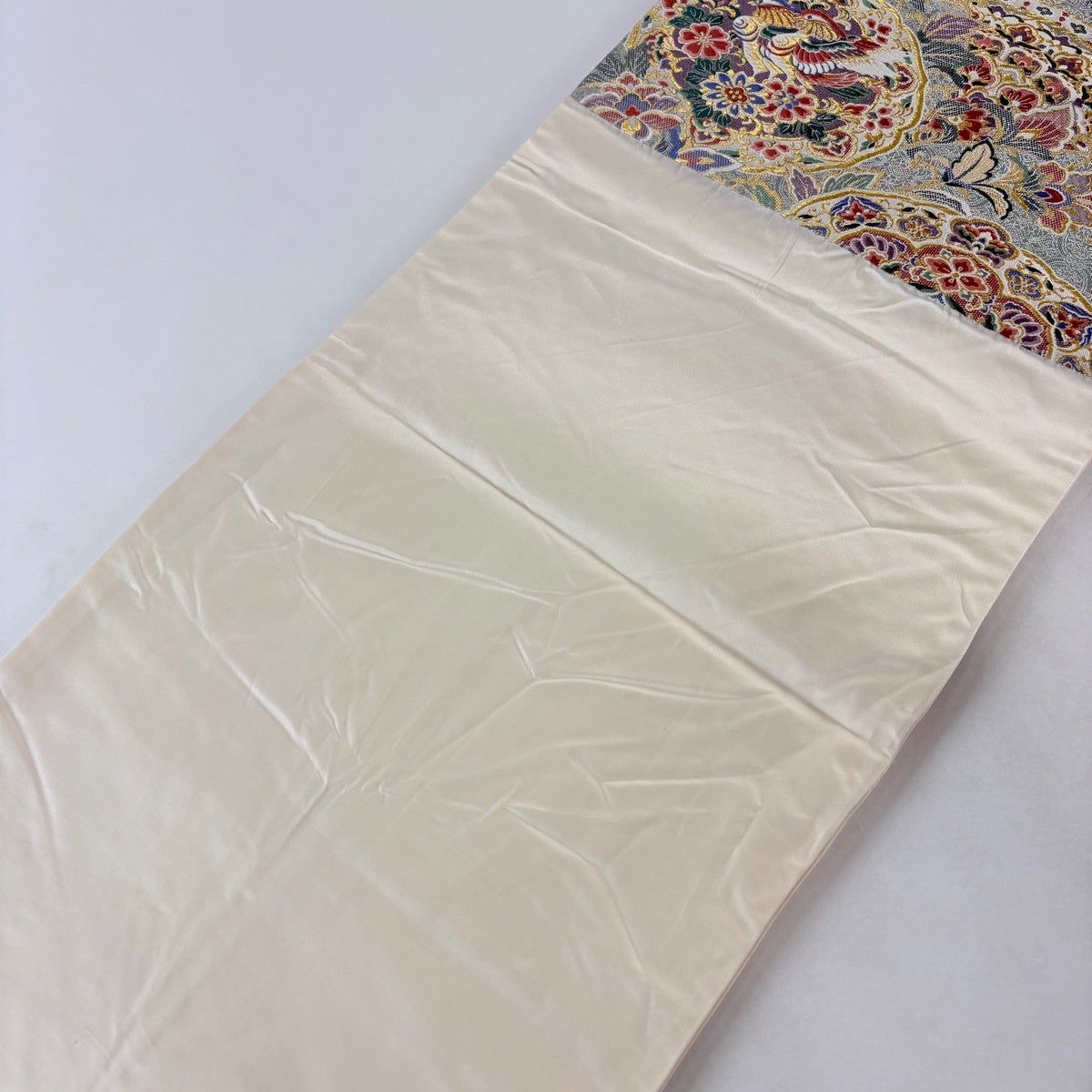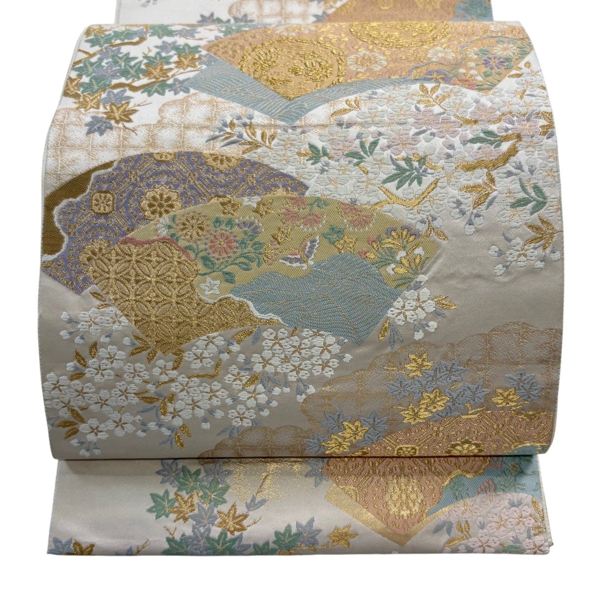 袋帯とは女性用の主にフォーマル用の帯で第一礼装として着用されることが多く、形状は表地にのみ柄があり裏地は無地になるように袋状に織って作成されたため袋帯という名が付きました。 帯を締める際にはおめでたいことが重なりますようにという願いが込められている二重太鼓や成人式の際に振袖に見かけるふくら雀や文庫結びなどの変わり結びを用いて着用します。