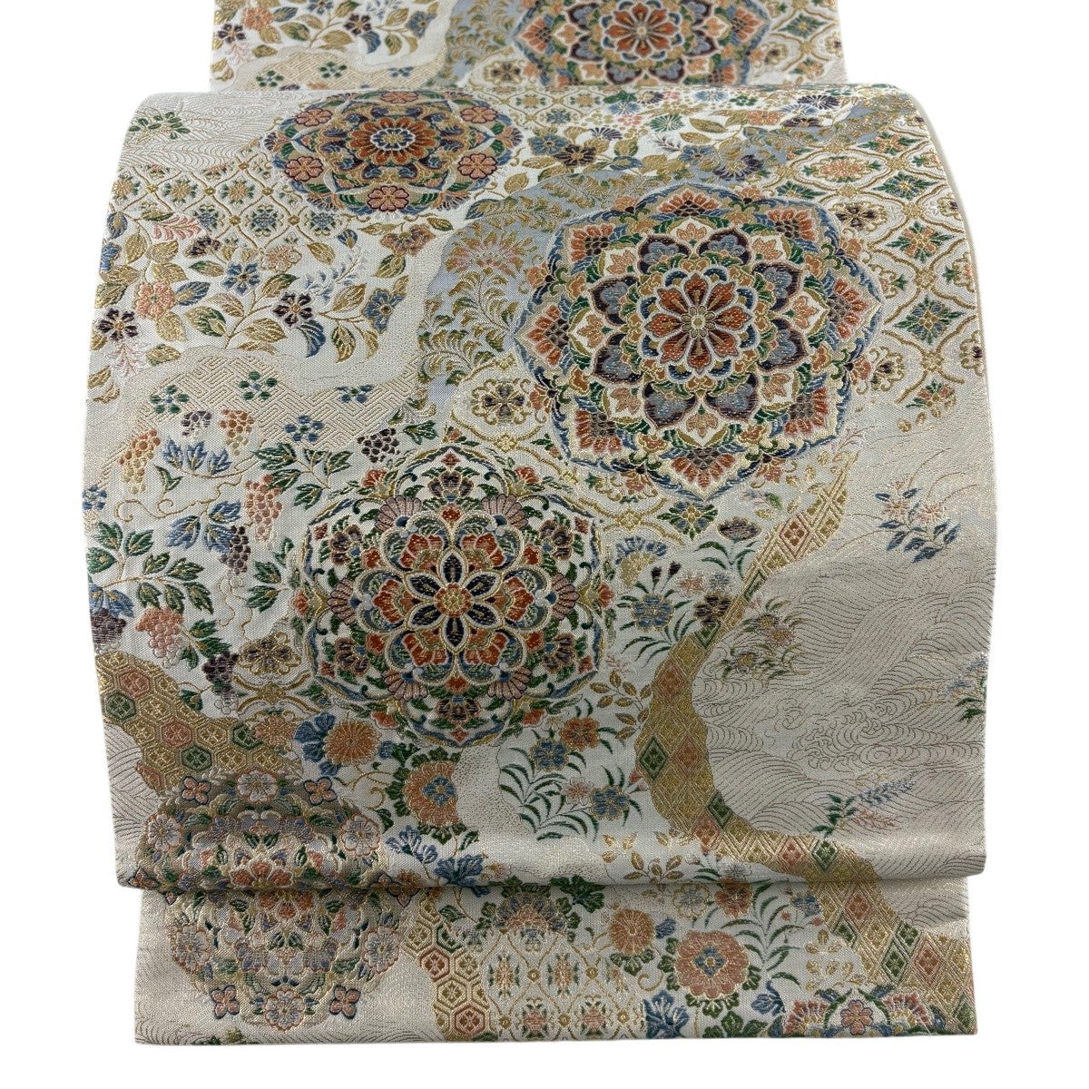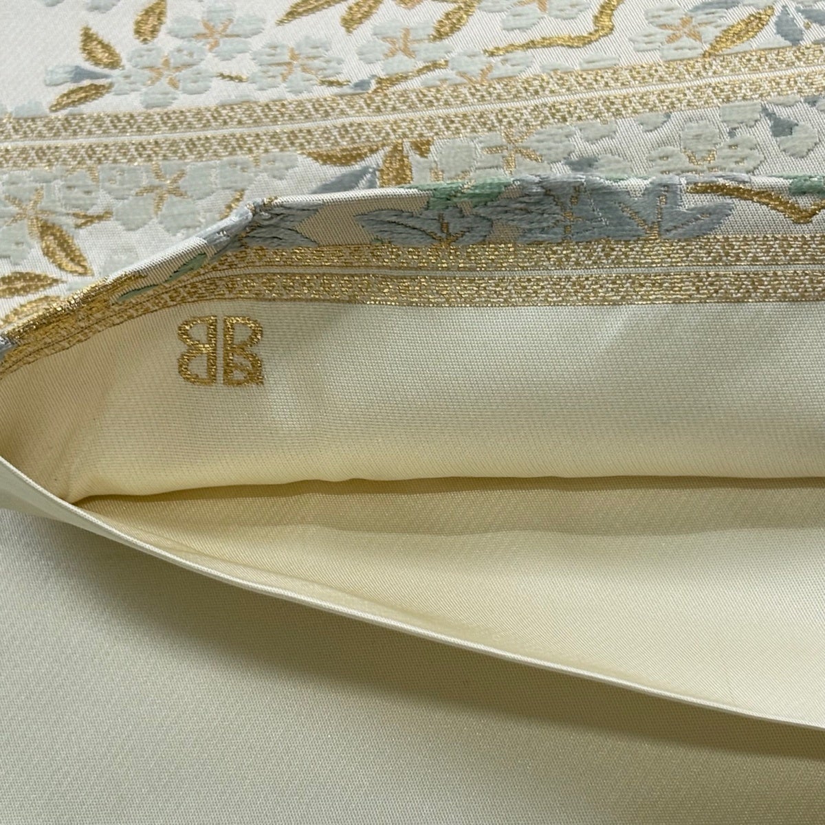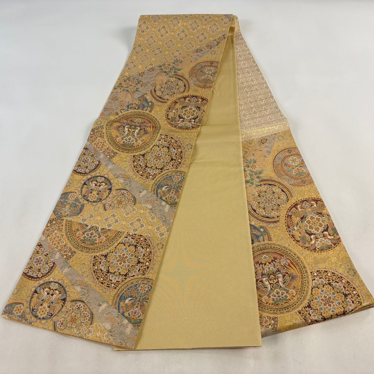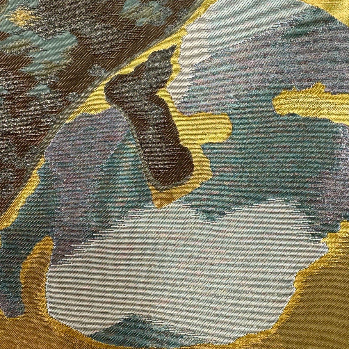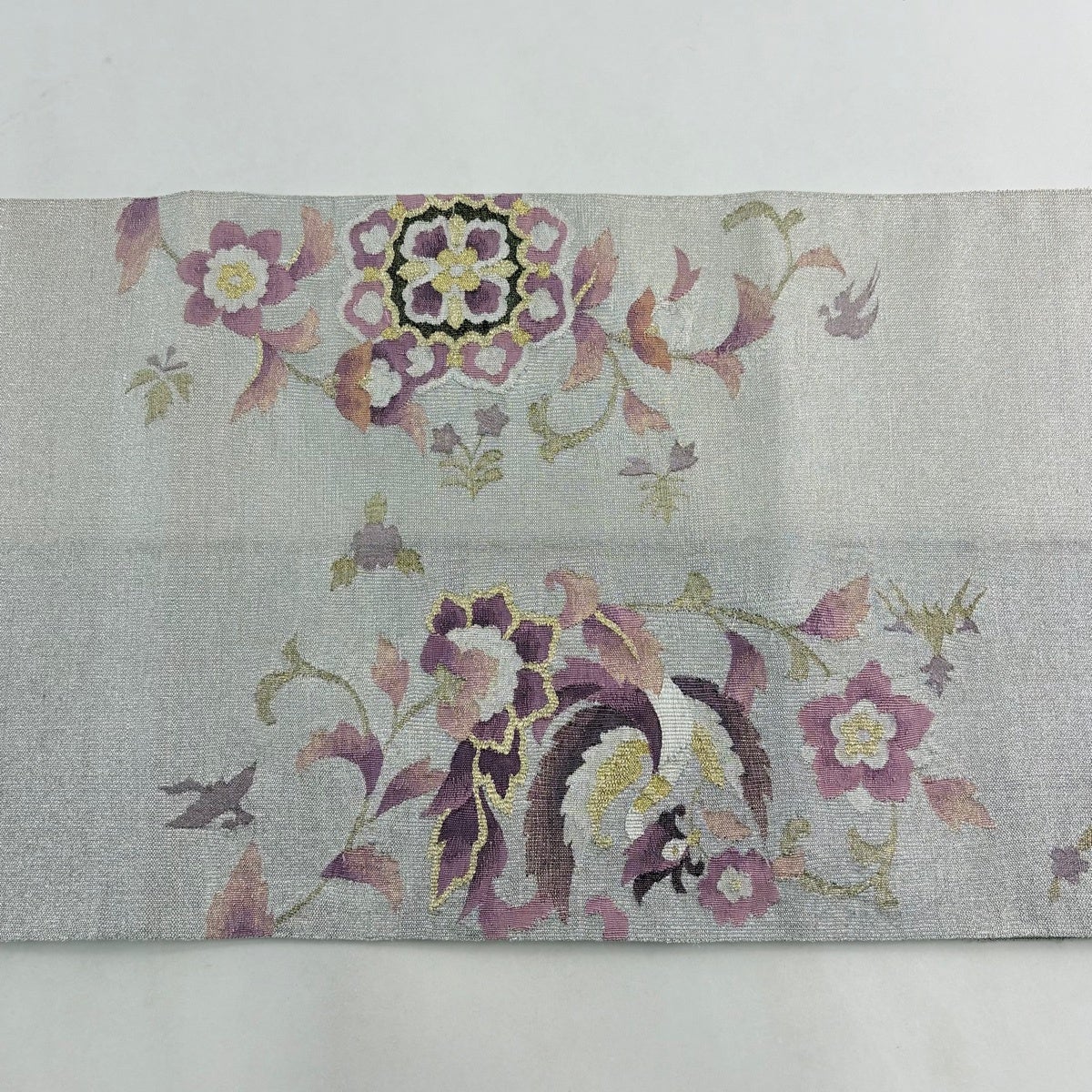 袋帯とは女性用の主にフォーマル用の帯で第一礼装として着用されることが多く、形状は表地にのみ柄があり裏地は無地になるように袋状に織って作成されたため袋帯という名が付きました。 帯を締める際にはおめでたいことが重なりますようにという願いが込められている二重太鼓や成人式の際に振袖に見かけるふくら雀や文庫結びなどの変わり結びを用いて着用します。