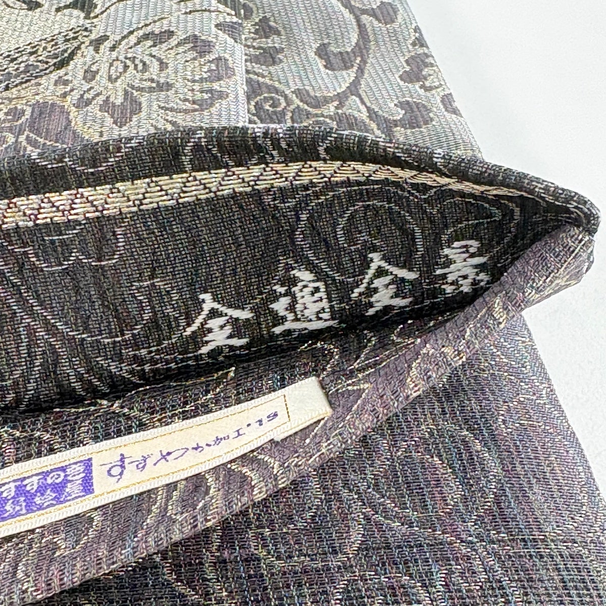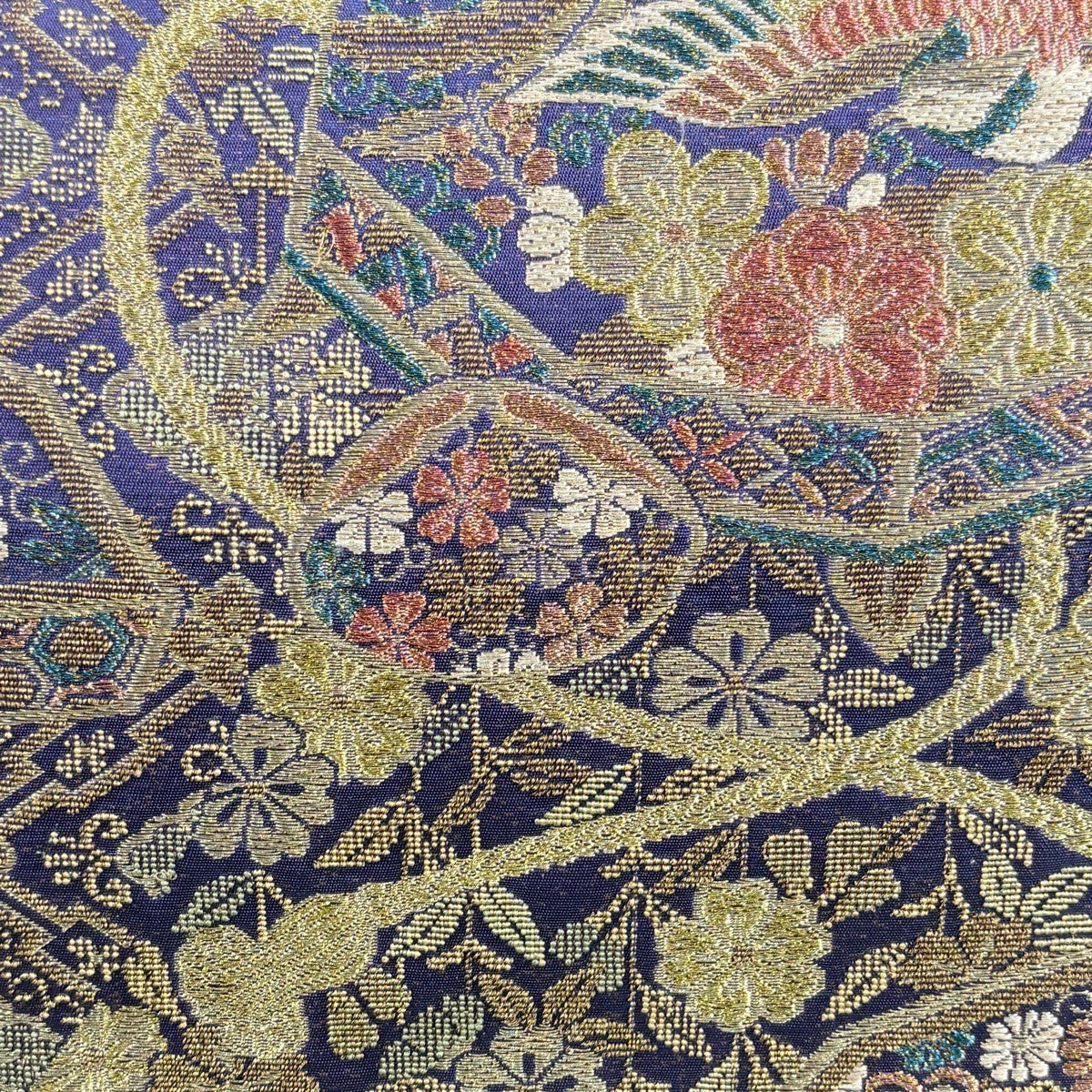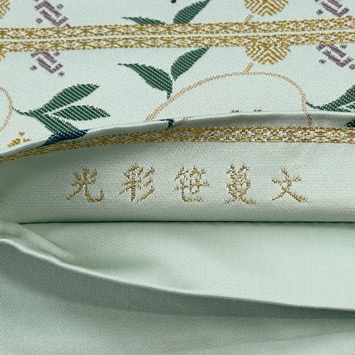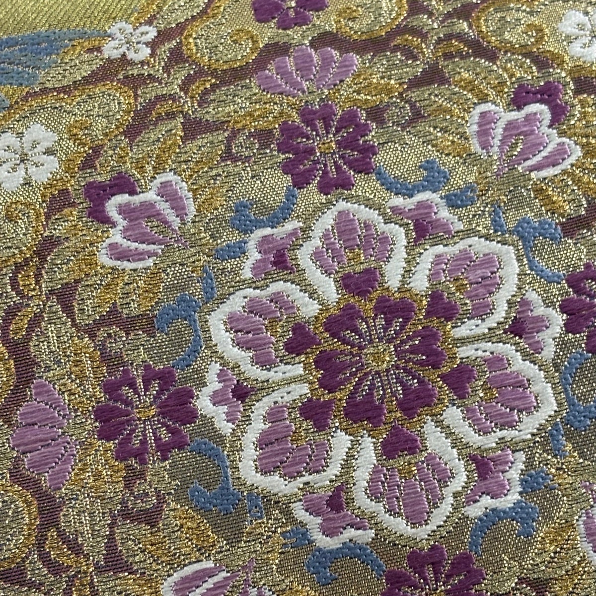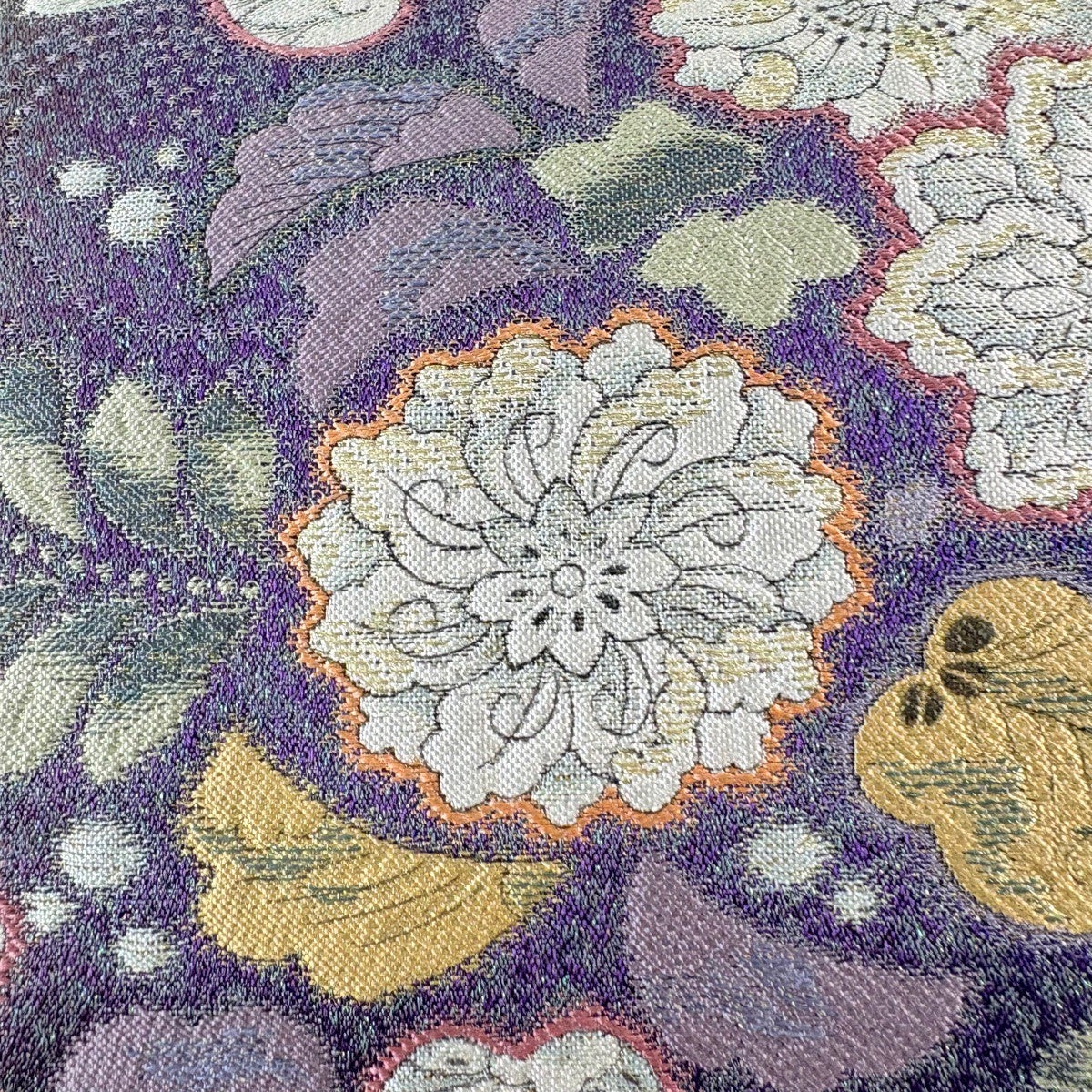 袋帯とは女性用の主にフォーマル用の帯で第一礼装として着用されることが多く、形状は表地にのみ柄があり裏地は無地になるように袋状に織って作成されたため袋帯という名が付きました。 帯を締める際にはおめでたいことが重なりますようにという願いが込められている二重太鼓や成人式の際に振袖に見かけるふくら雀や文庫結びなどの変わり結びを用いて着用します。