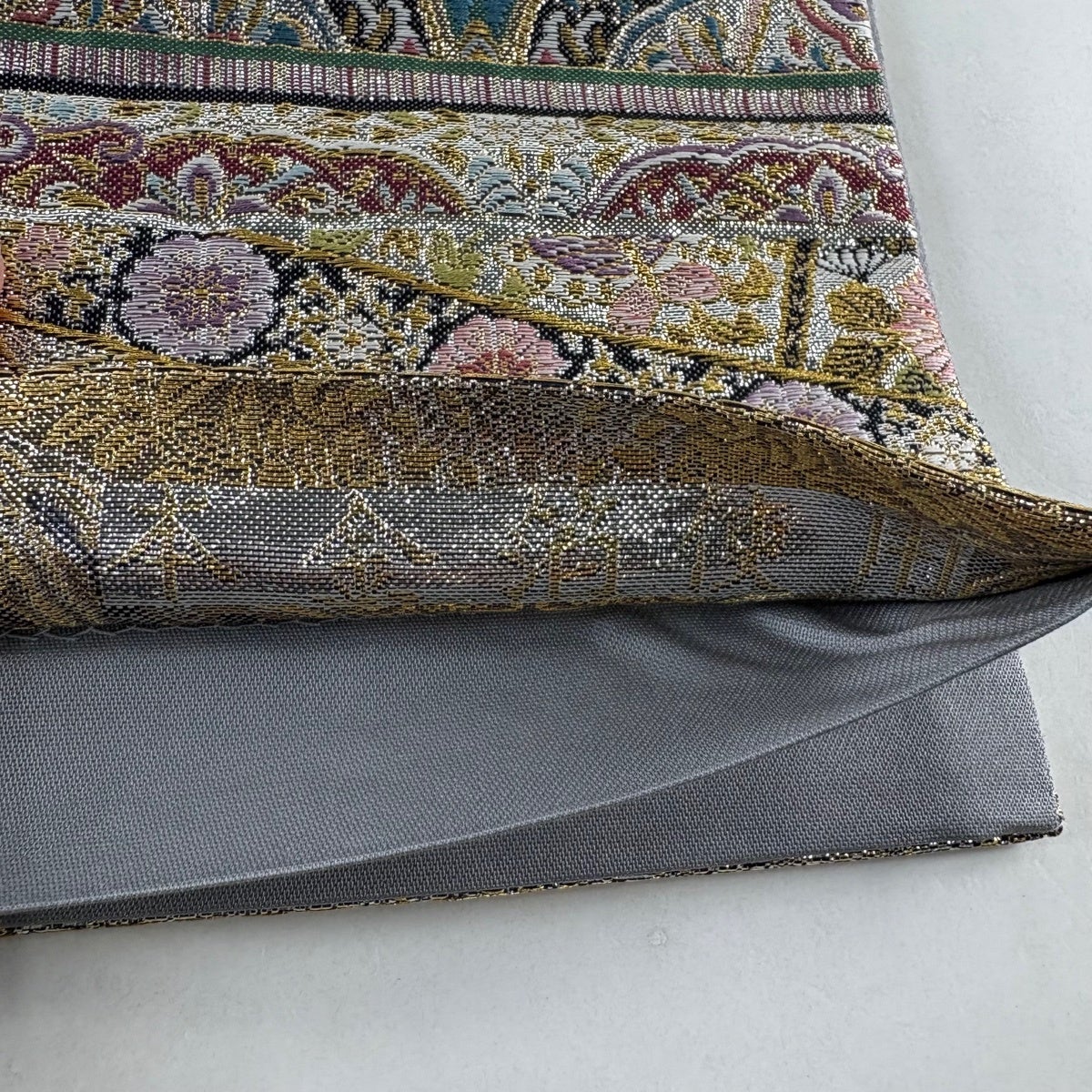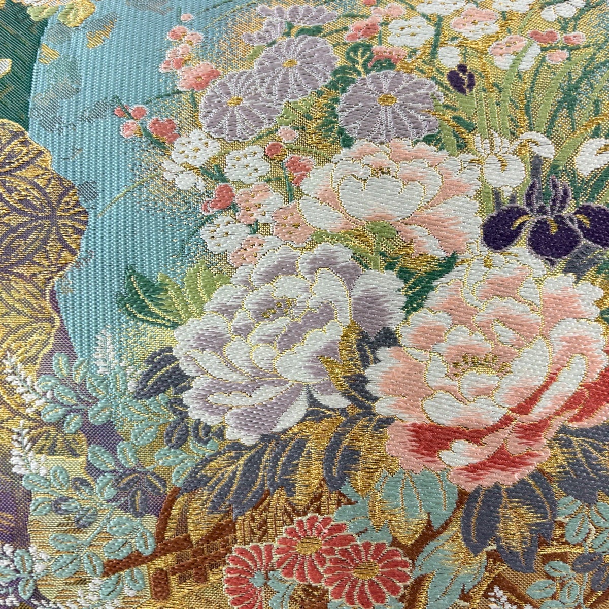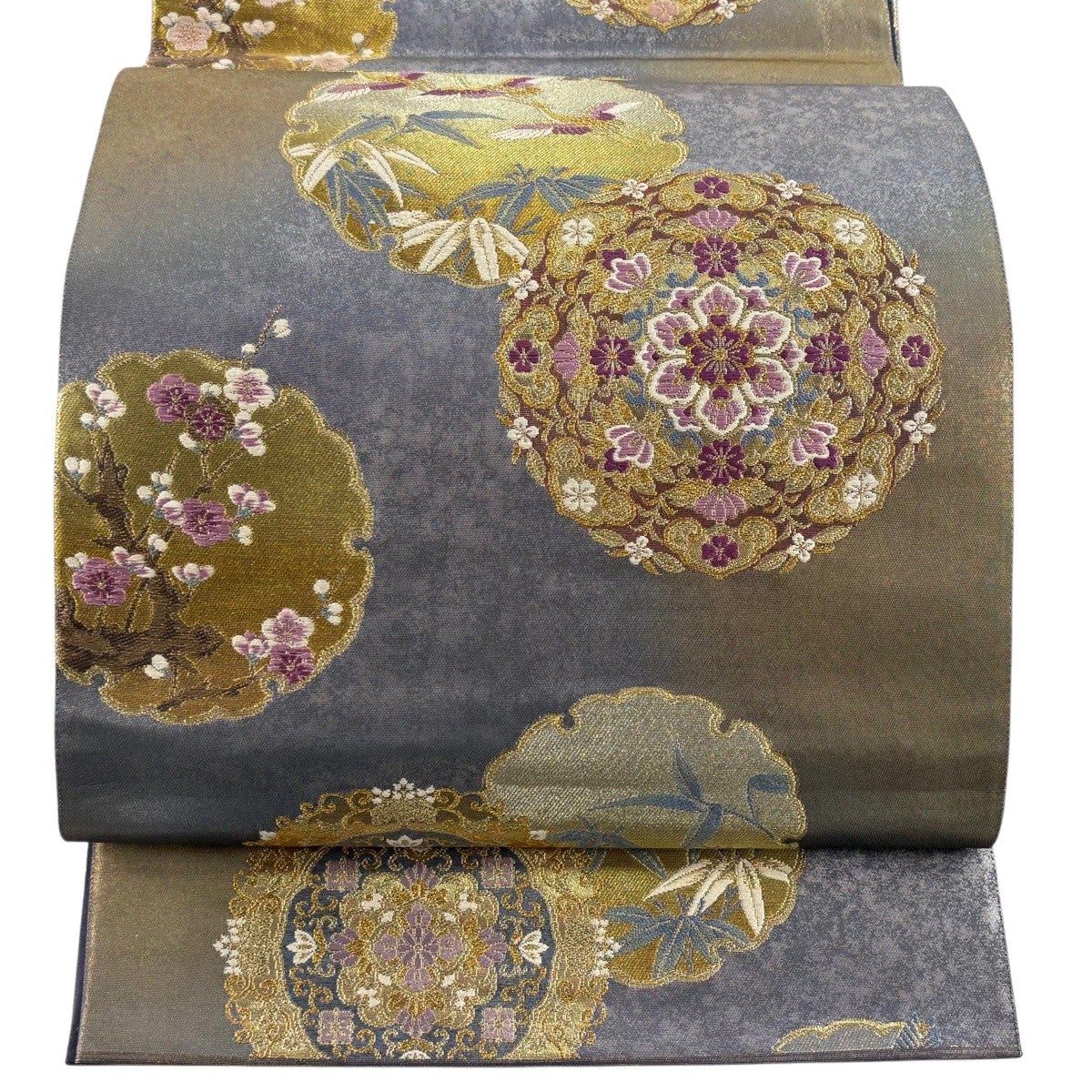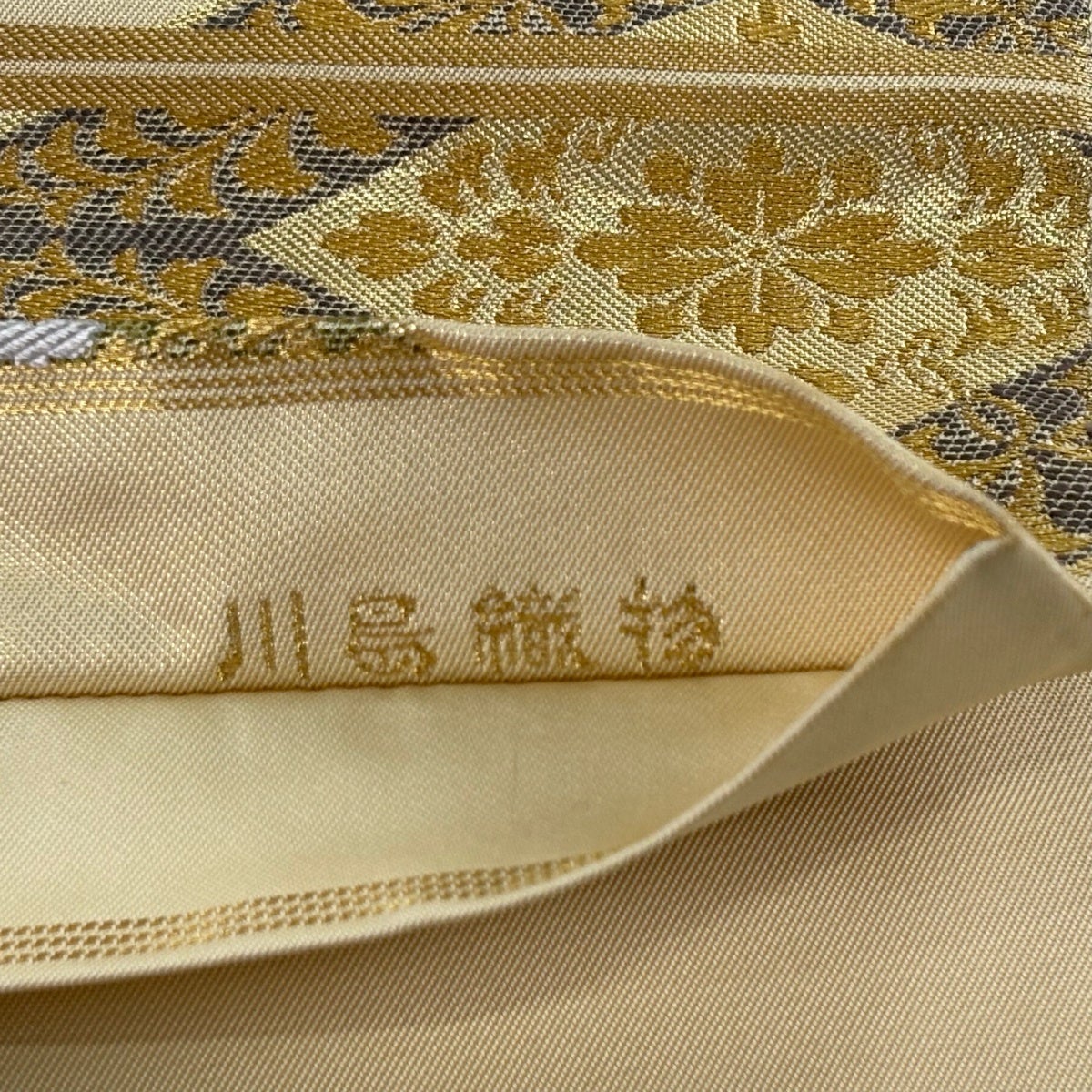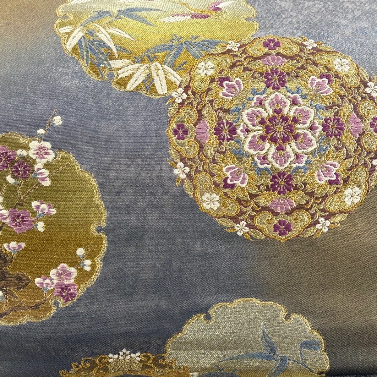 袋帯とは女性用の主にフォーマル用の帯で第一礼装として着用されることが多く、形状は表地にのみ柄があり裏地は無地になるように袋状に織って作成されたため袋帯という名が付きました。 帯を締める際にはおめでたいことが重なりますようにという願いが込められている二重太鼓や成人式の際に振袖に見かけるふくら雀や文庫結びなどの変わり結びを用いて着用します。