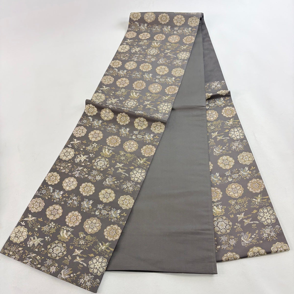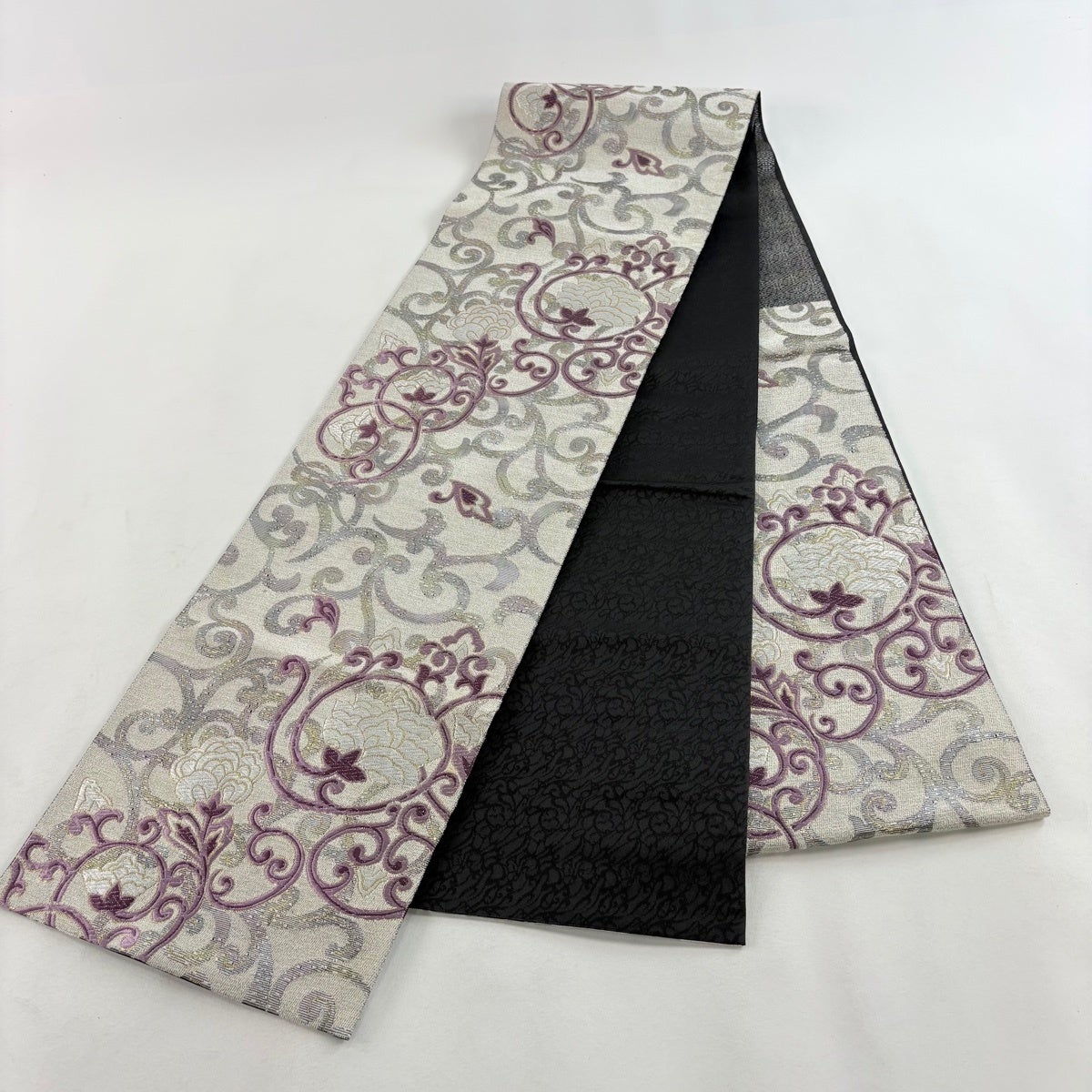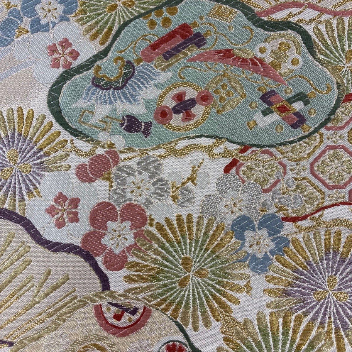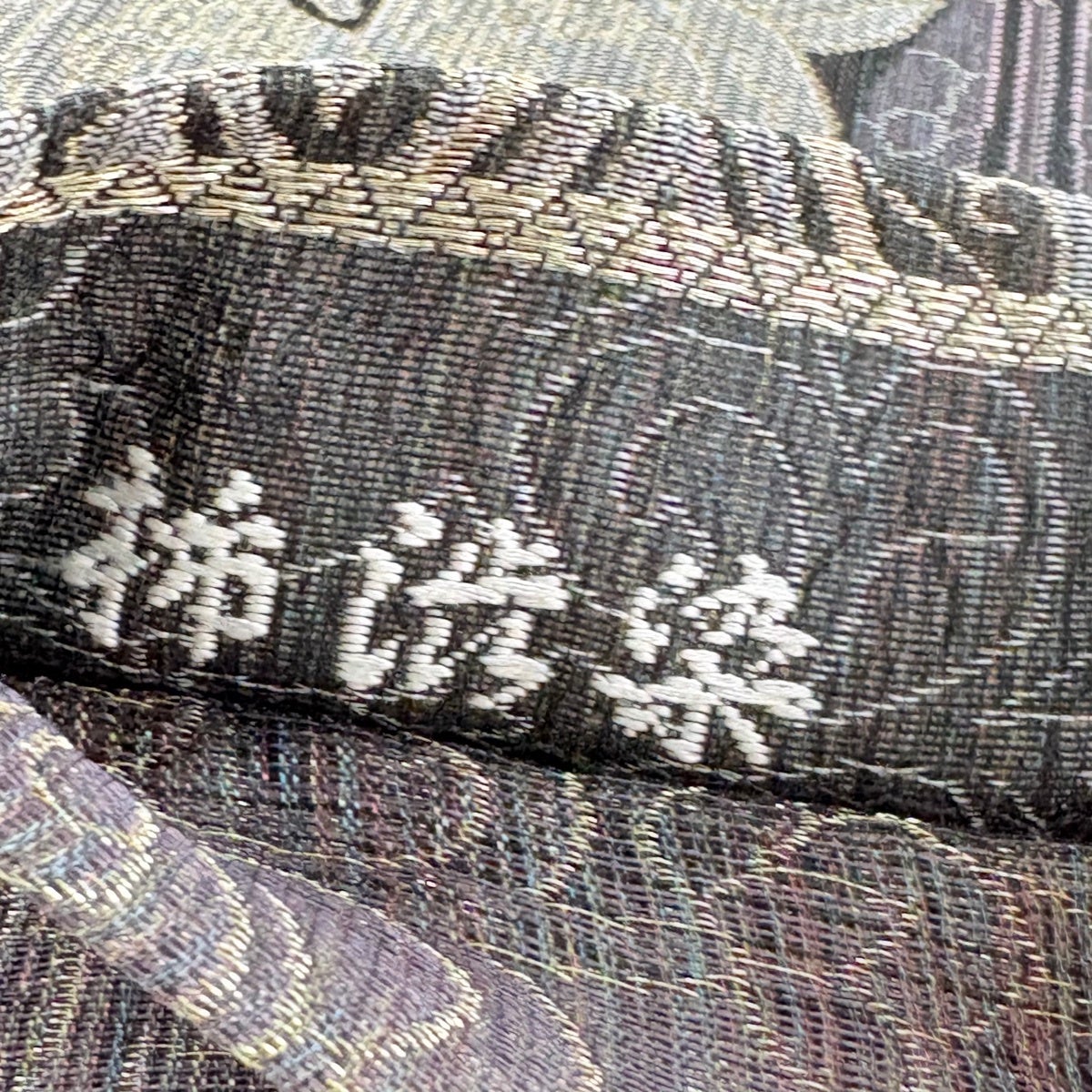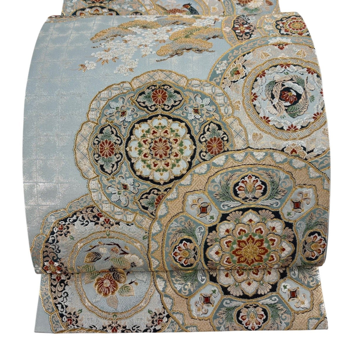 袋帯とは女性用の主にフォーマル用の帯で第一礼装として着用されることが多く、形状は表地にのみ柄があり裏地は無地になるように袋状に織って作成されたため袋帯という名が付きました。 帯を締める際にはおめでたいことが重なりますようにという願いが込められている二重太鼓や成人式の際に振袖に見かけるふくら雀や文庫結びなどの変わり結びを用いて着用します。