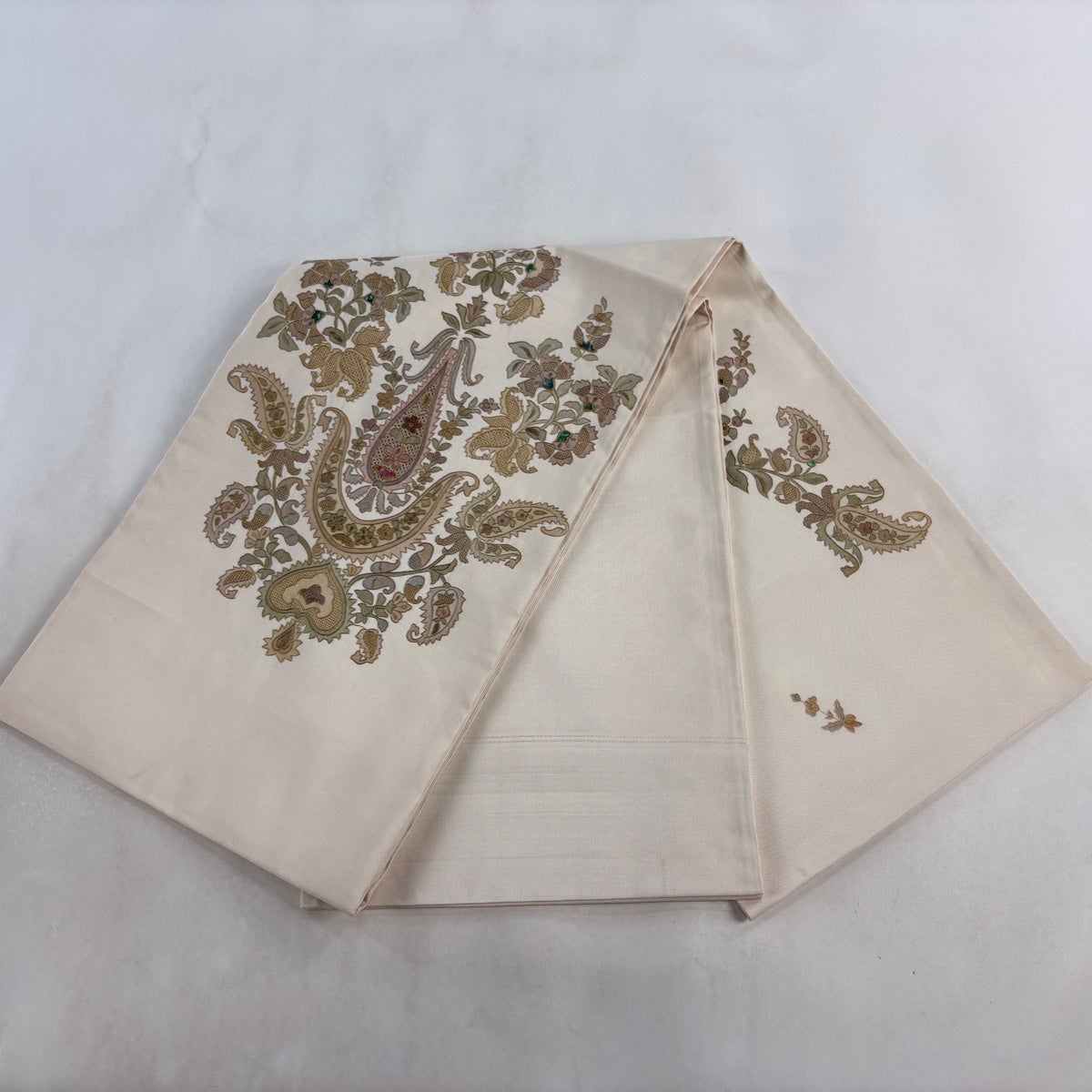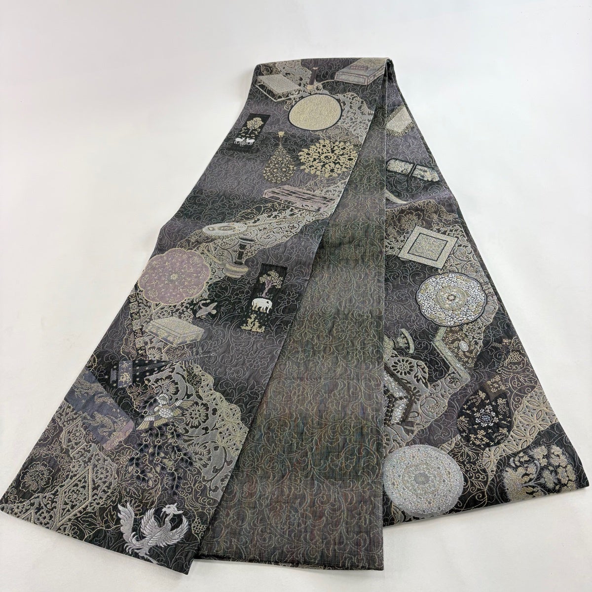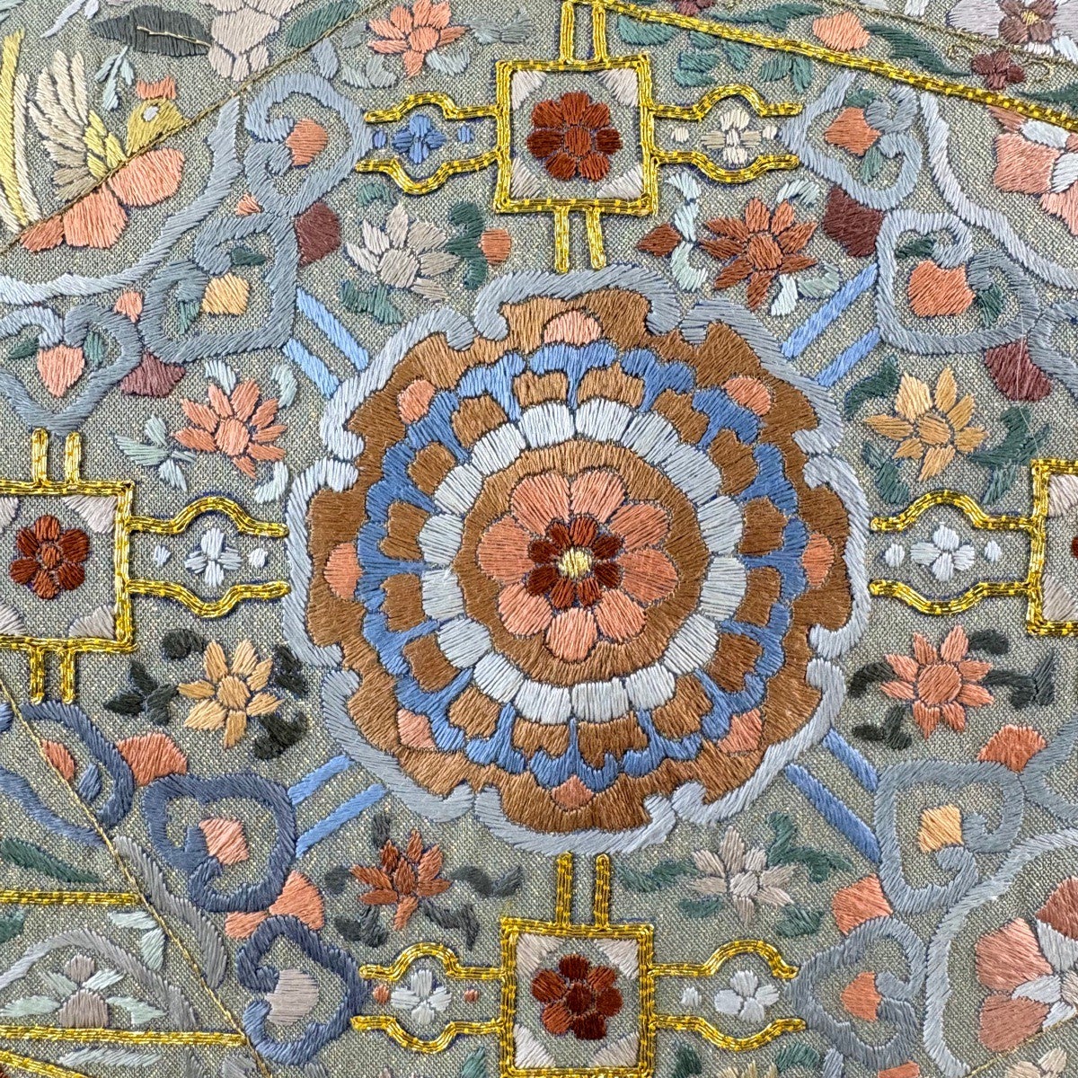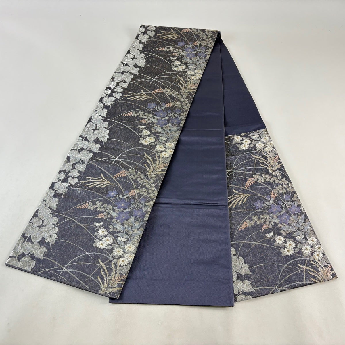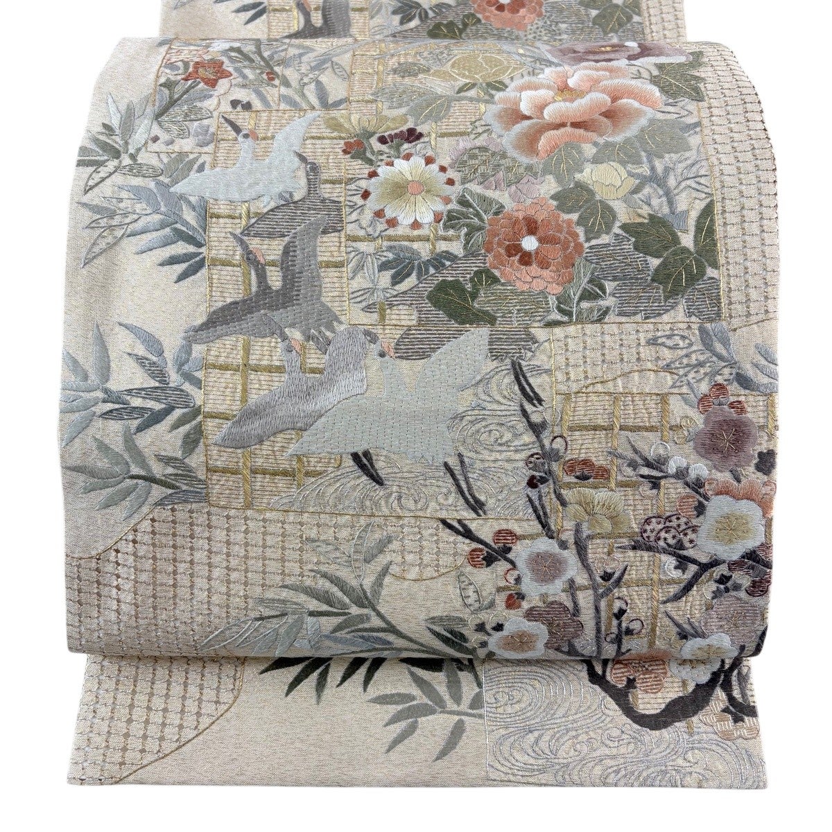 袋帯とは女性用の主にフォーマル用の帯で第一礼装として着用されることが多く、形状は表地にのみ柄があり裏地は無地になるように袋状に織って作成されたため袋帯という名が付きました。 帯を締める際にはおめでたいことが重なりますようにという願いが込められている二重太鼓や成人式の際に振袖に見かけるふくら雀や文庫結びなどの変わり結びを用いて着用します。