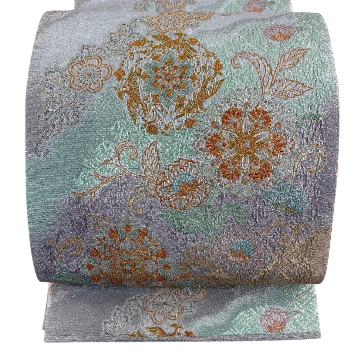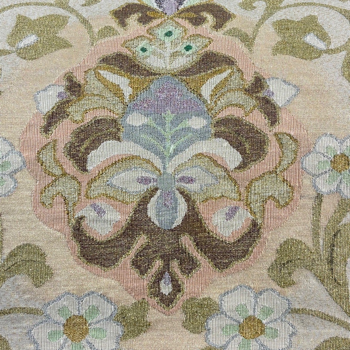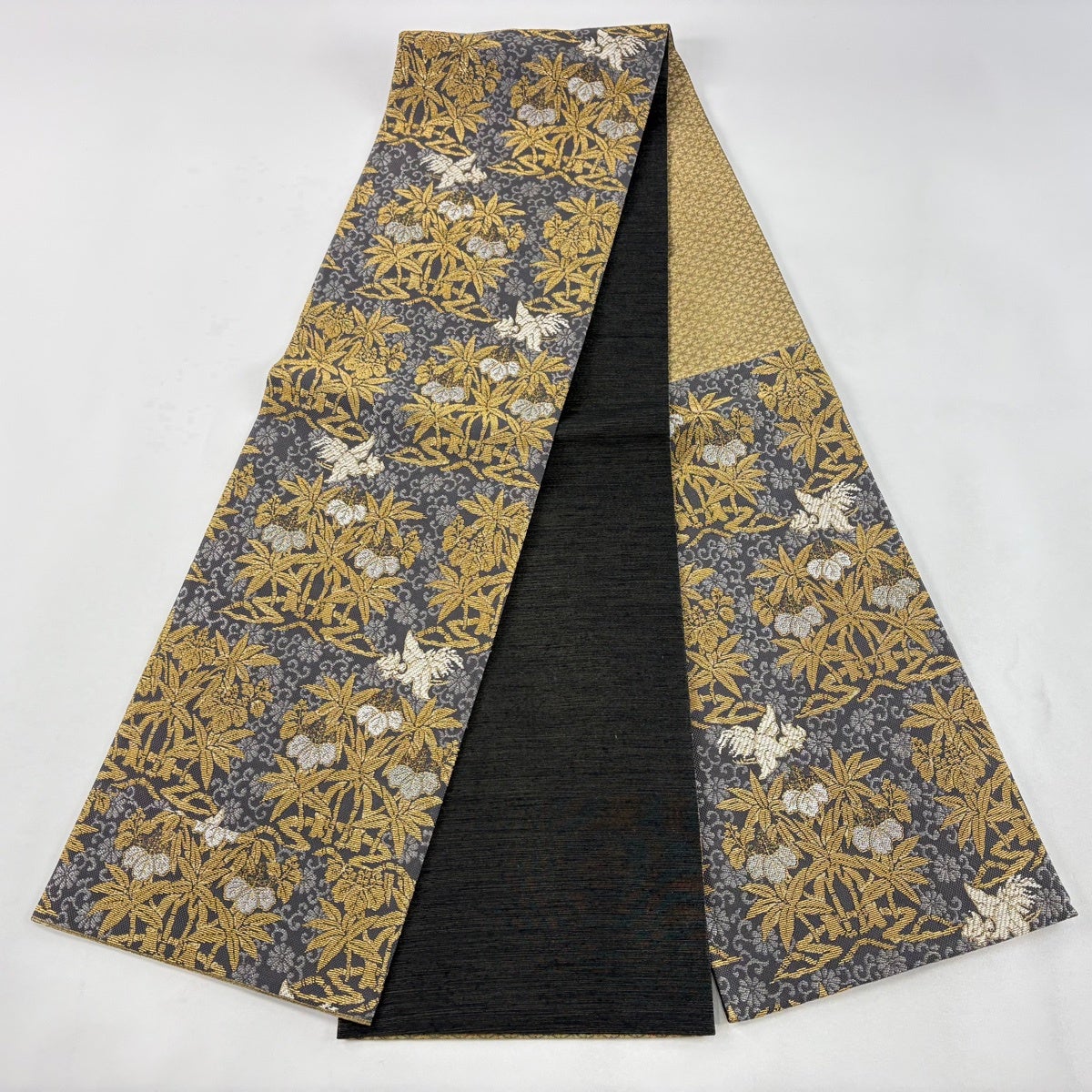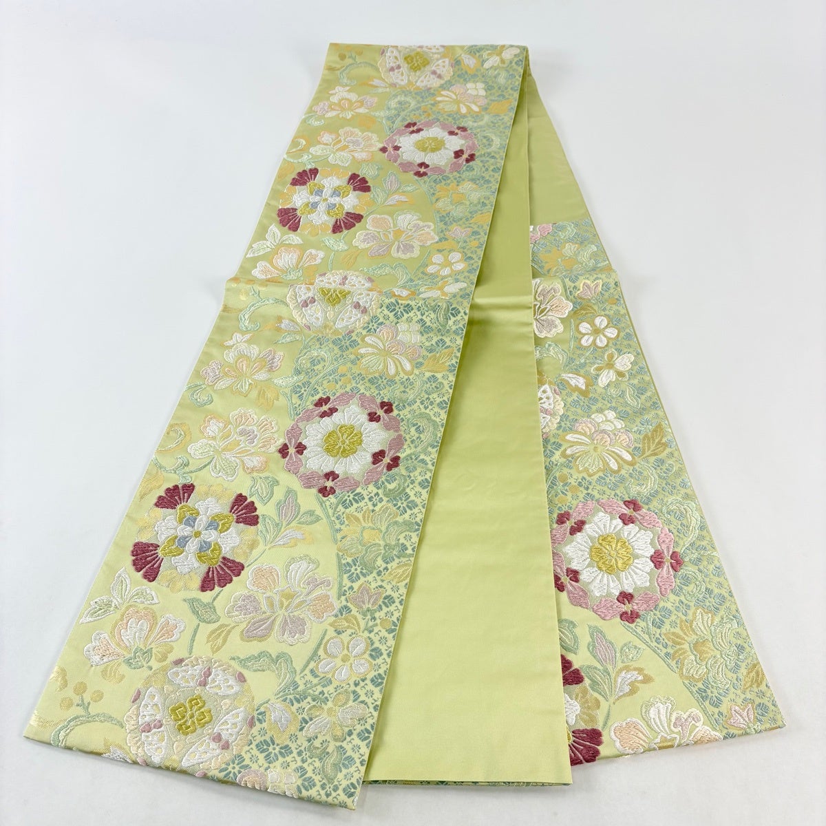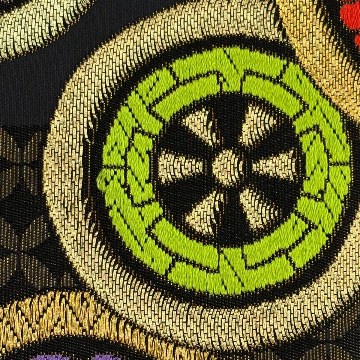 袋帯とは女性用の主にフォーマル用の帯で第一礼装として着用されることが多く、形状は表地にのみ柄があり裏地は無地になるように袋状に織って作成されたため袋帯という名が付きました。 帯を締める際にはおめでたいことが重なりますようにという願いが込められている二重太鼓や成人式の際に振袖に見かけるふくら雀や文庫結びなどの変わり結びを用いて着用します。