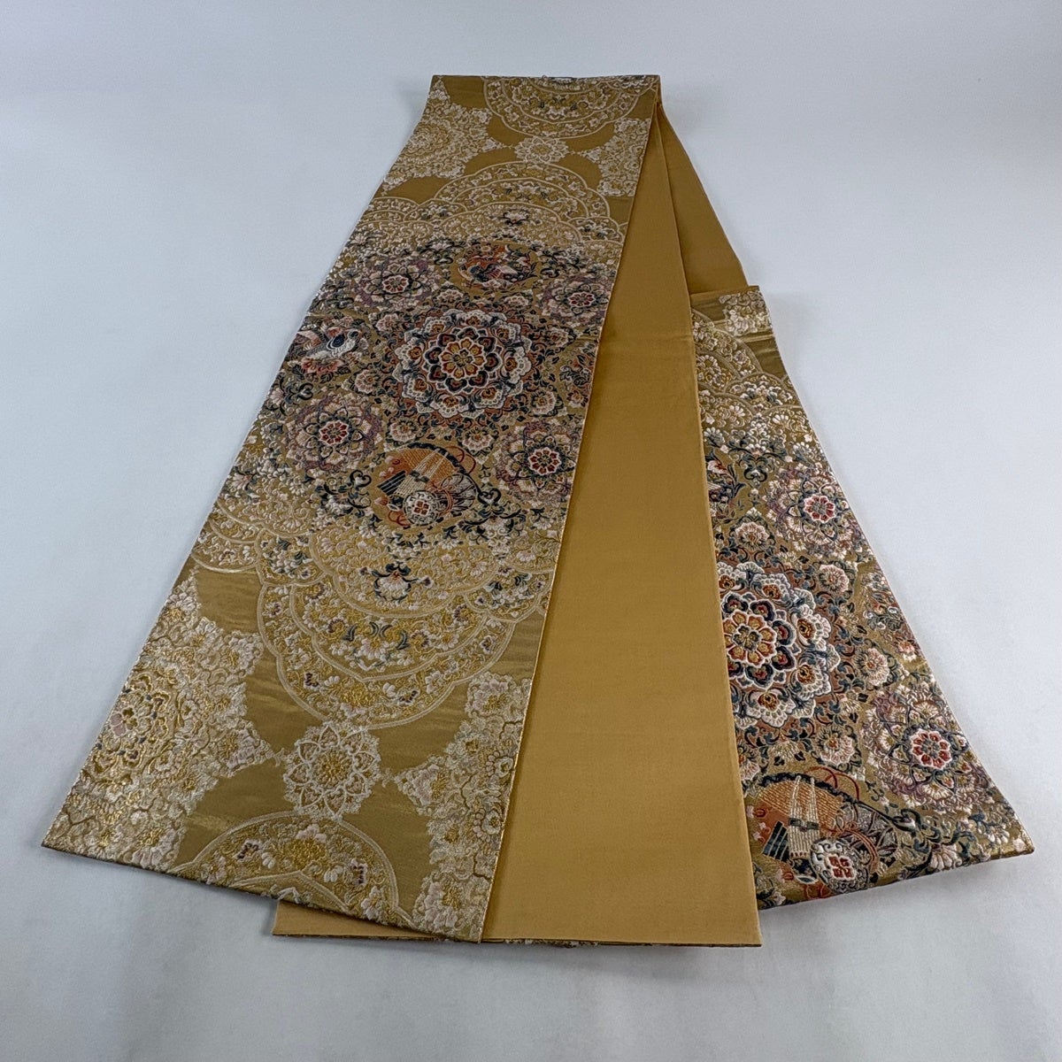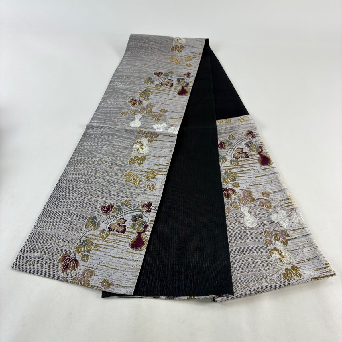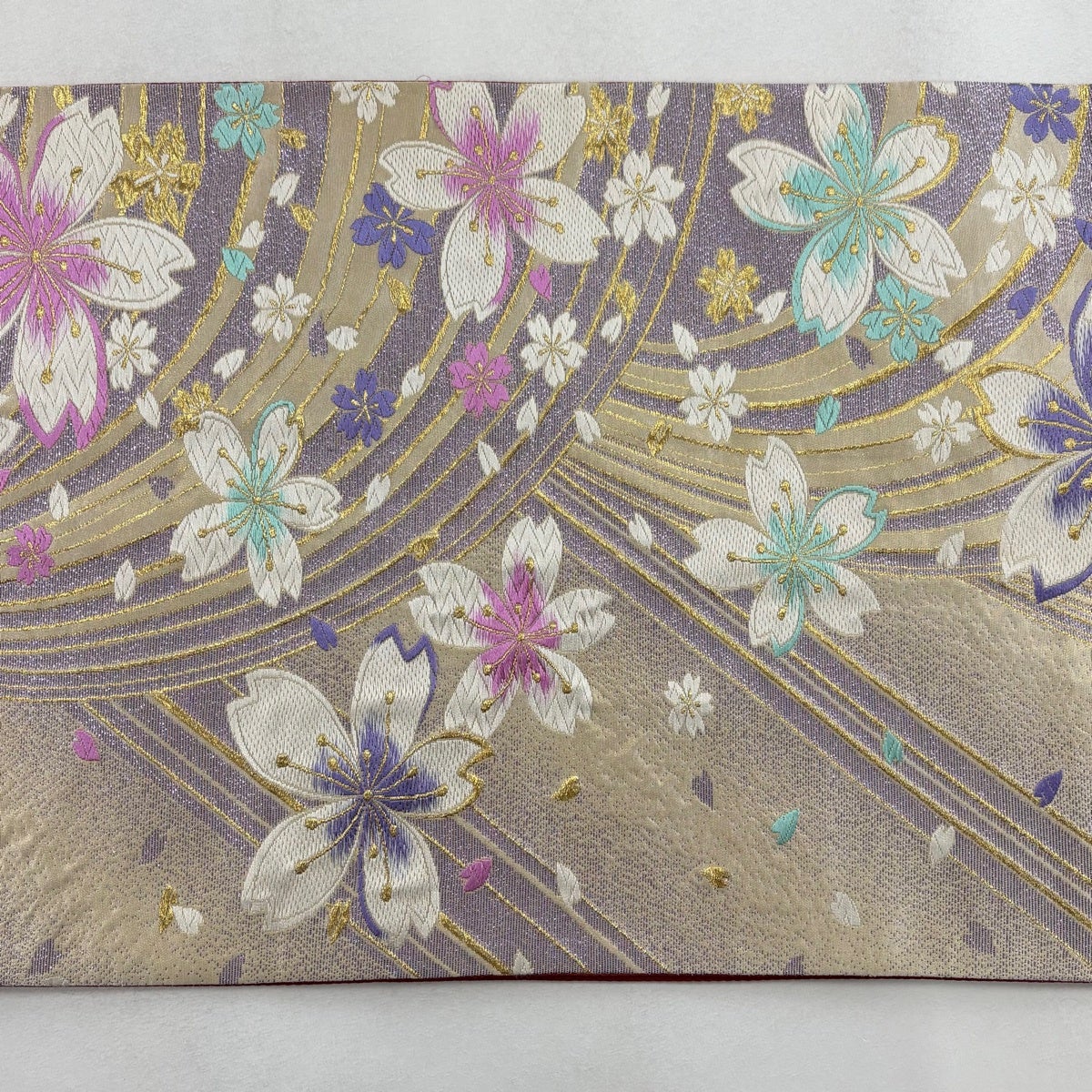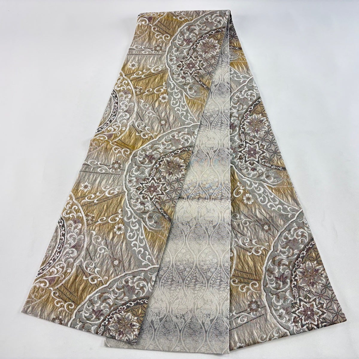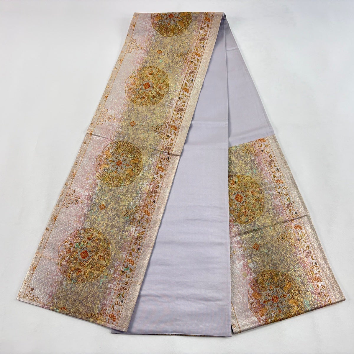 袋帯とは女性用の主にフォーマル用の帯で第一礼装として着用されることが多く、形状は表地にのみ柄があり裏地は無地になるように袋状に織って作成されたため袋帯という名が付きました。 帯を締める際にはおめでたいことが重なりますようにという願いが込められている二重太鼓や成人式の際に振袖に見かけるふくら雀や文庫結びなどの変わり結びを用いて着用します。