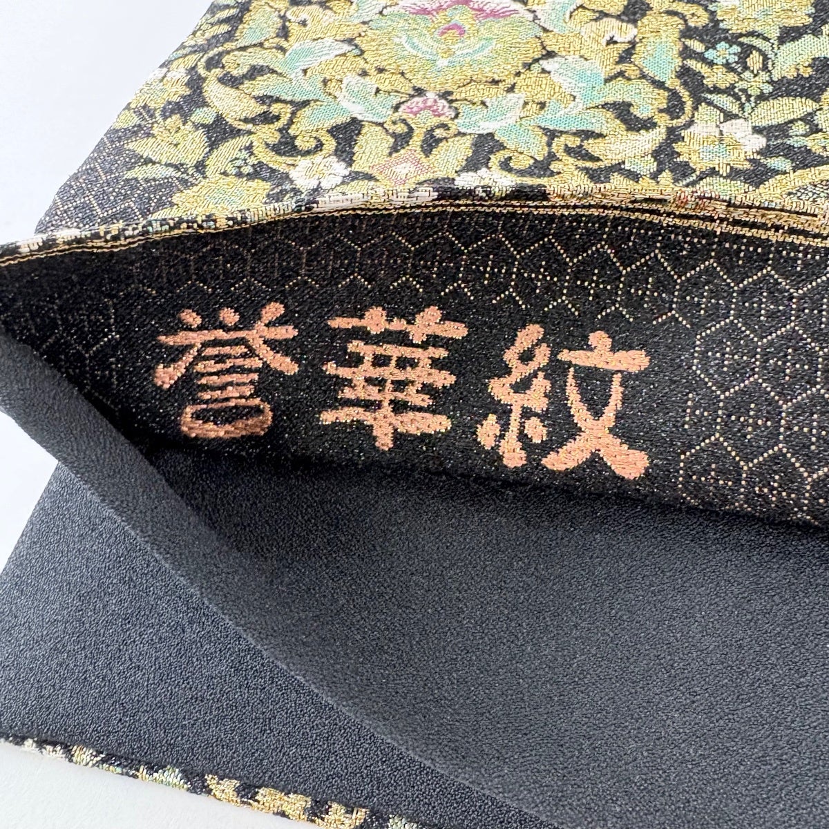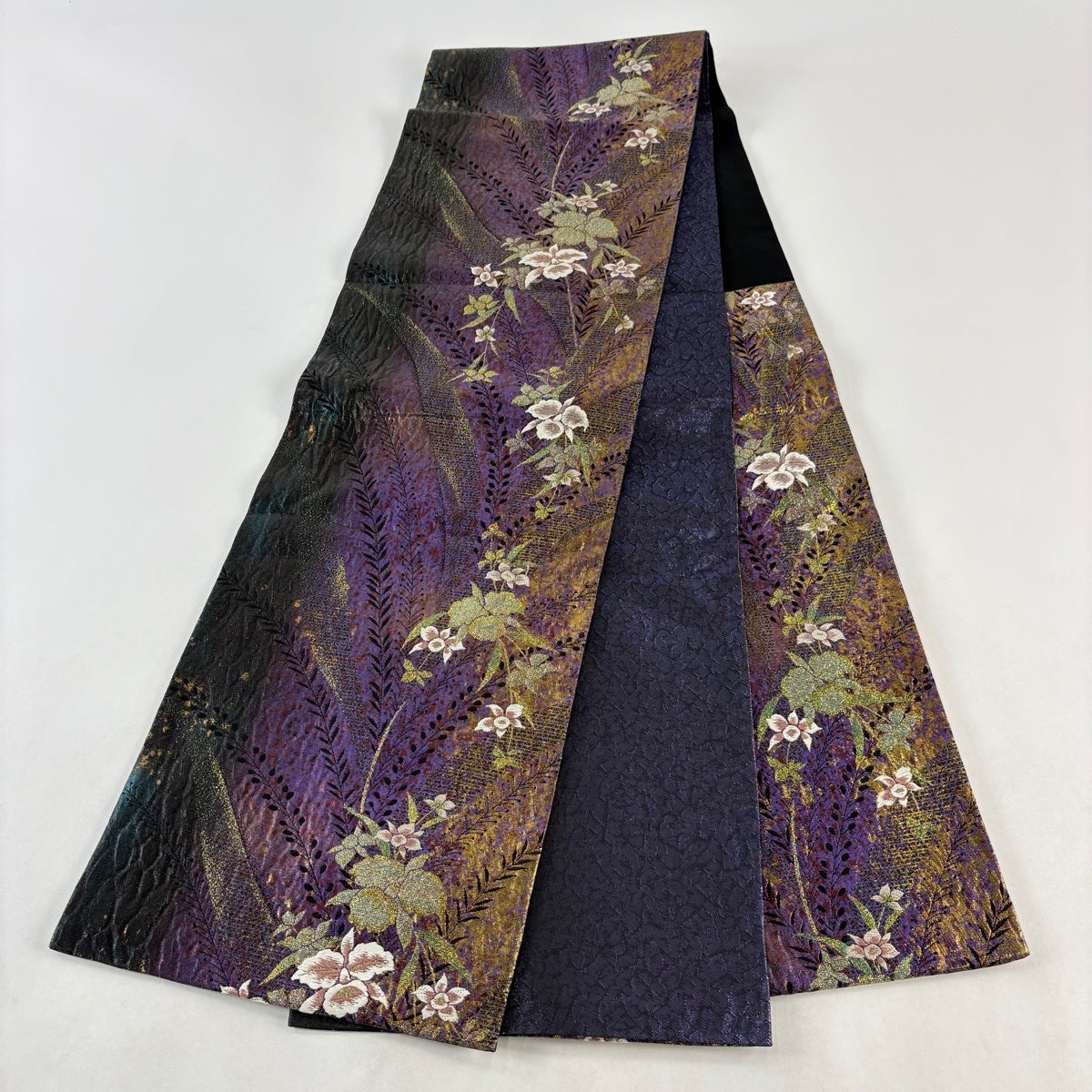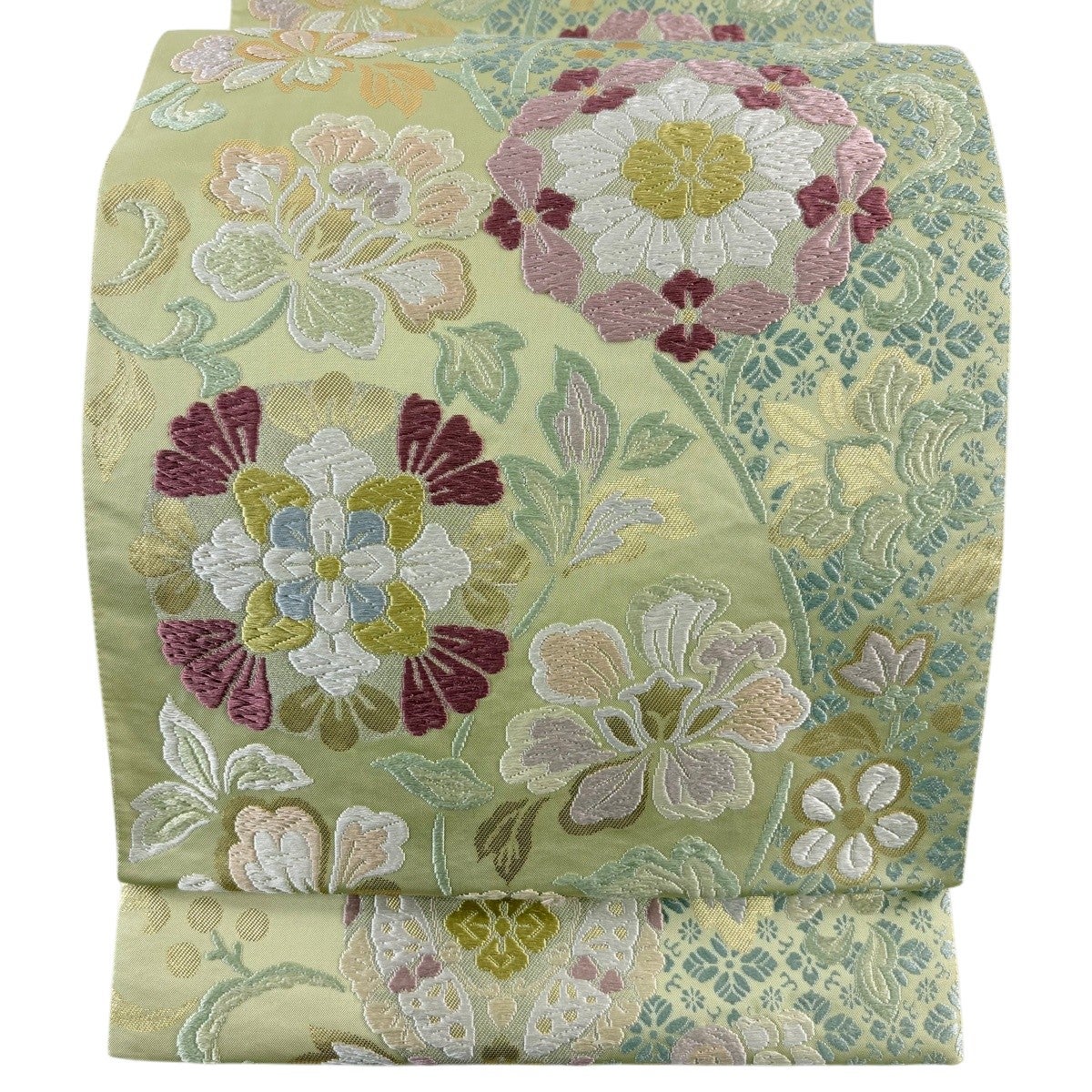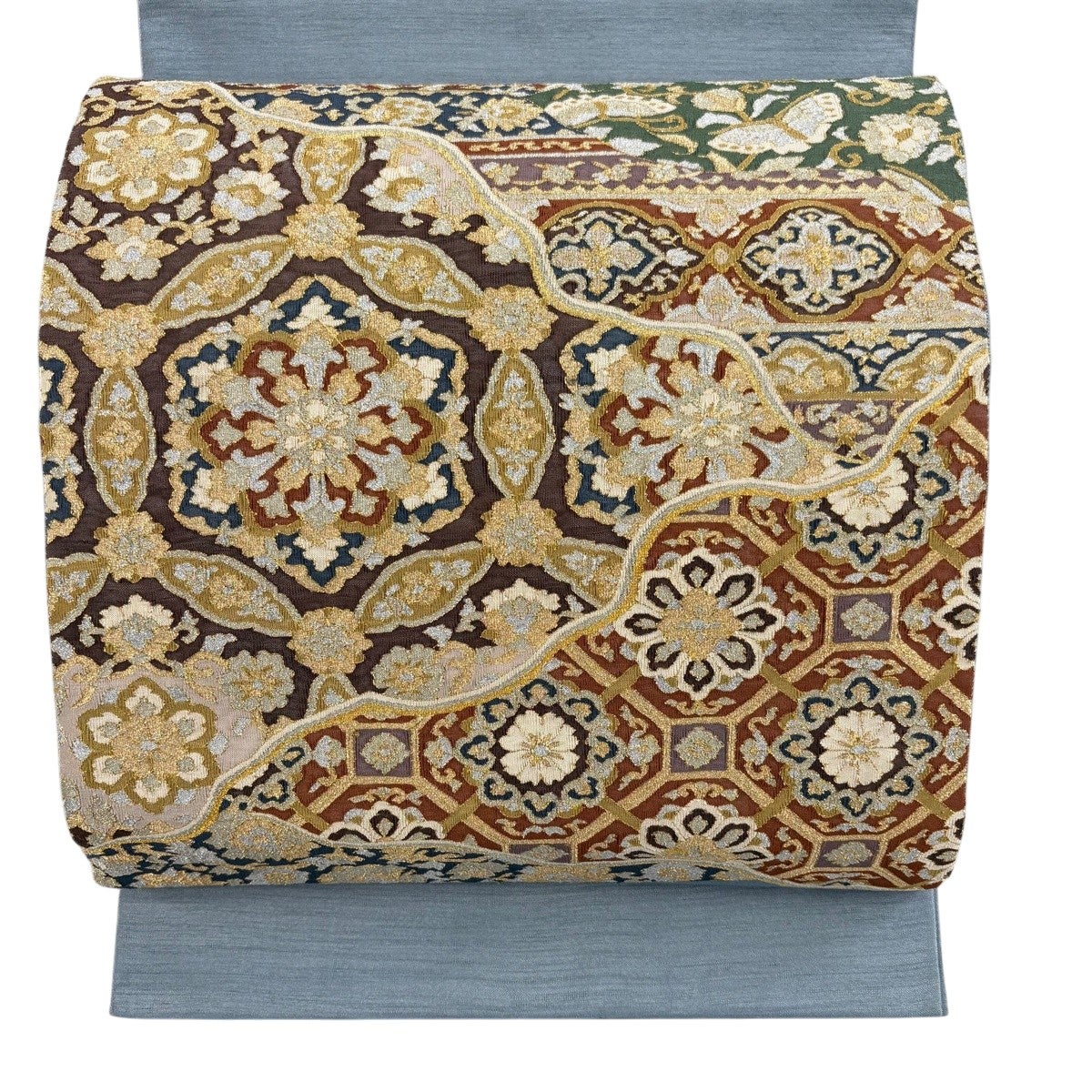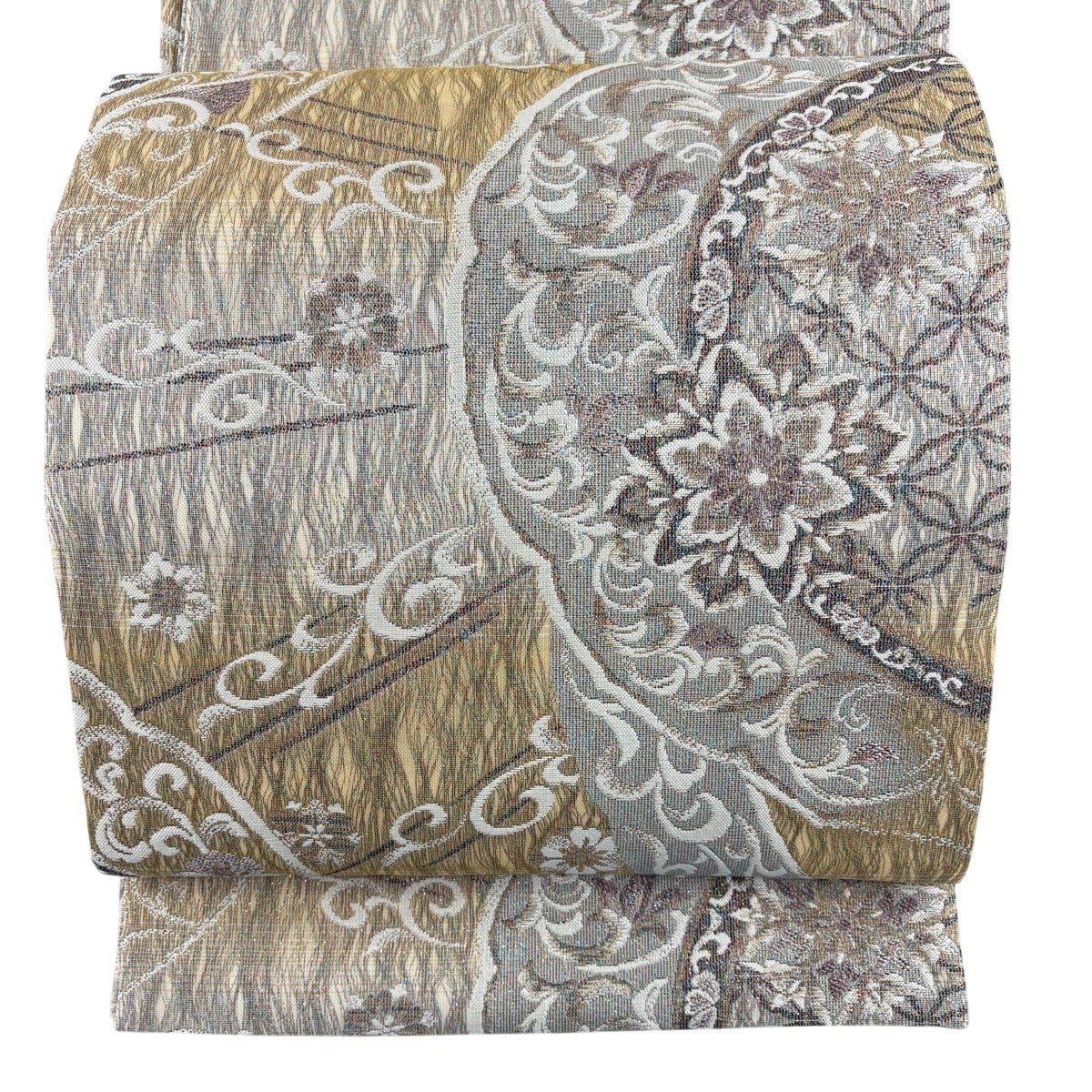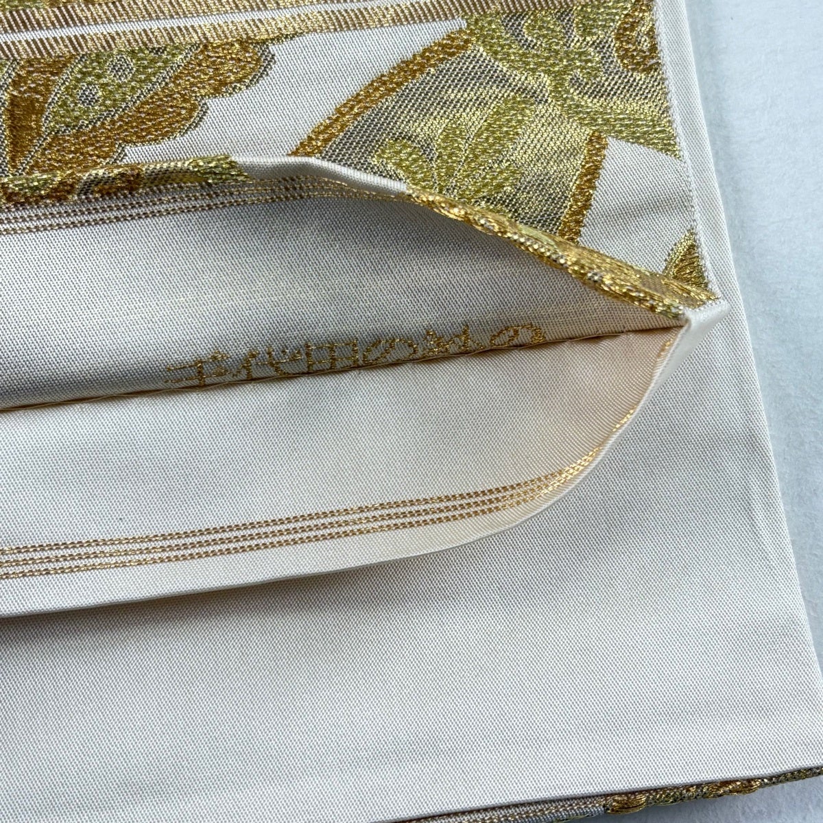袋帯とは女性用の主にフォーマル用の帯で第一礼装として着用されることが多く、形状は表地にのみ柄があり裏地は無地になるように袋状に織って作成されたため袋帯という名が付きました。 帯を締める際にはおめでたいことが重なりますようにという願いが込められている二重太鼓や成人式の際に振袖に見かけるふくら雀や文庫結びなどの変わり結びを用いて着用します。