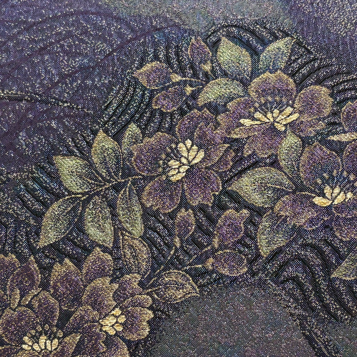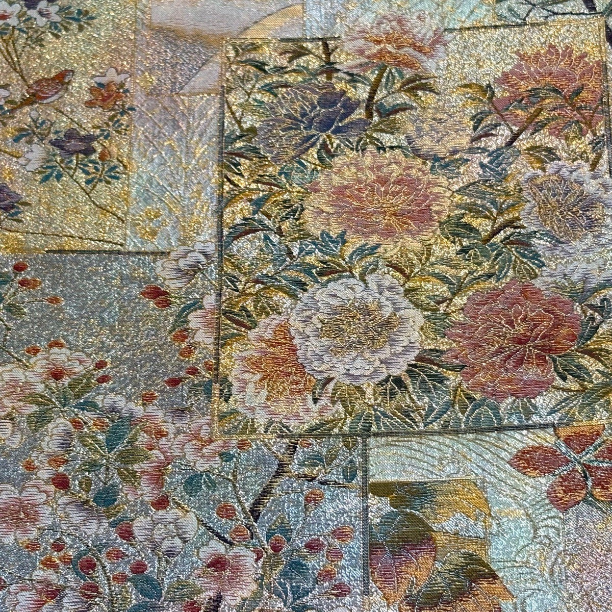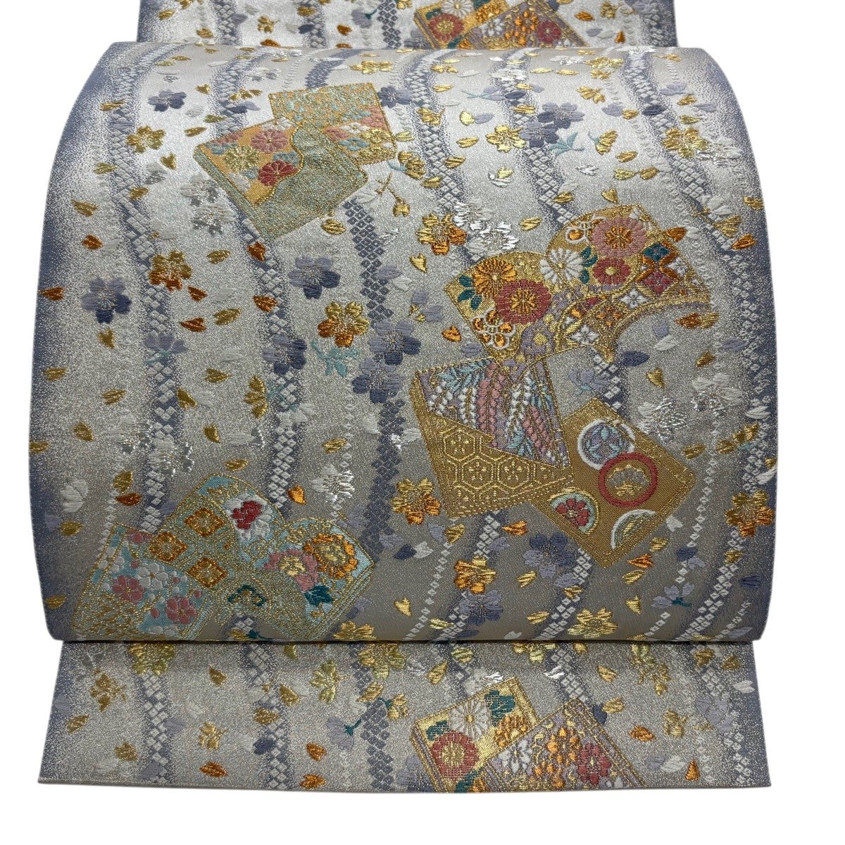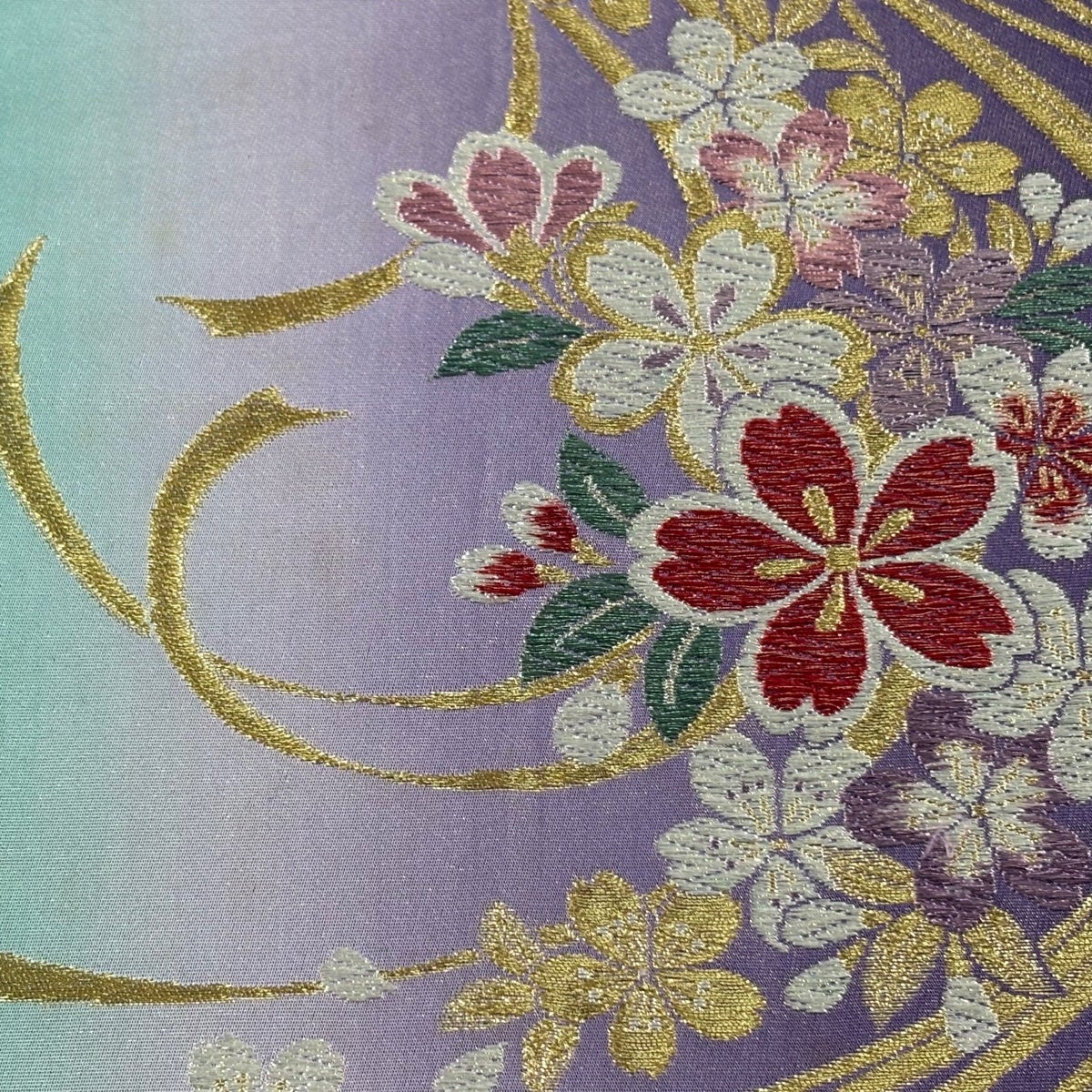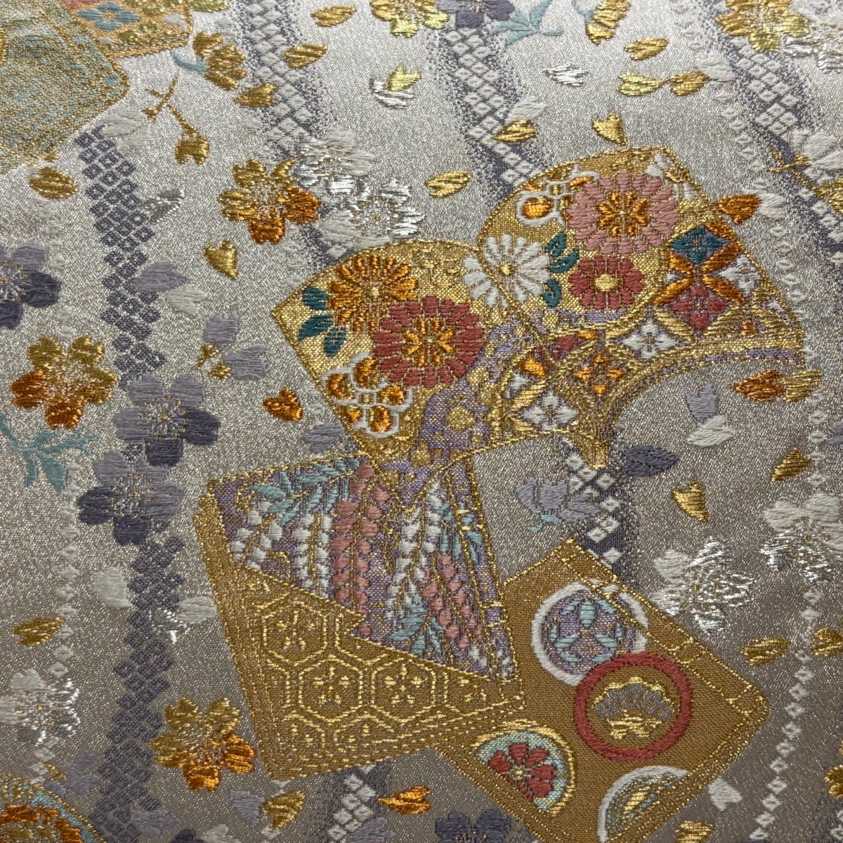 袋帯とは女性用の主にフォーマル用の帯で第一礼装として着用されることが多く、形状は表地にのみ柄があり裏地は無地になるように袋状に織って作成されたため袋帯という名が付きました。 帯を締める際にはおめでたいことが重なりますようにという願いが込められている二重太鼓や成人式の際に振袖に見かけるふくら雀や文庫結びなどの変わり結びを用いて着用します。