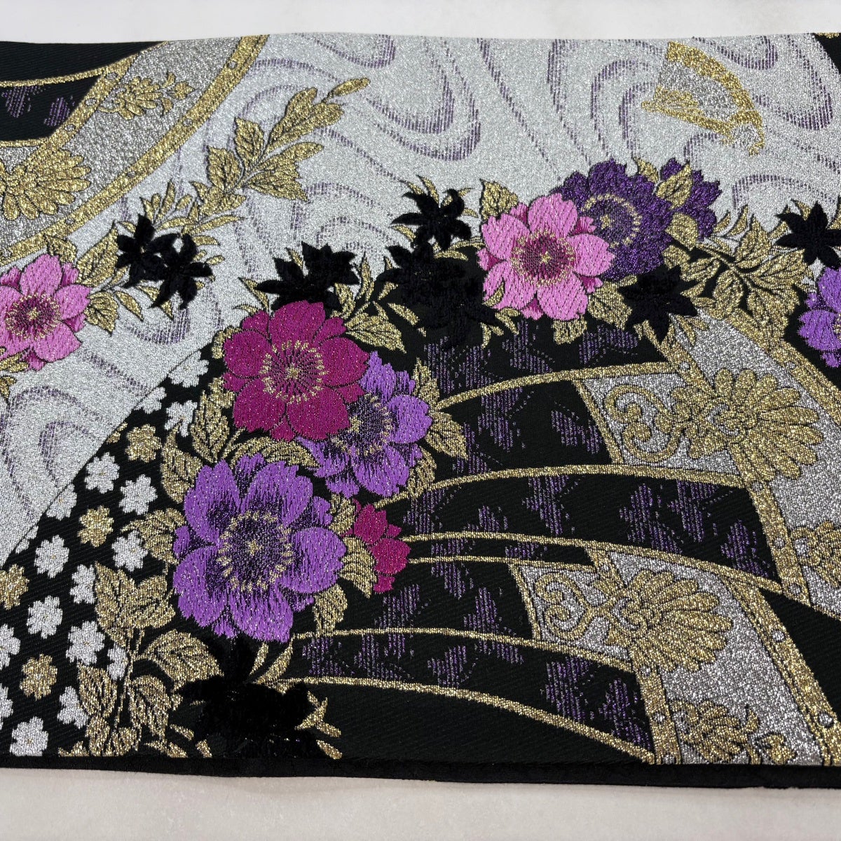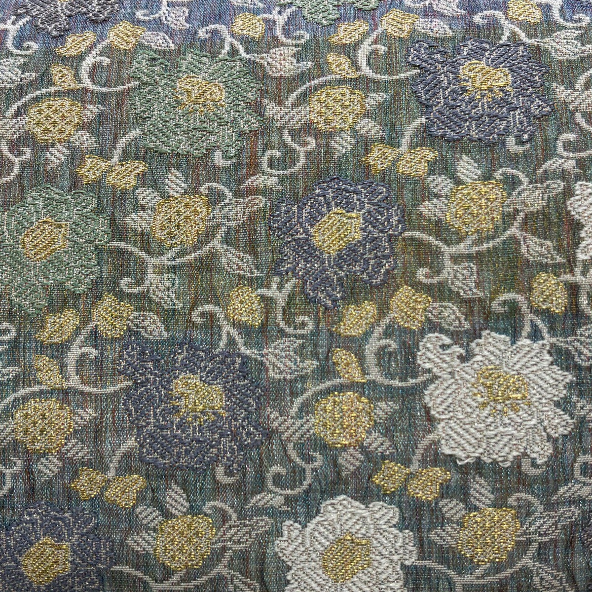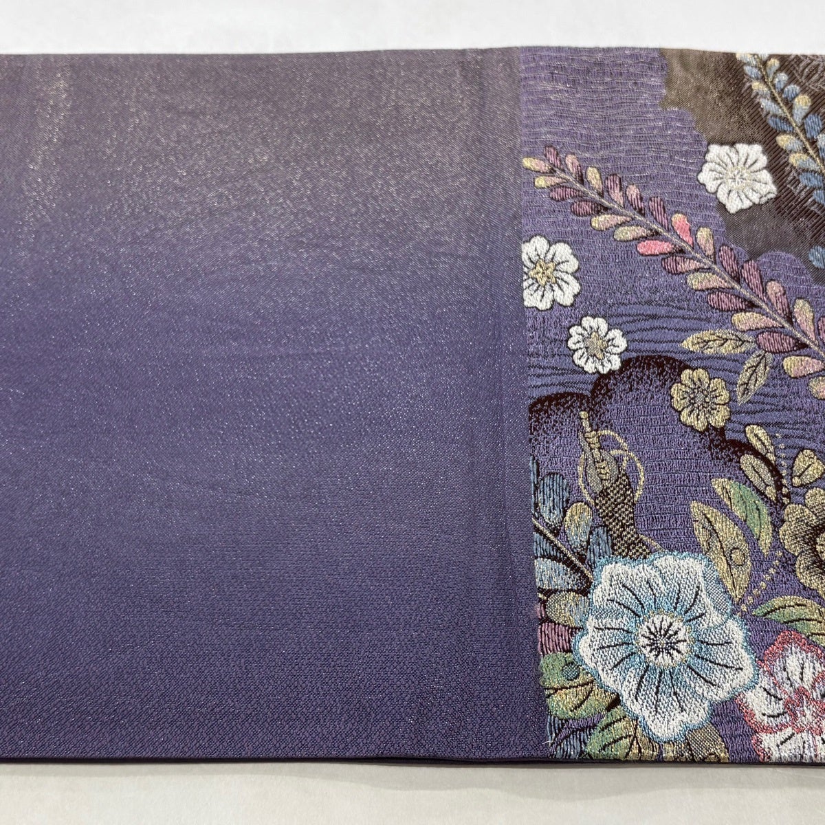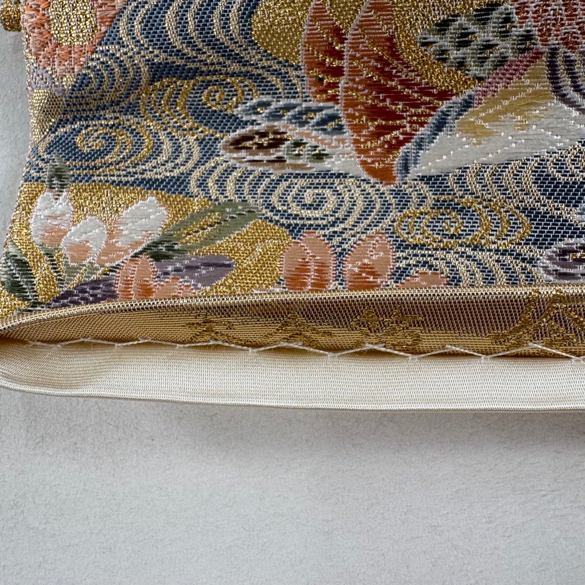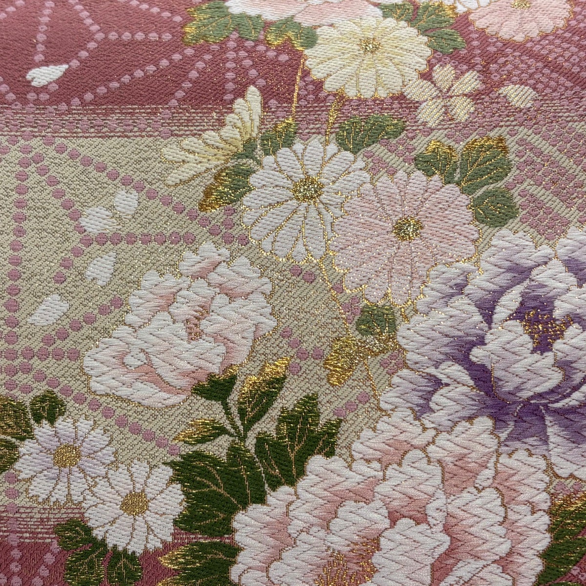 袋帯とは女性用の主にフォーマル用の帯で第一礼装として着用されることが多く、形状は表地にのみ柄があり裏地は無地になるように袋状に織って作成されたため袋帯という名が付きました。 帯を締める際にはおめでたいことが重なりますようにという願いが込められている二重太鼓や成人式の際に振袖に見かけるふくら雀や文庫結びなどの変わり結びを用いて着用します。