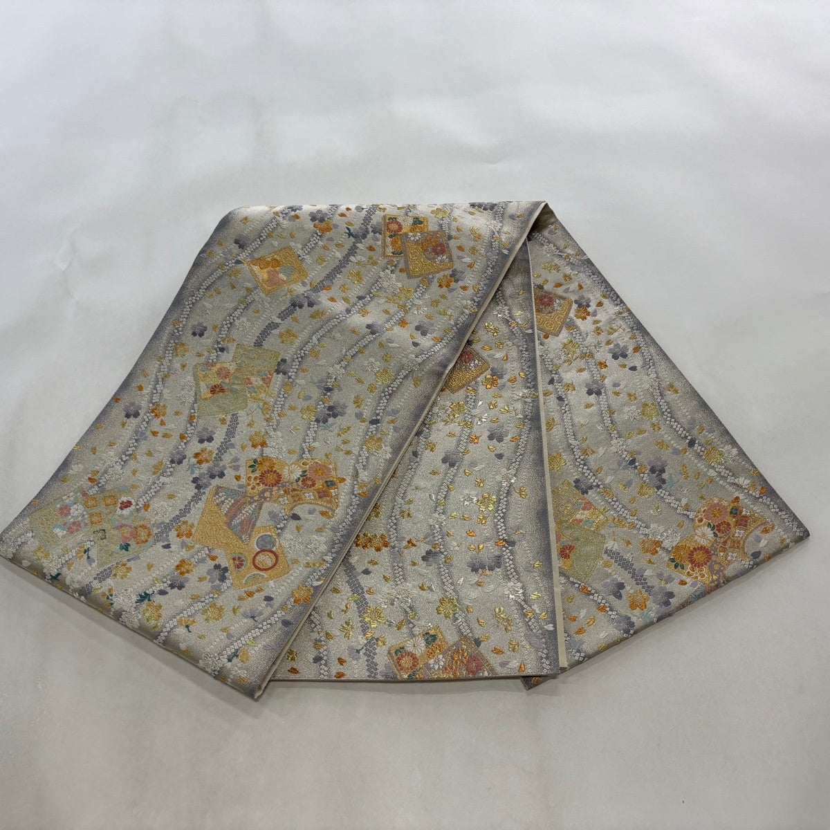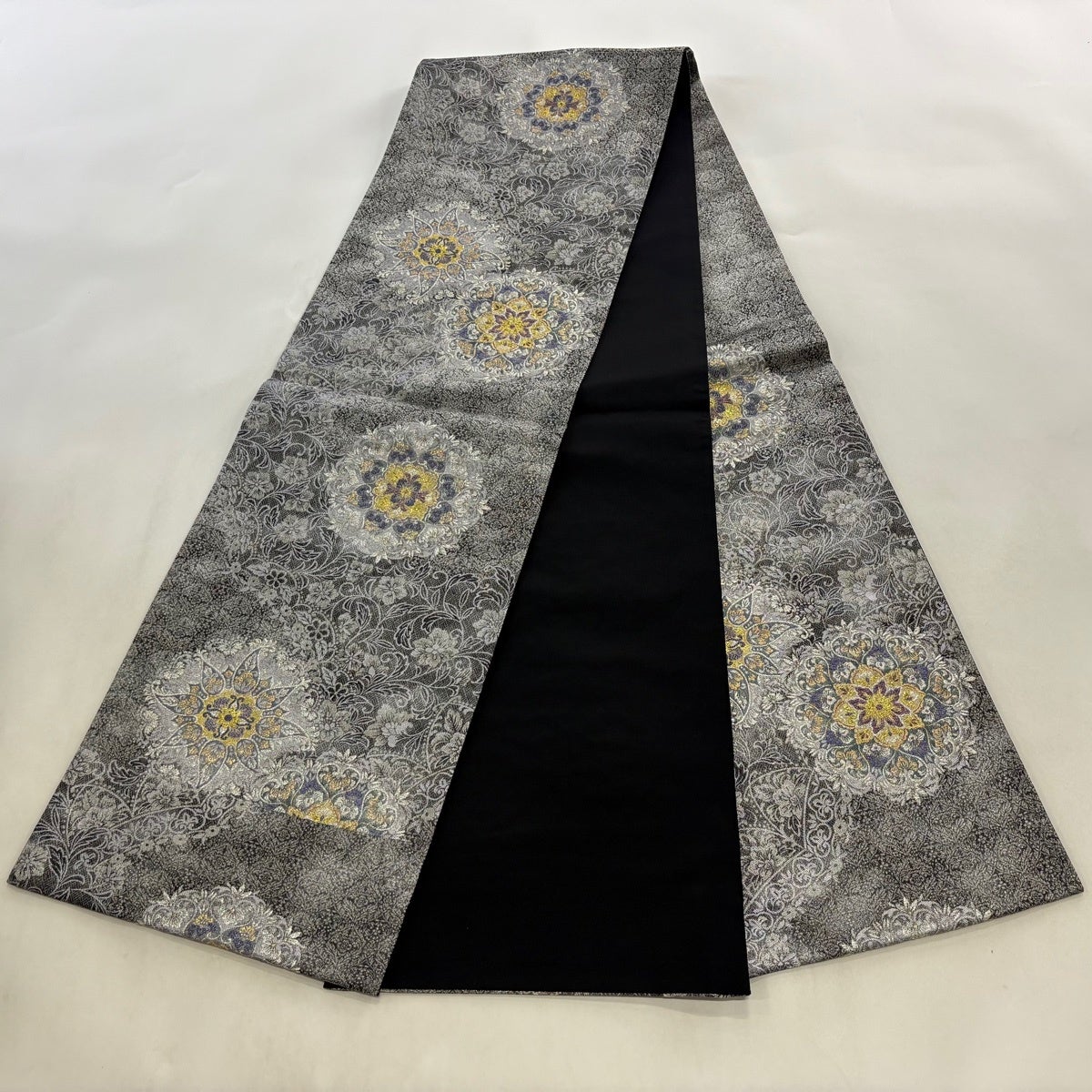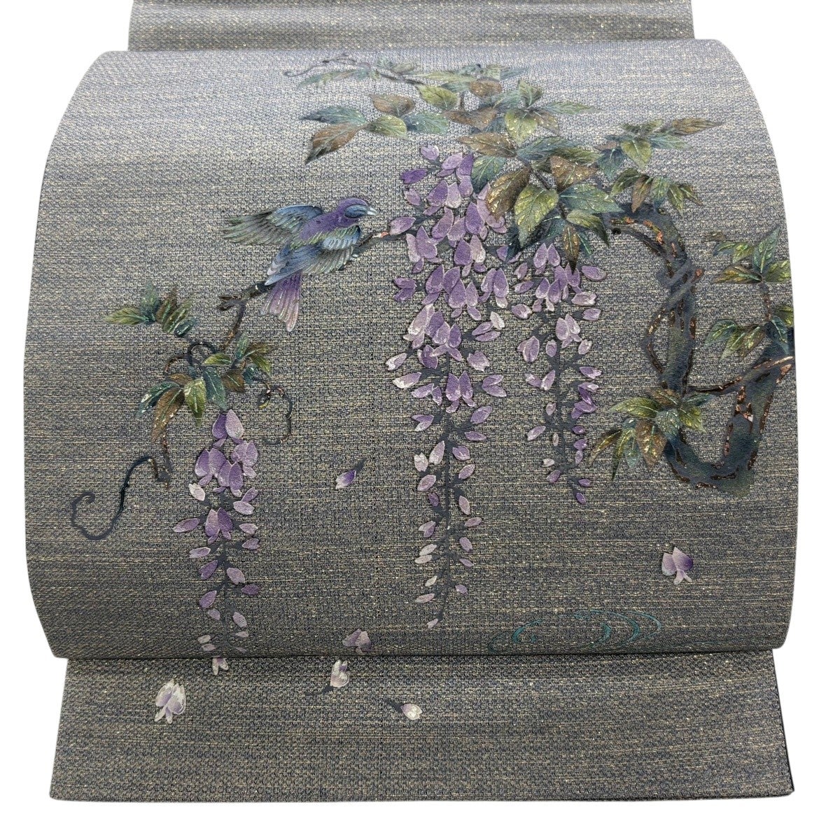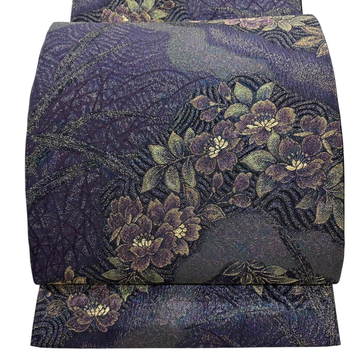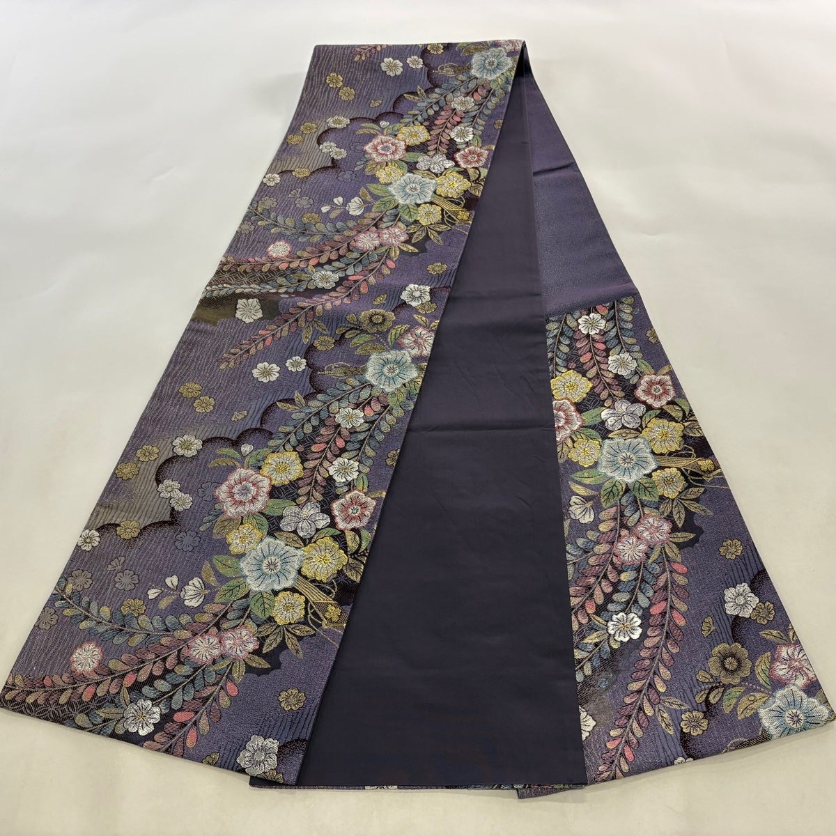 袋帯とは女性用の主にフォーマル用の帯で第一礼装として着用されることが多く、形状は表地にのみ柄があり裏地は無地になるように袋状に織って作成されたため袋帯という名が付きました。 帯を締める際にはおめでたいことが重なりますようにという願いが込められている二重太鼓や成人式の際に振袖に見かけるふくら雀や文庫結びなどの変わり結びを用いて着用します。