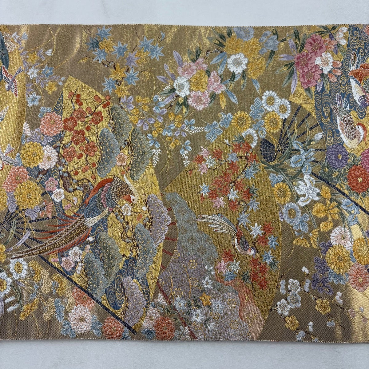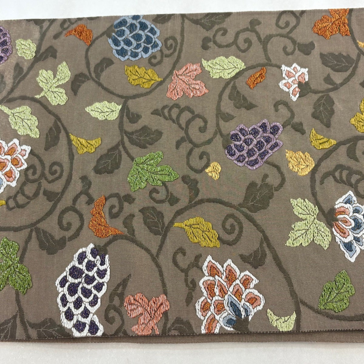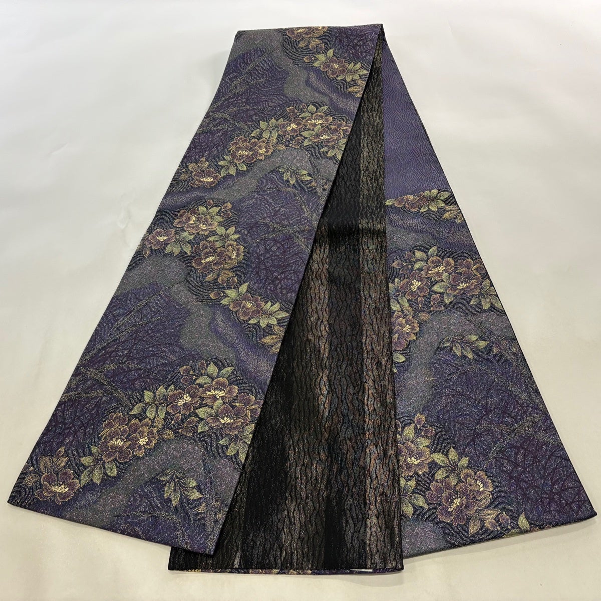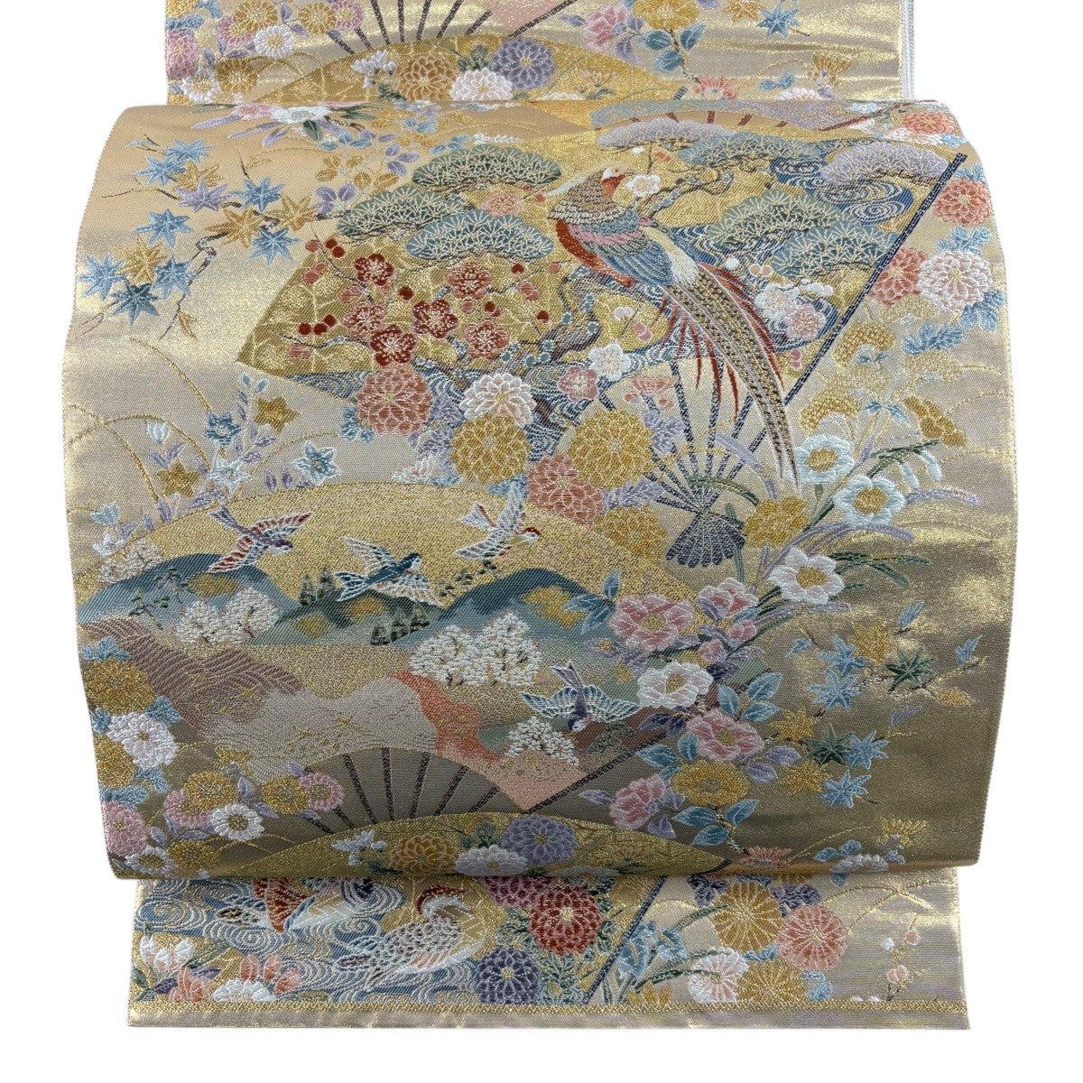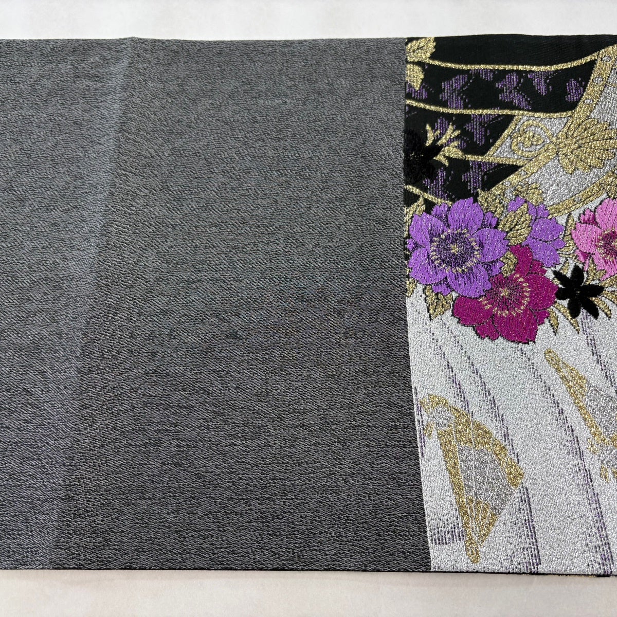 袋帯とは女性用の主にフォーマル用の帯で第一礼装として着用されることが多く、形状は表地にのみ柄があり裏地は無地になるように袋状に織って作成されたため袋帯という名が付きました。 帯を締める際にはおめでたいことが重なりますようにという願いが込められている二重太鼓や成人式の際に振袖に見かけるふくら雀や文庫結びなどの変わり結びを用いて着用します。