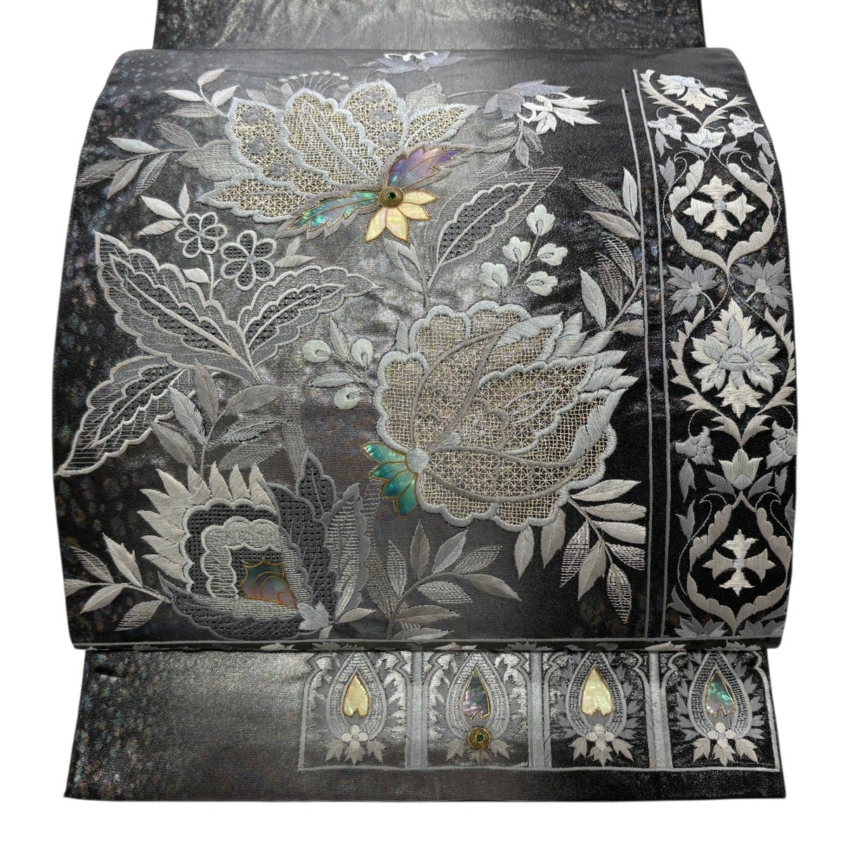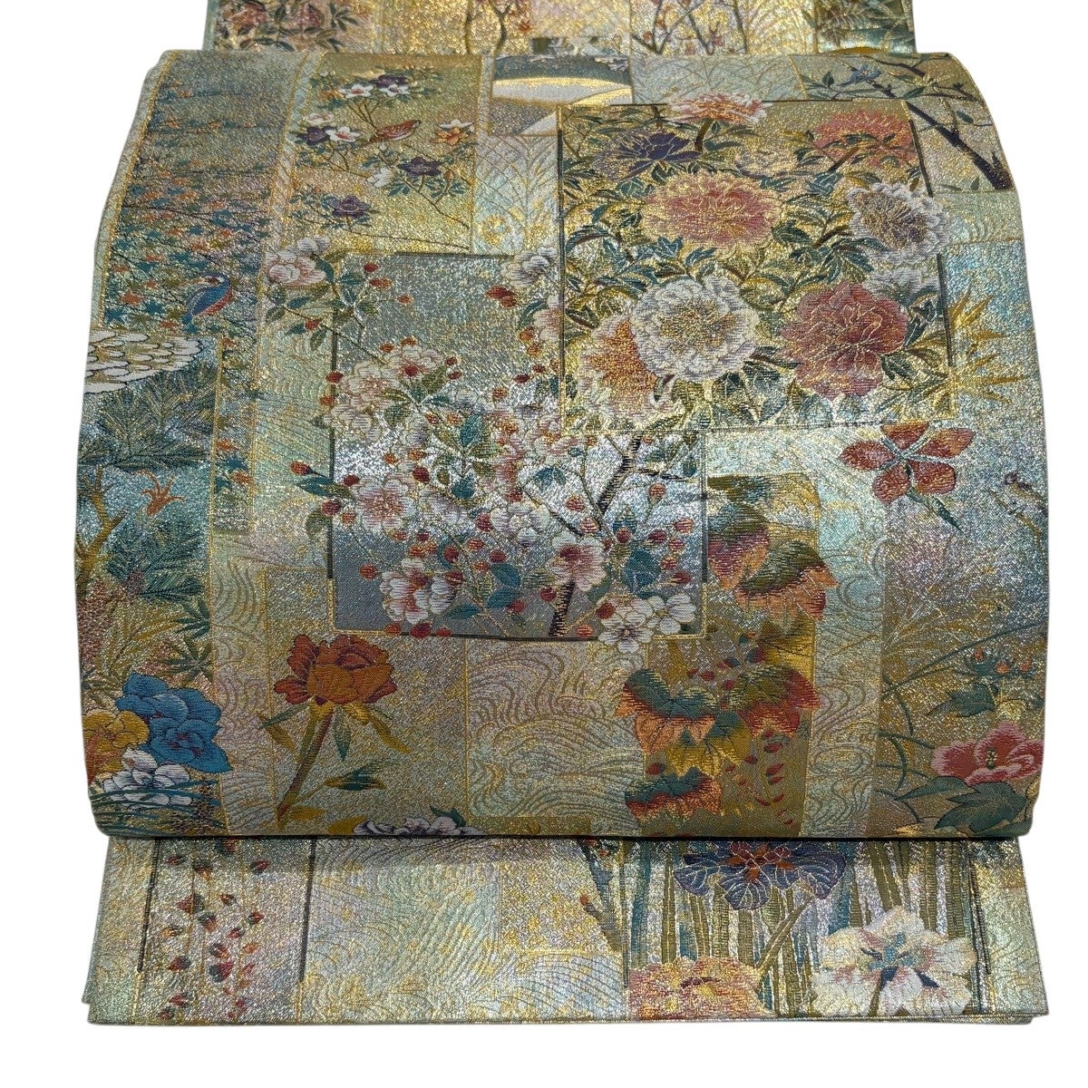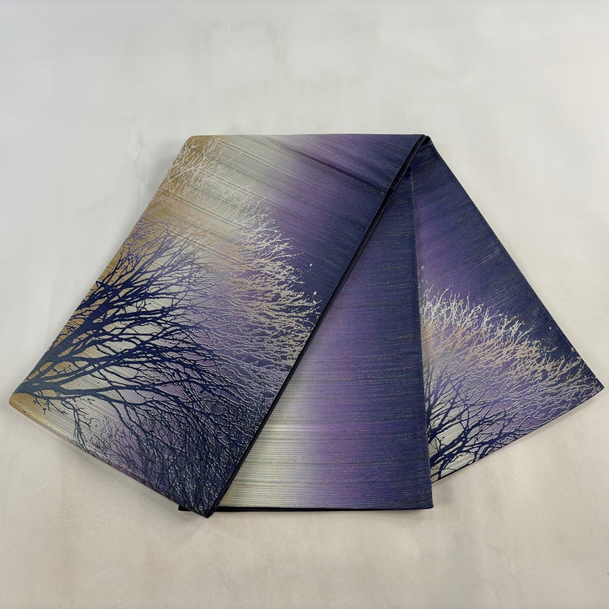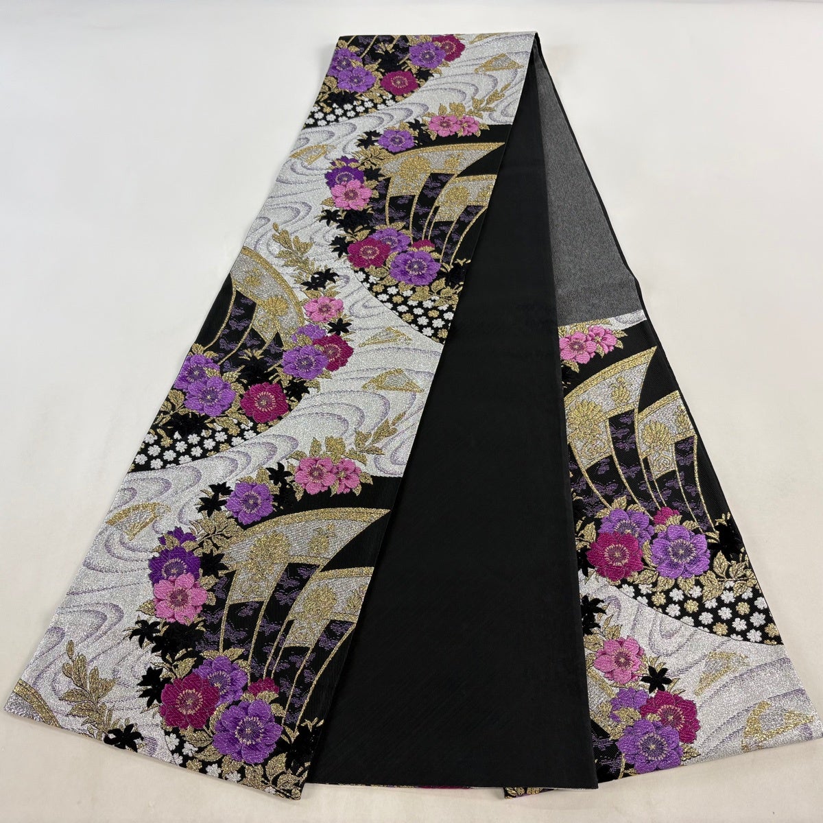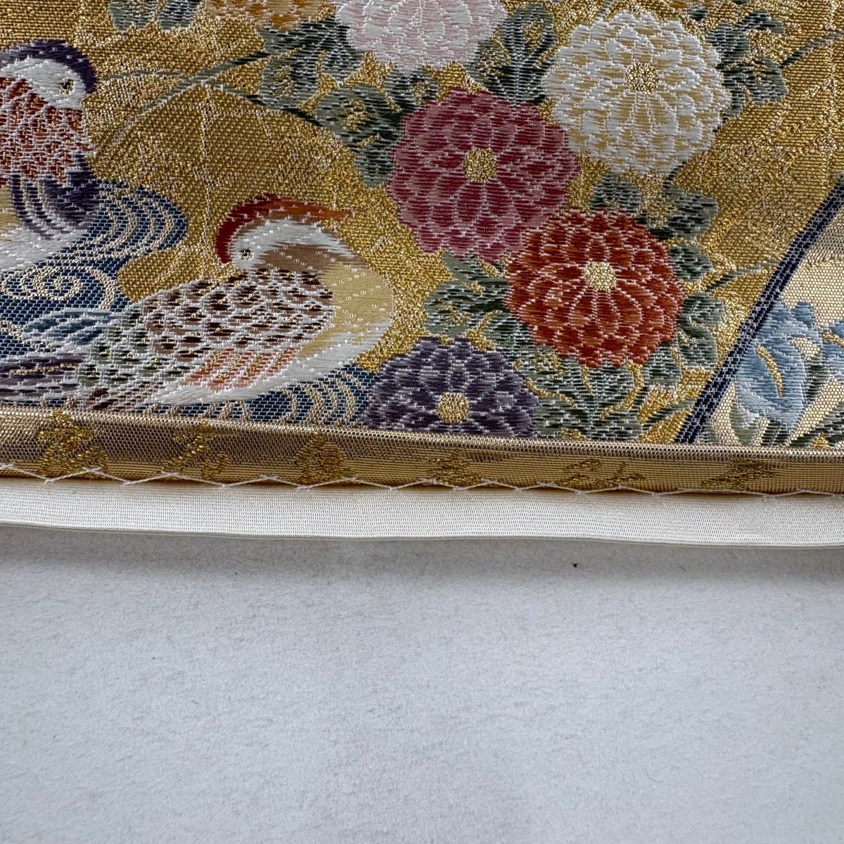 袋帯とは女性用の主にフォーマル用の帯で第一礼装として着用されることが多く、形状は表地にのみ柄があり裏地は無地になるように袋状に織って作成されたため袋帯という名が付きました。 帯を締める際にはおめでたいことが重なりますようにという願いが込められている二重太鼓や成人式の際に振袖に見かけるふくら雀や文庫結びなどの変わり結びを用いて着用します。