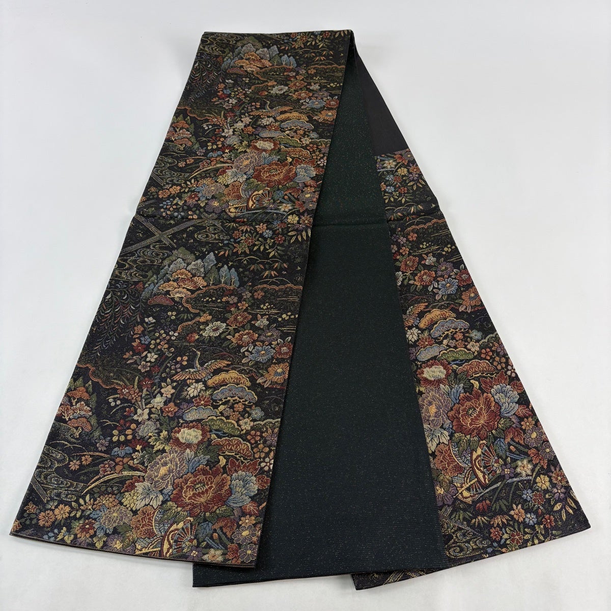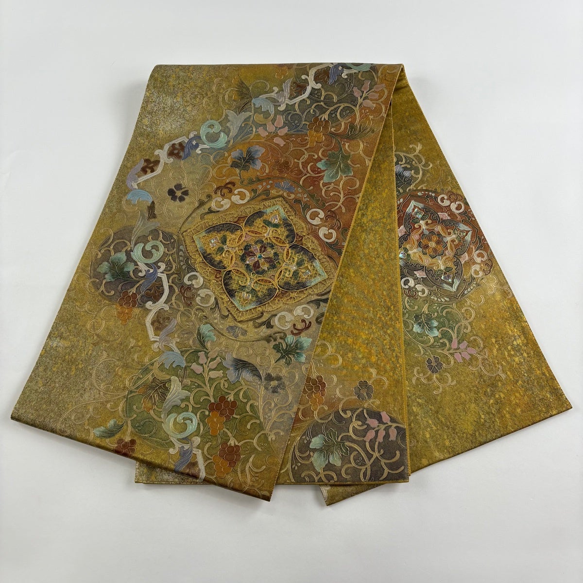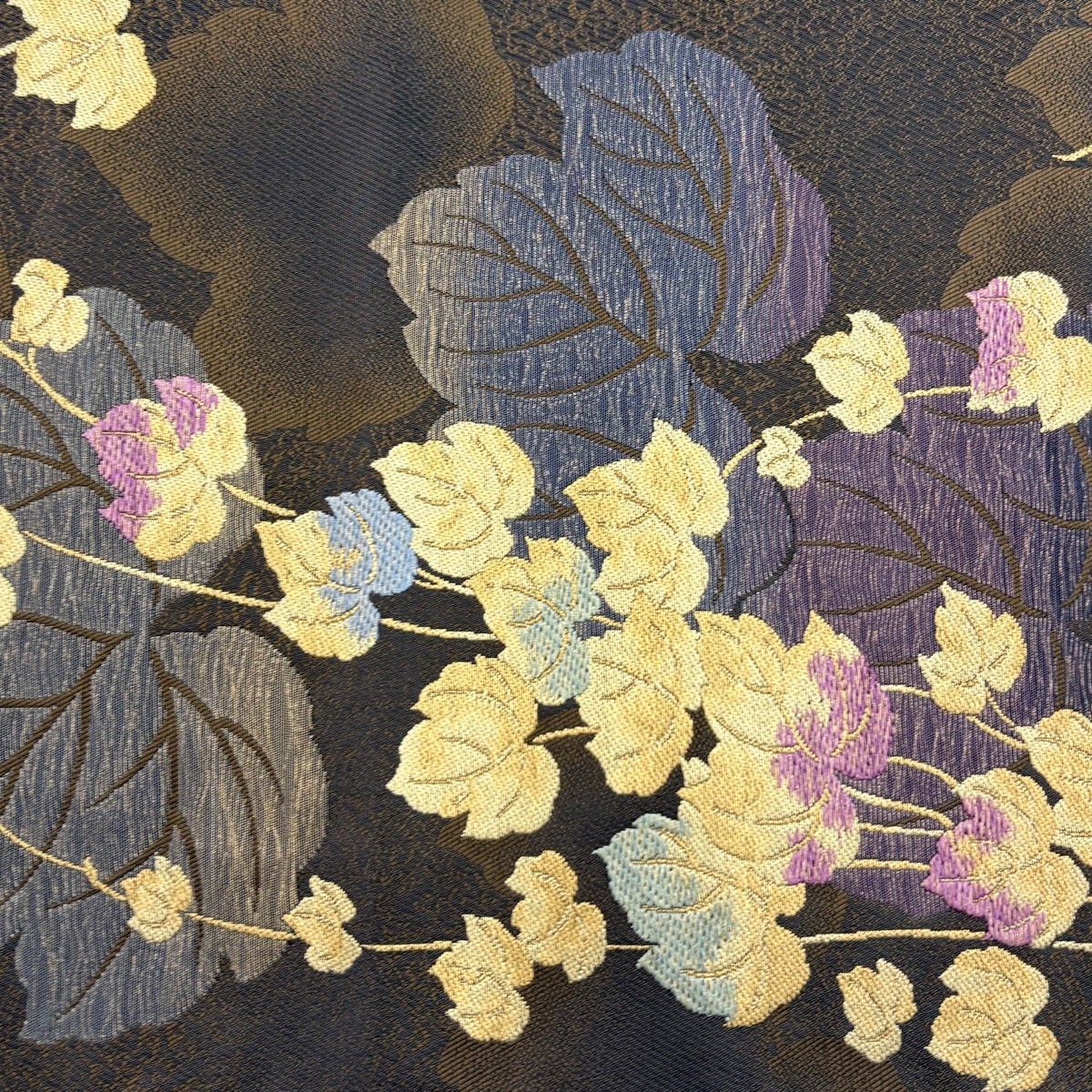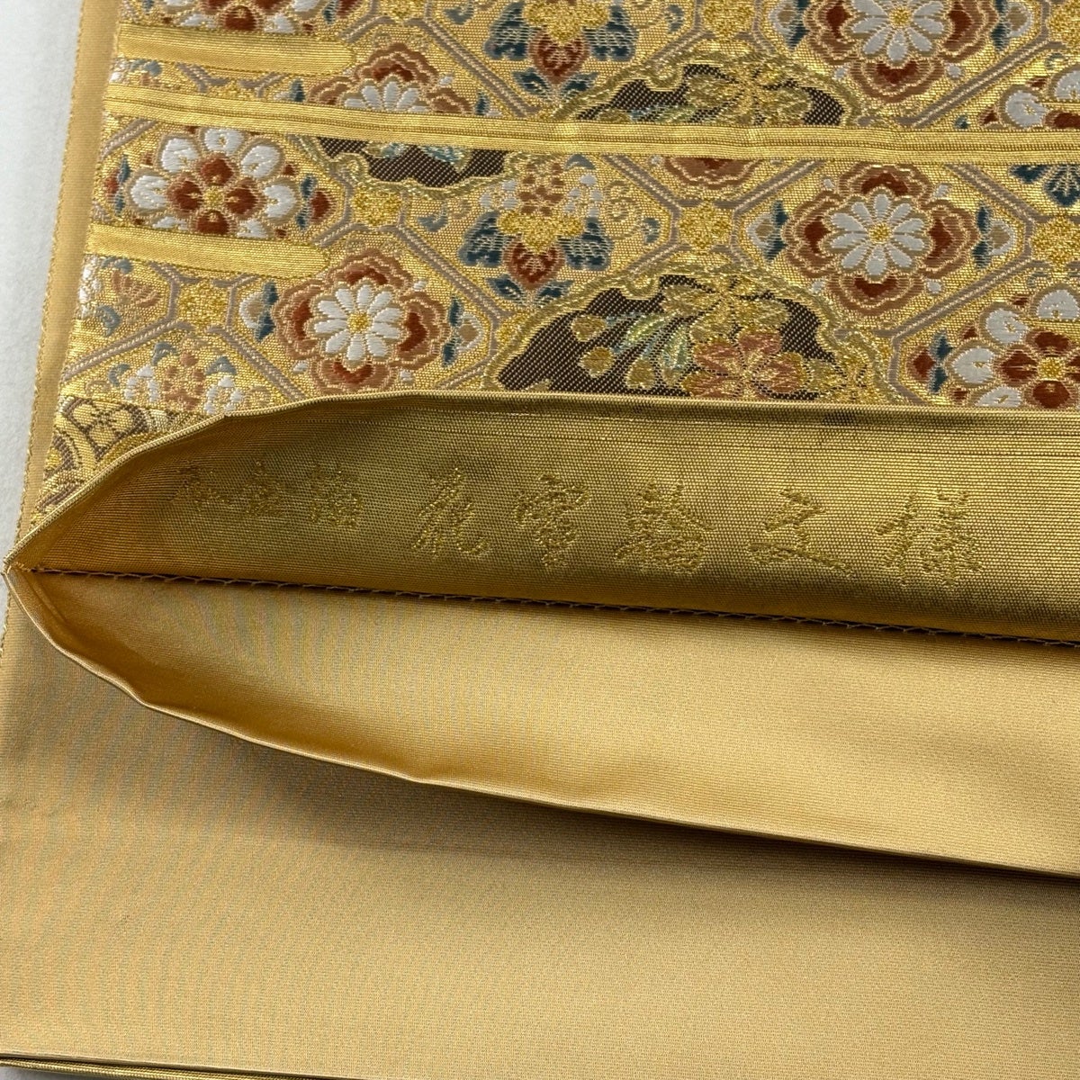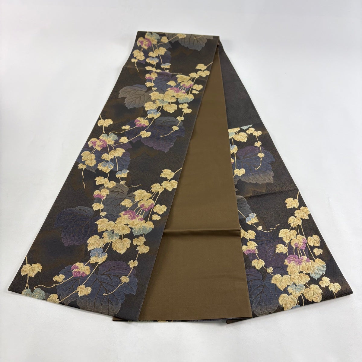 他の画像を見る 20%OFF 【美品】 袋帯 逸品 じゅらく 落款あり 帝王紫 慶華彩映文 華文 花唐草 金糸 箔 焦茶色 お太鼓柄 正絹 K30 当店通常価格 ¥ 37,800 ¥ 30,240 税込 在庫切れ