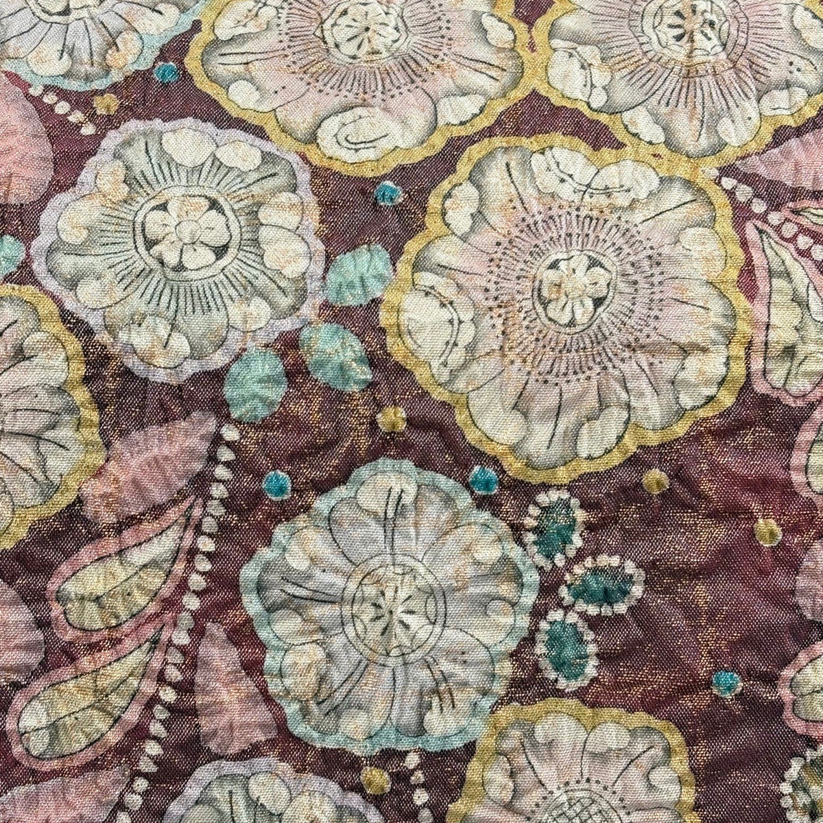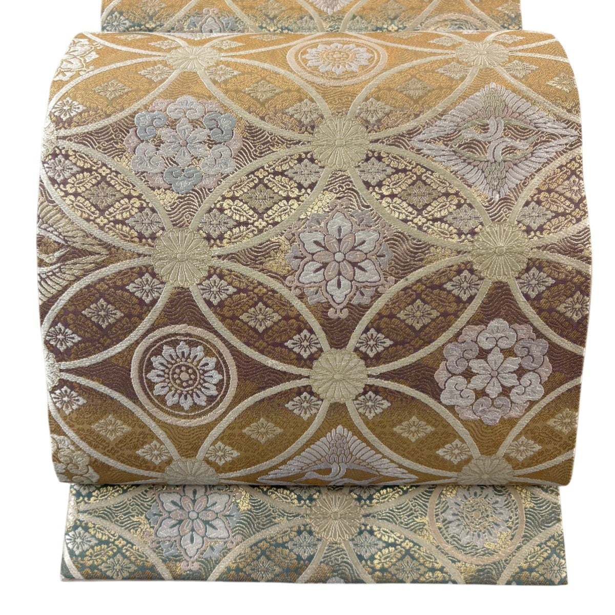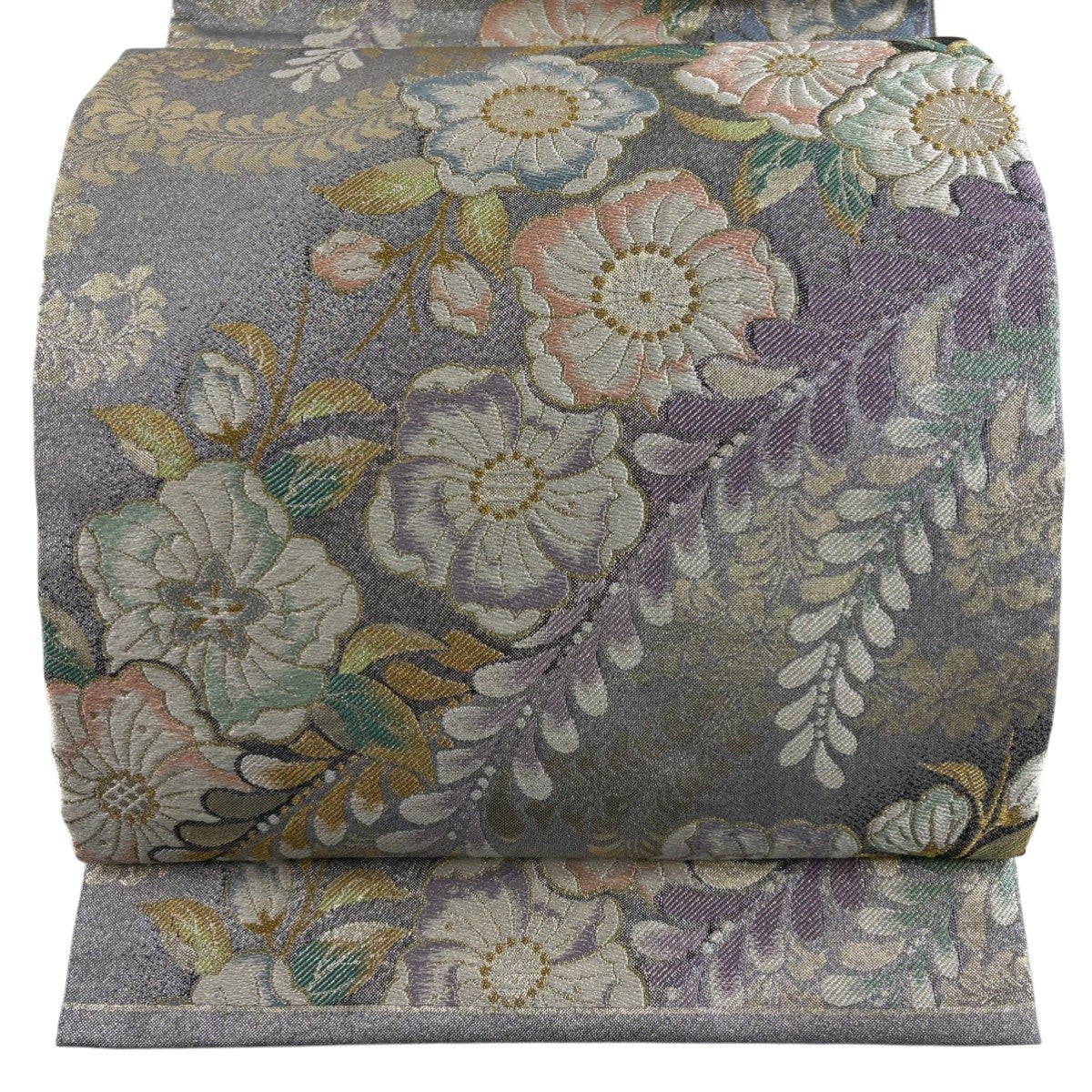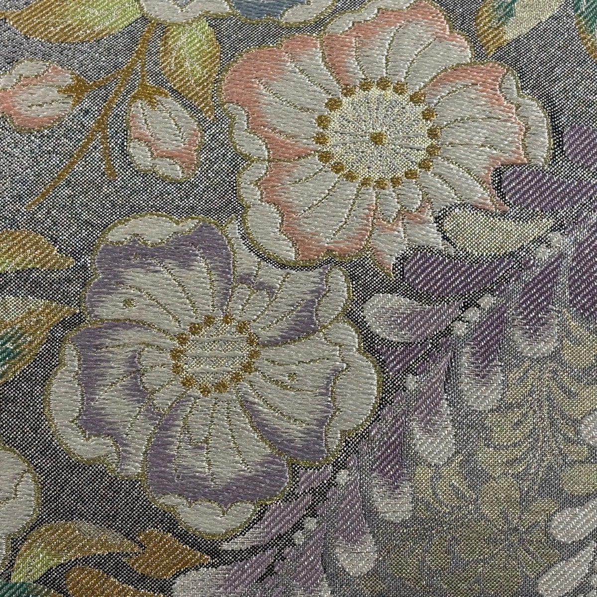 袋帯とは女性用の主にフォーマル用の帯で第一礼装として着用されることが多く、形状は表地にのみ柄があり裏地は無地になるように袋状に織って作成されたため袋帯という名が付きました。 帯を締める際にはおめでたいことが重なりますようにという願いが込められている二重太鼓や成人式の際に振袖に見かけるふくら雀や文庫結びなどの変わり結びを用いて着用します。