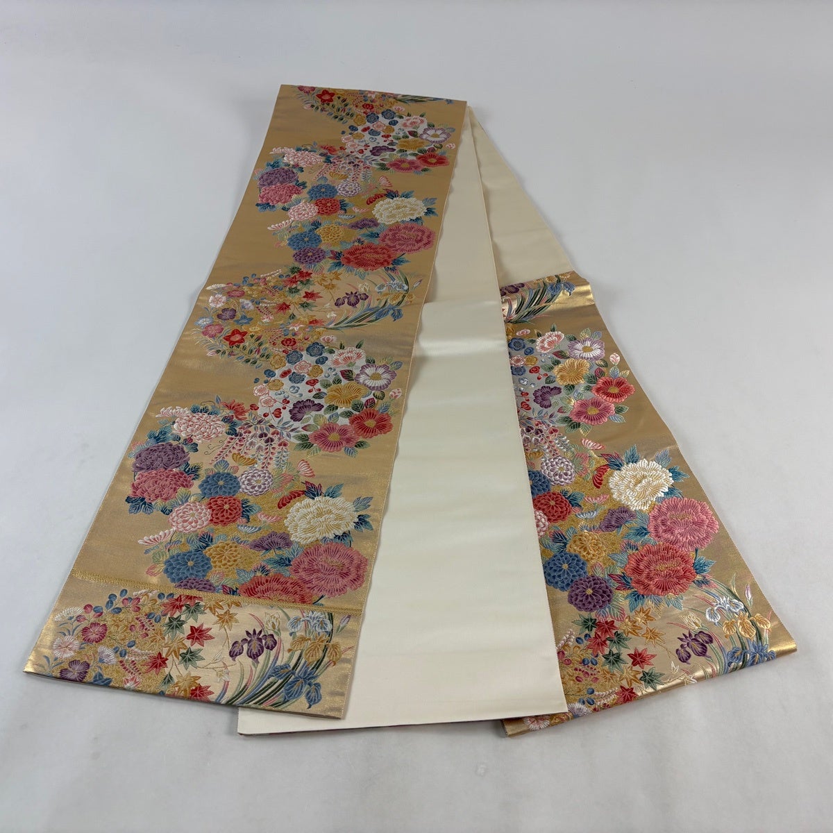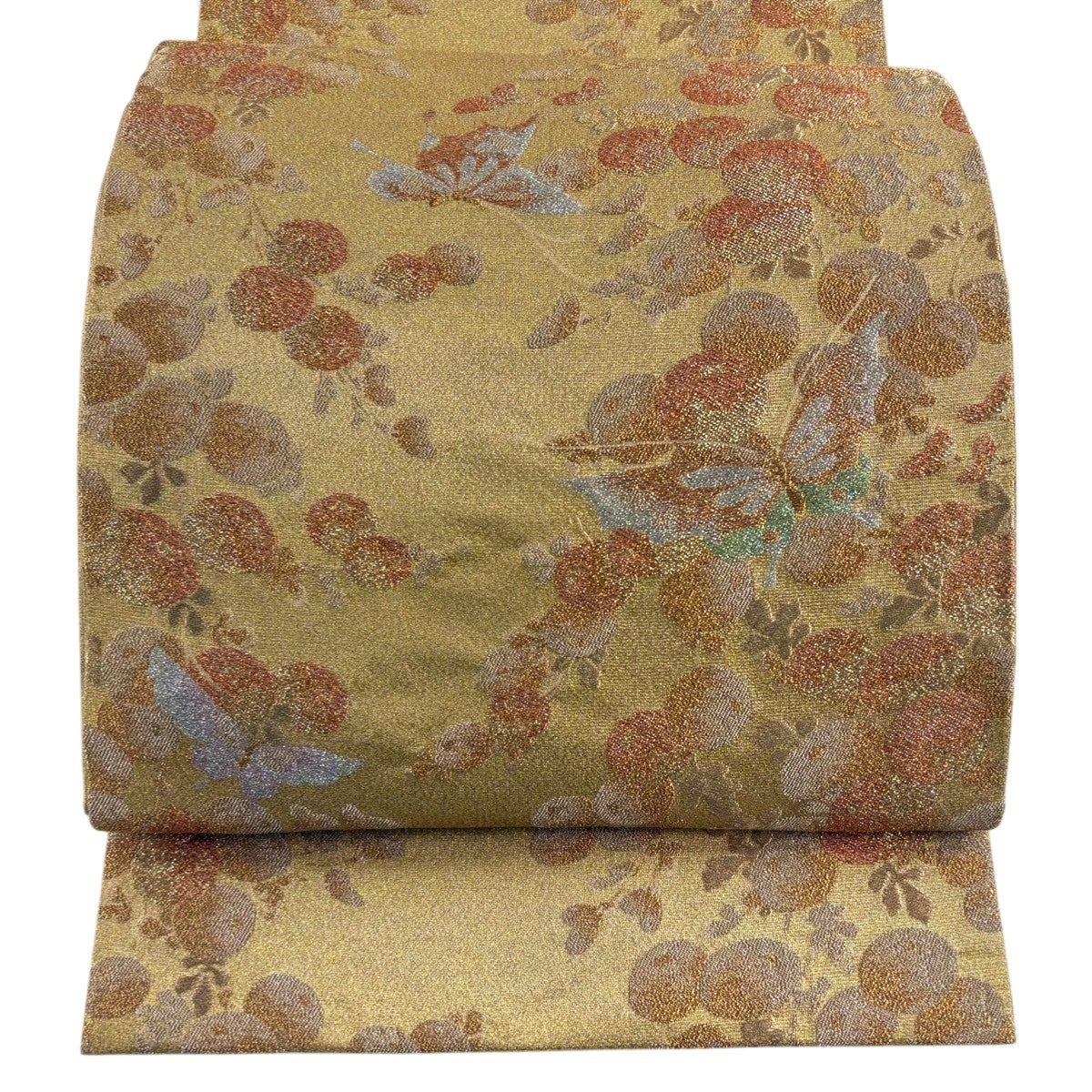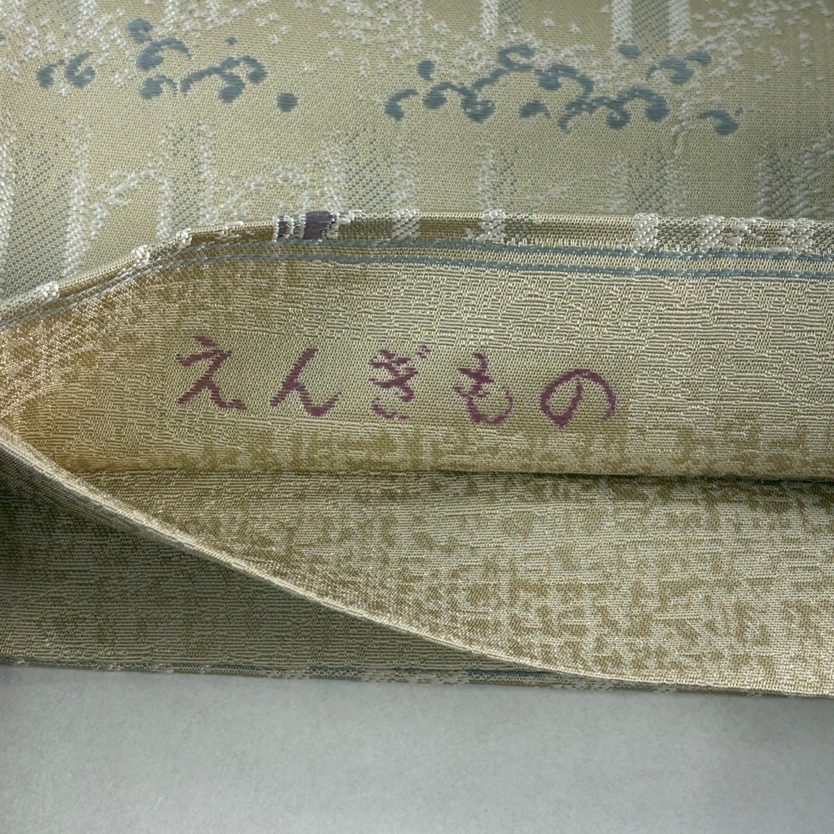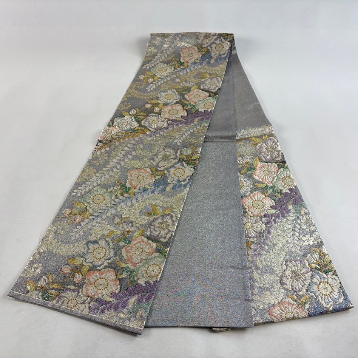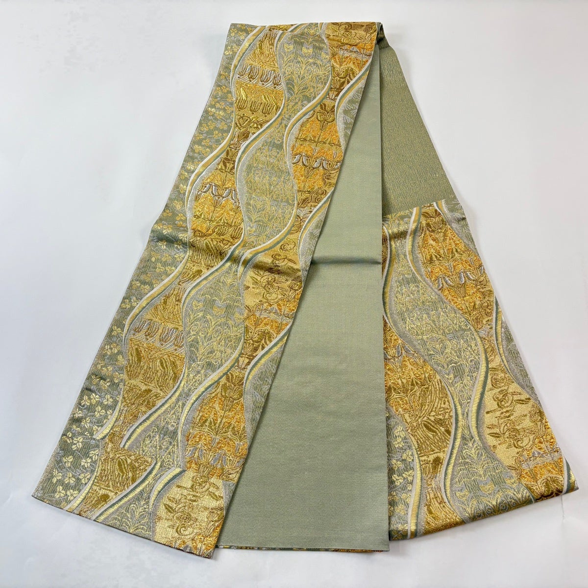 袋帯とは女性用の主にフォーマル用の帯で第一礼装として着用されることが多く、形状は表地にのみ柄があり裏地は無地になるように袋状に織って作成されたため袋帯という名が付きました。 帯を締める際にはおめでたいことが重なりますようにという願いが込められている二重太鼓や成人式の際に振袖に見かけるふくら雀や文庫結びなどの変わり結びを用いて着用します。