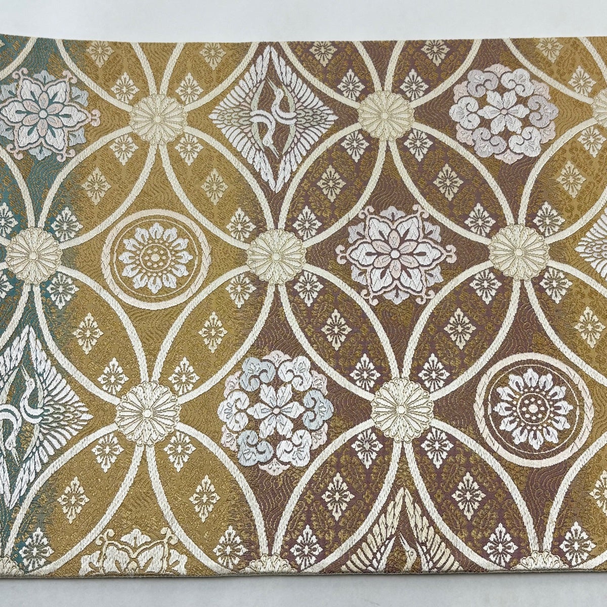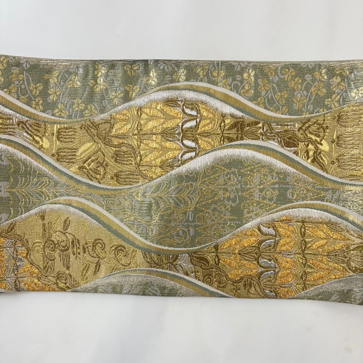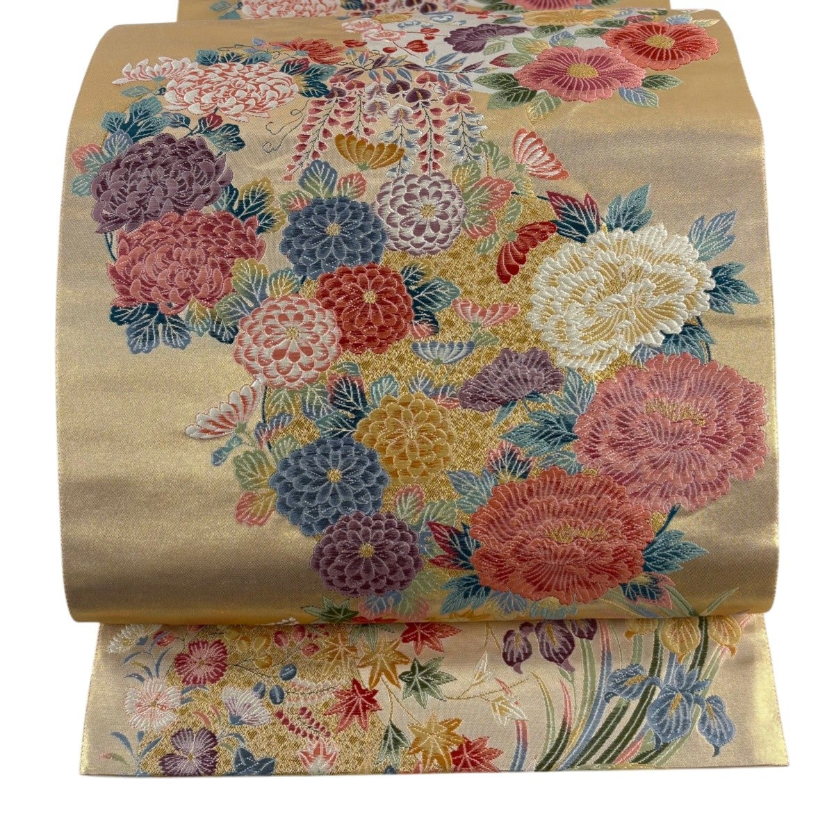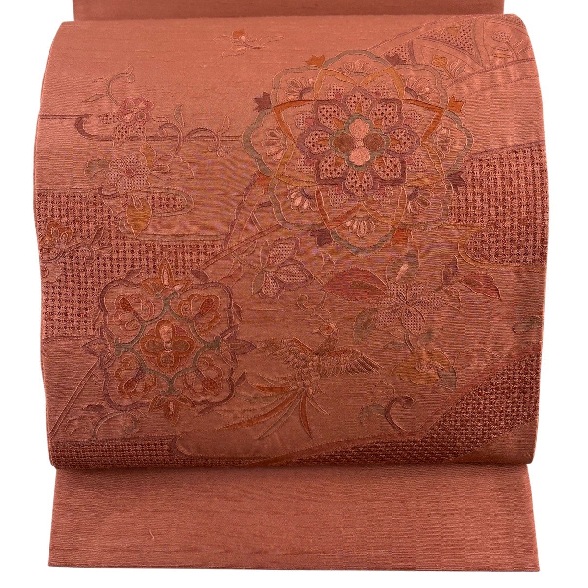 袋帯とは女性用の主にフォーマル用の帯で第一礼装として着用されることが多く、形状は表地にのみ柄があり裏地は無地になるように袋状に織って作成されたため袋帯という名が付きました。 帯を締める際にはおめでたいことが重なりますようにという願いが込められている二重太鼓や成人式の際に振袖に見かけるふくら雀や文庫結びなどの変わり結びを用いて着用します。