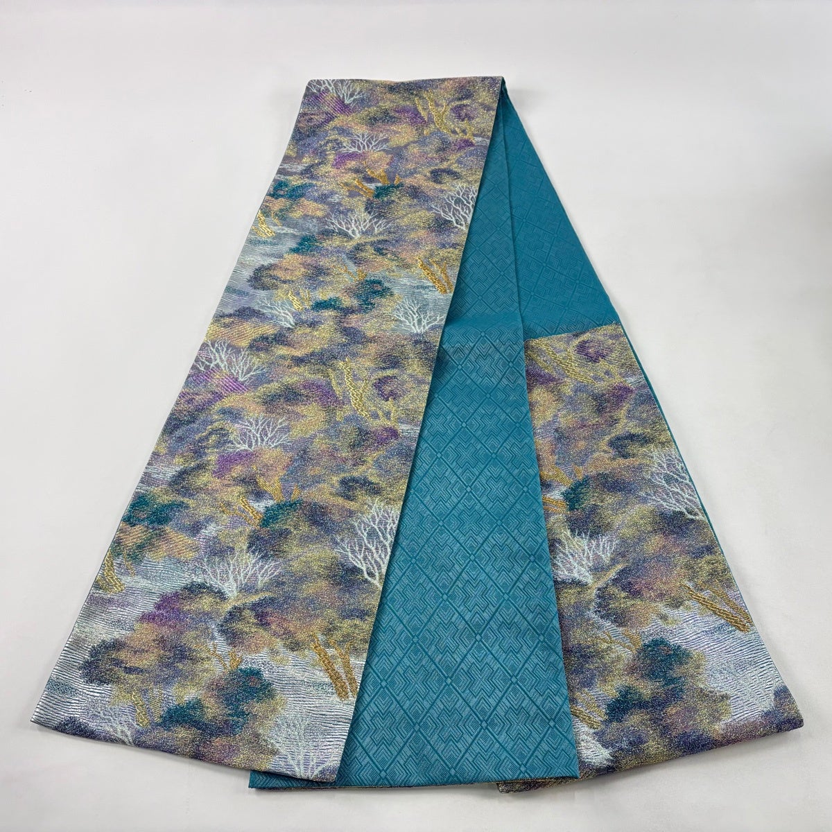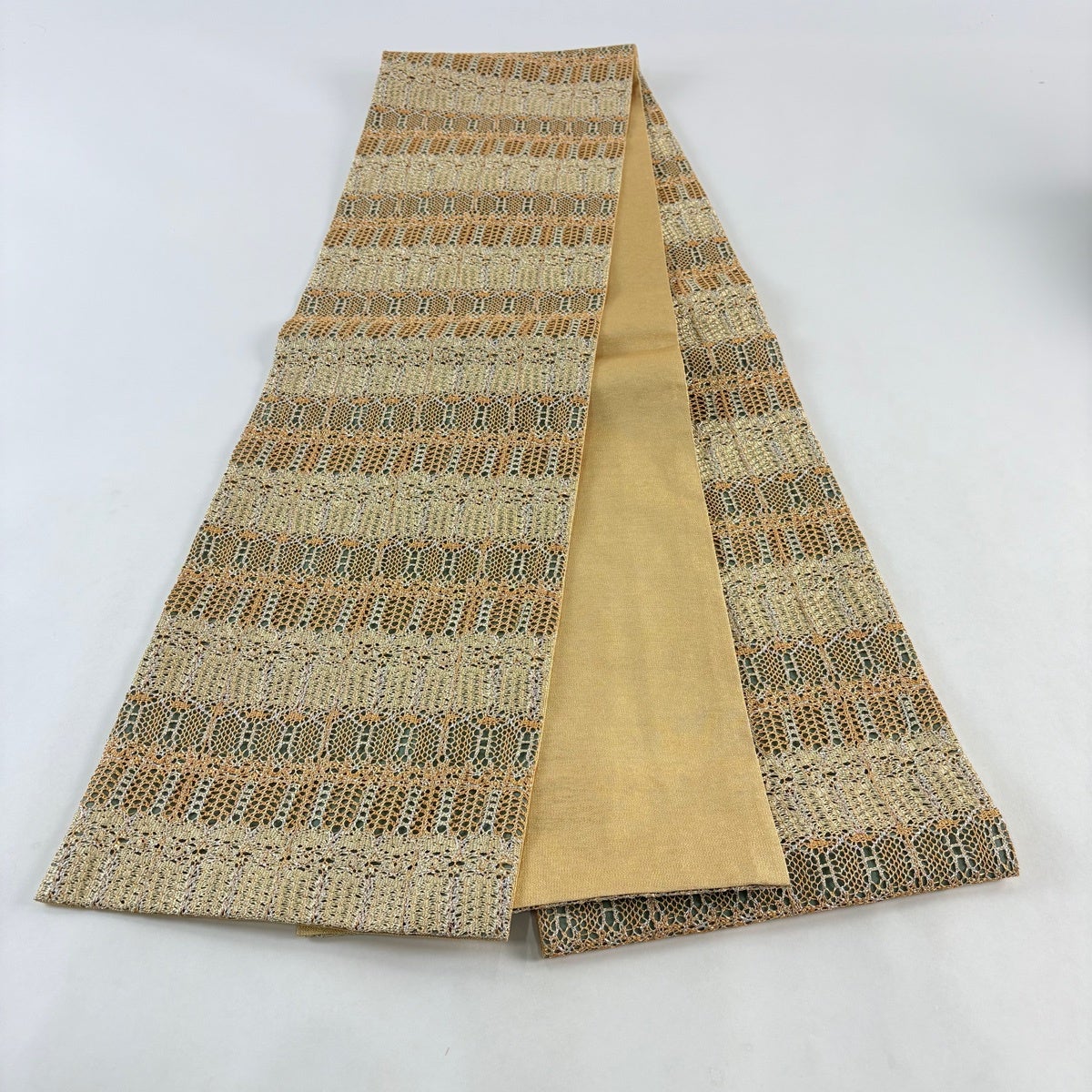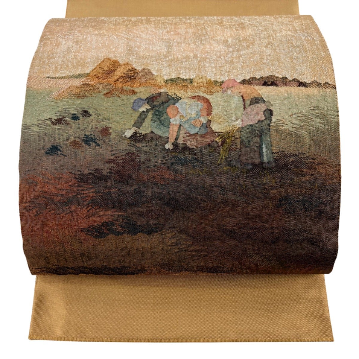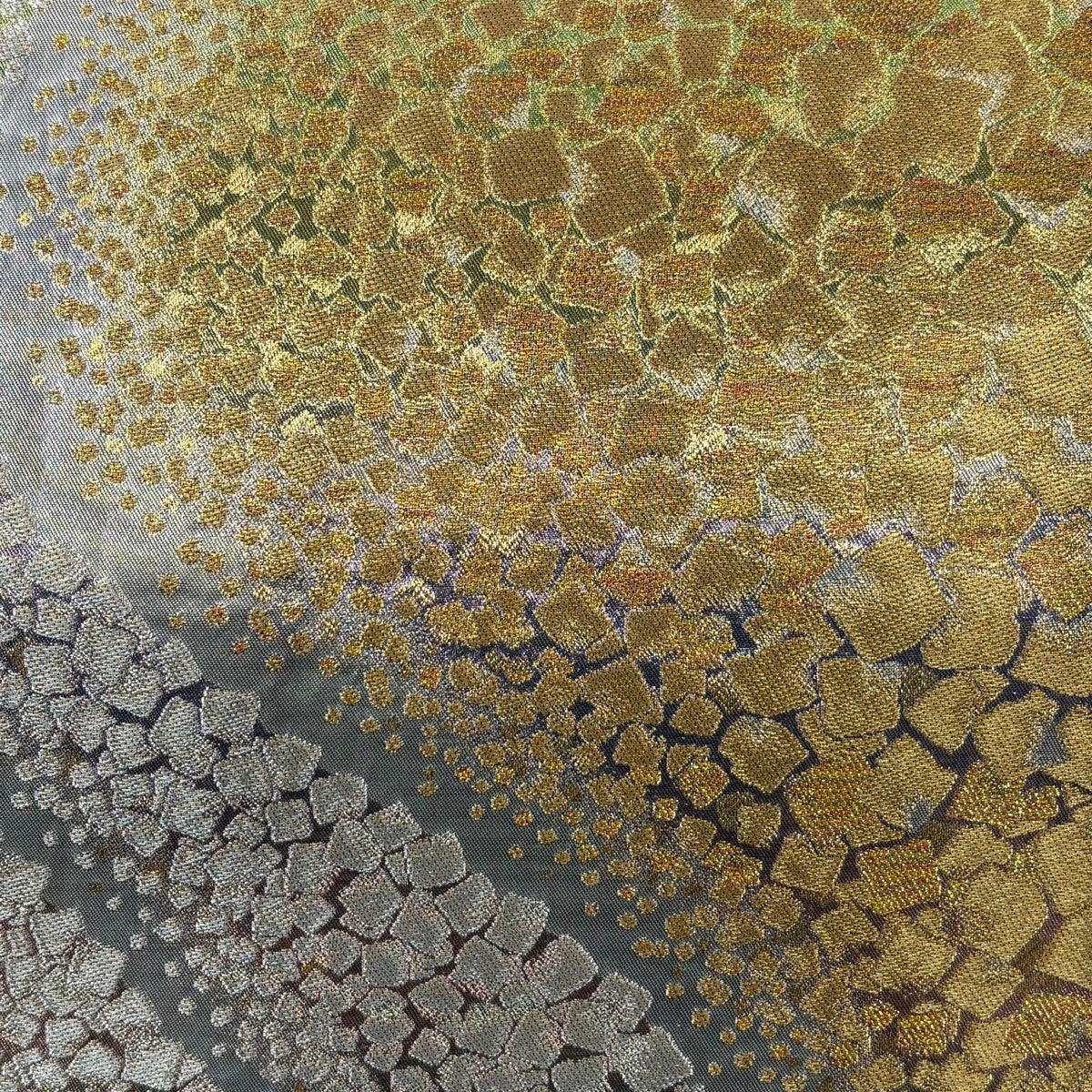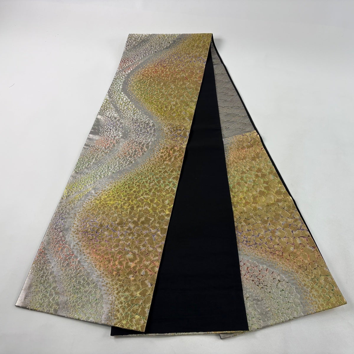 袋帯とは女性用の主にフォーマル用の帯で第一礼装として着用されることが多く、形状は表地にのみ柄があり裏地は無地になるように袋状に織って作成されたため袋帯という名が付きました。 帯を締める際にはおめでたいことが重なりますようにという願いが込められている二重太鼓や成人式の際に振袖に見かけるふくら雀や文庫結びなどの変わり結びを用いて着用します。