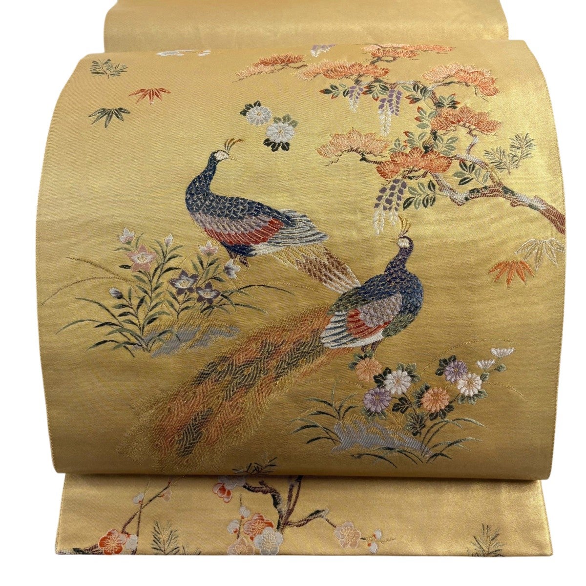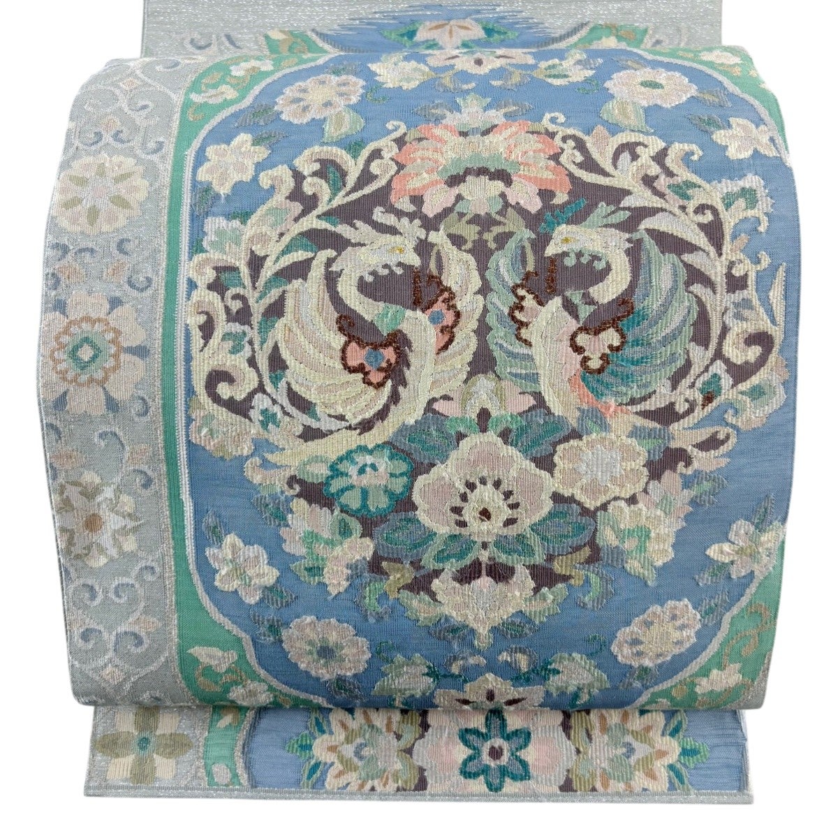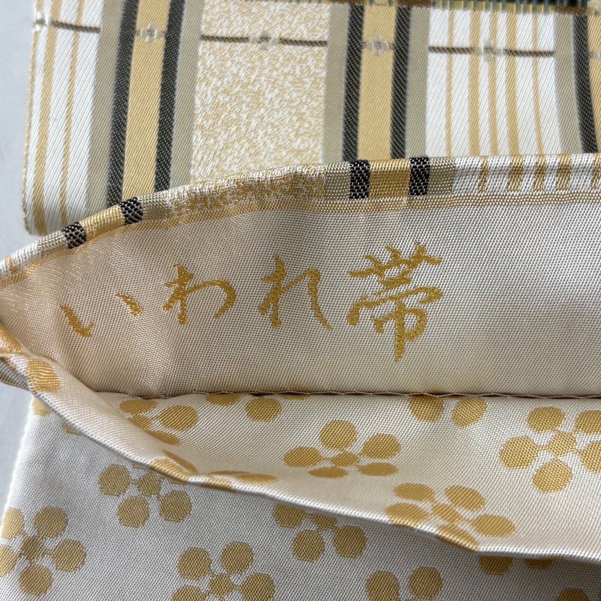 袋帯とは女性用の主にフォーマル用の帯で第一礼装として着用されることが多く、形状は表地にのみ柄があり裏地は無地になるように袋状に織って作成されたため袋帯という名が付きました。 帯を締める際にはおめでたいことが重なりますようにという願いが込められている二重太鼓や成人式の際に振袖に見かけるふくら雀や文庫結びなどの変わり結びを用いて着用します。