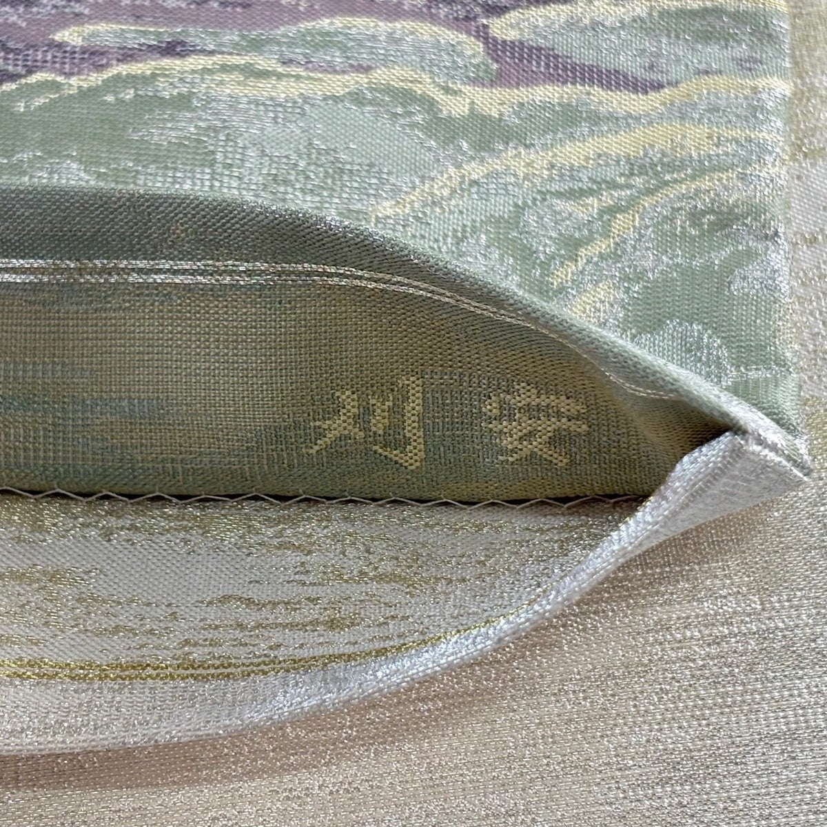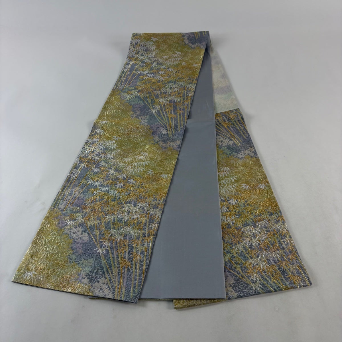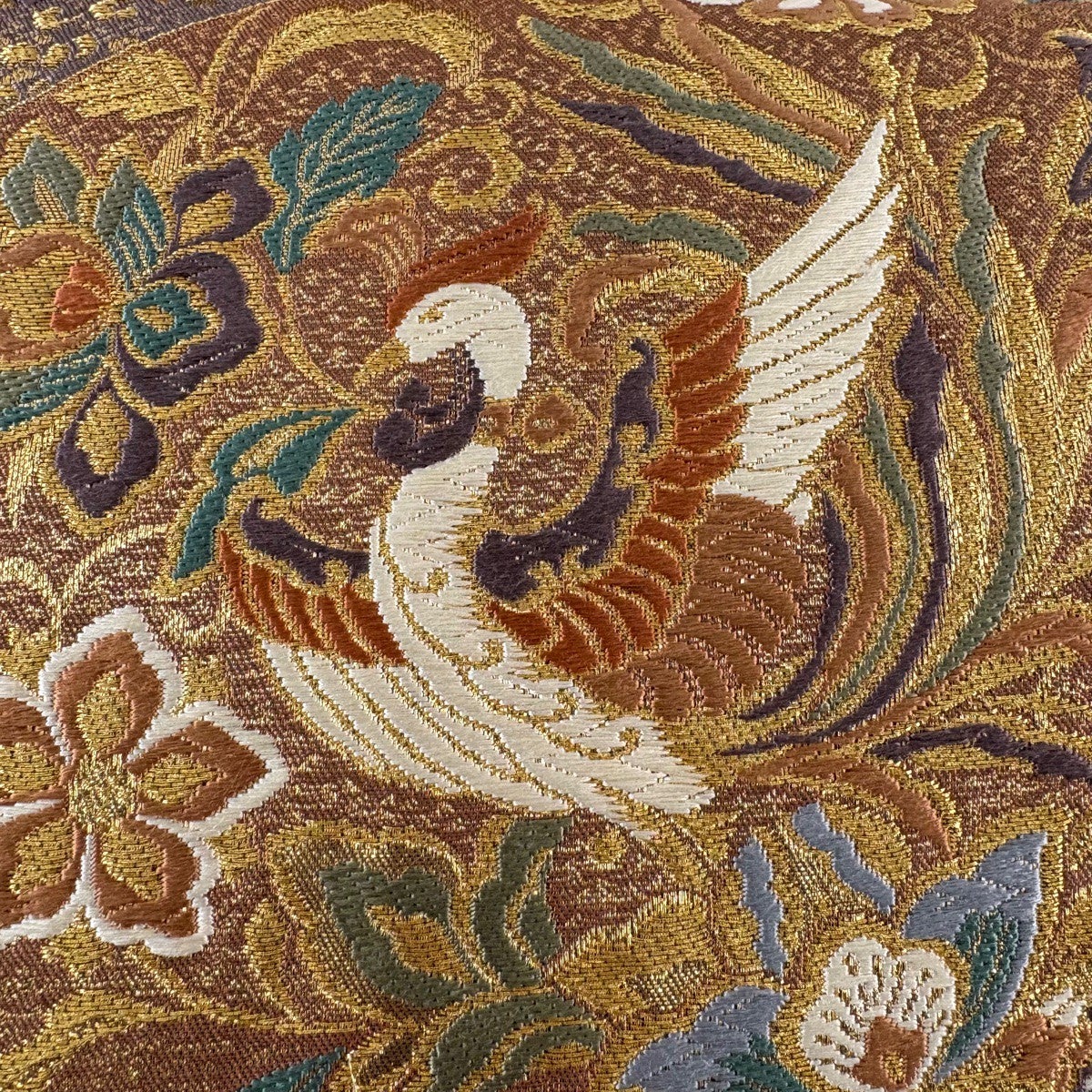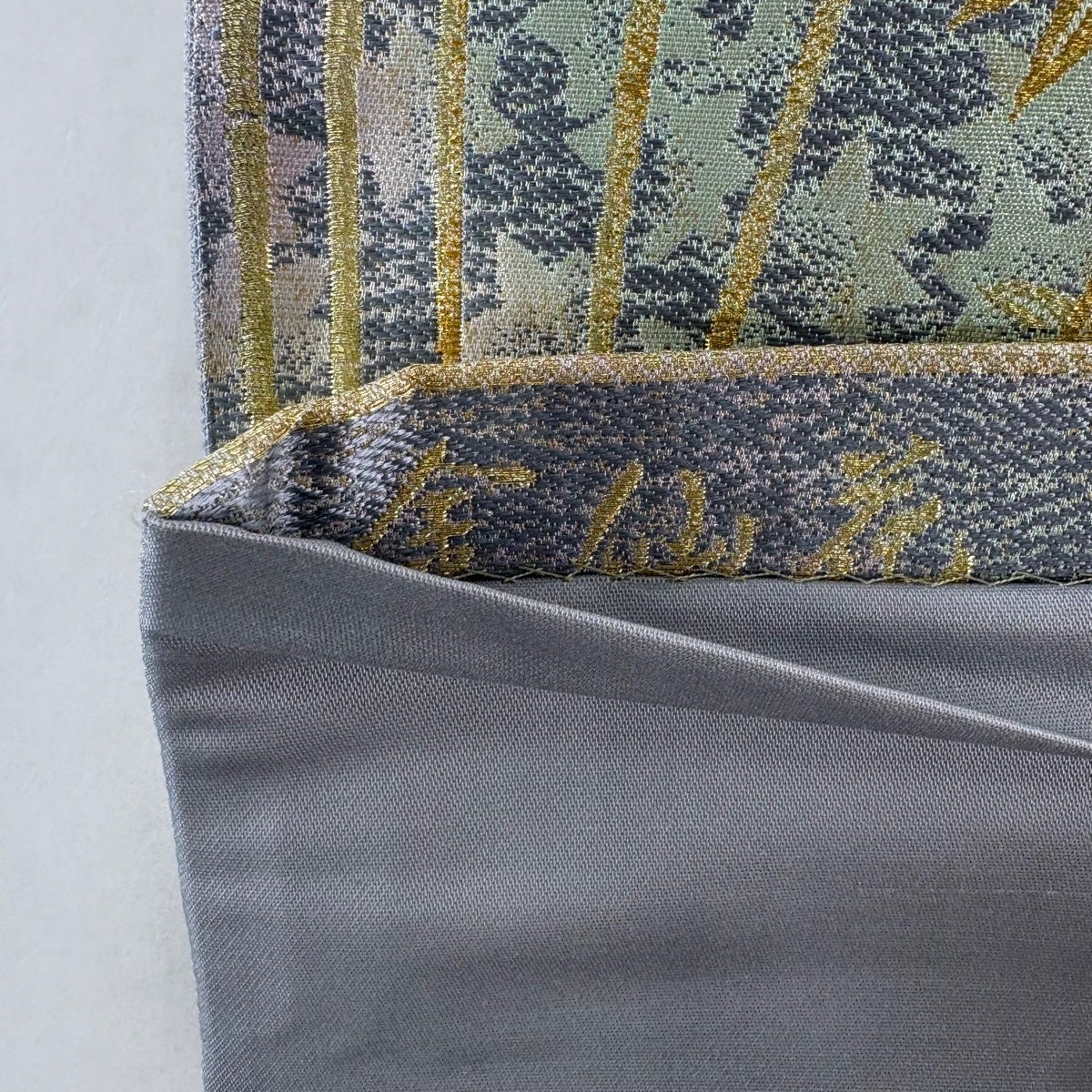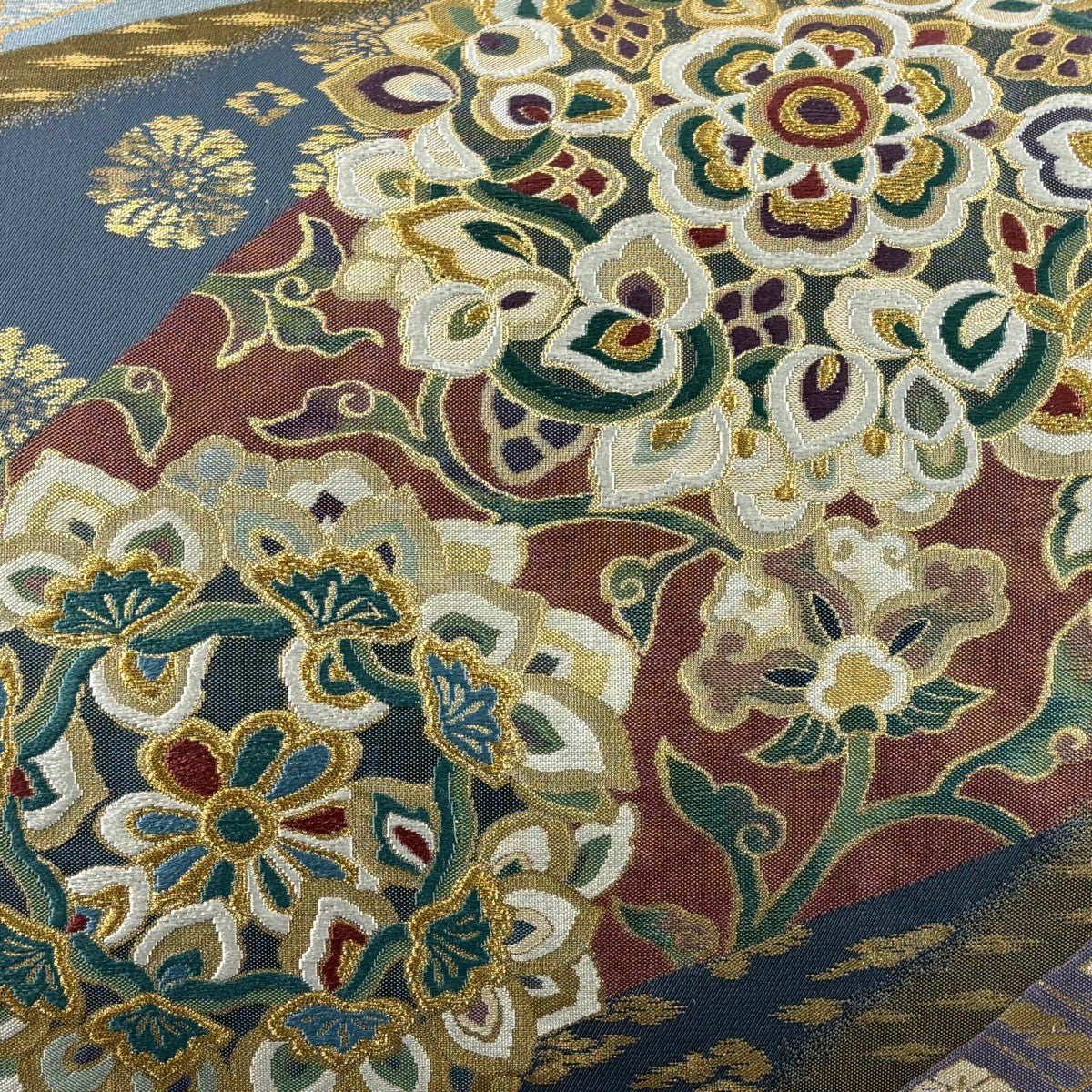 袋帯とは女性用の主にフォーマル用の帯で第一礼装として着用されることが多く、形状は表地にのみ柄があり裏地は無地になるように袋状に織って作成されたため袋帯という名が付きました。 帯を締める際にはおめでたいことが重なりますようにという願いが込められている二重太鼓や成人式の際に振袖に見かけるふくら雀や文庫結びなどの変わり結びを用いて着用します。